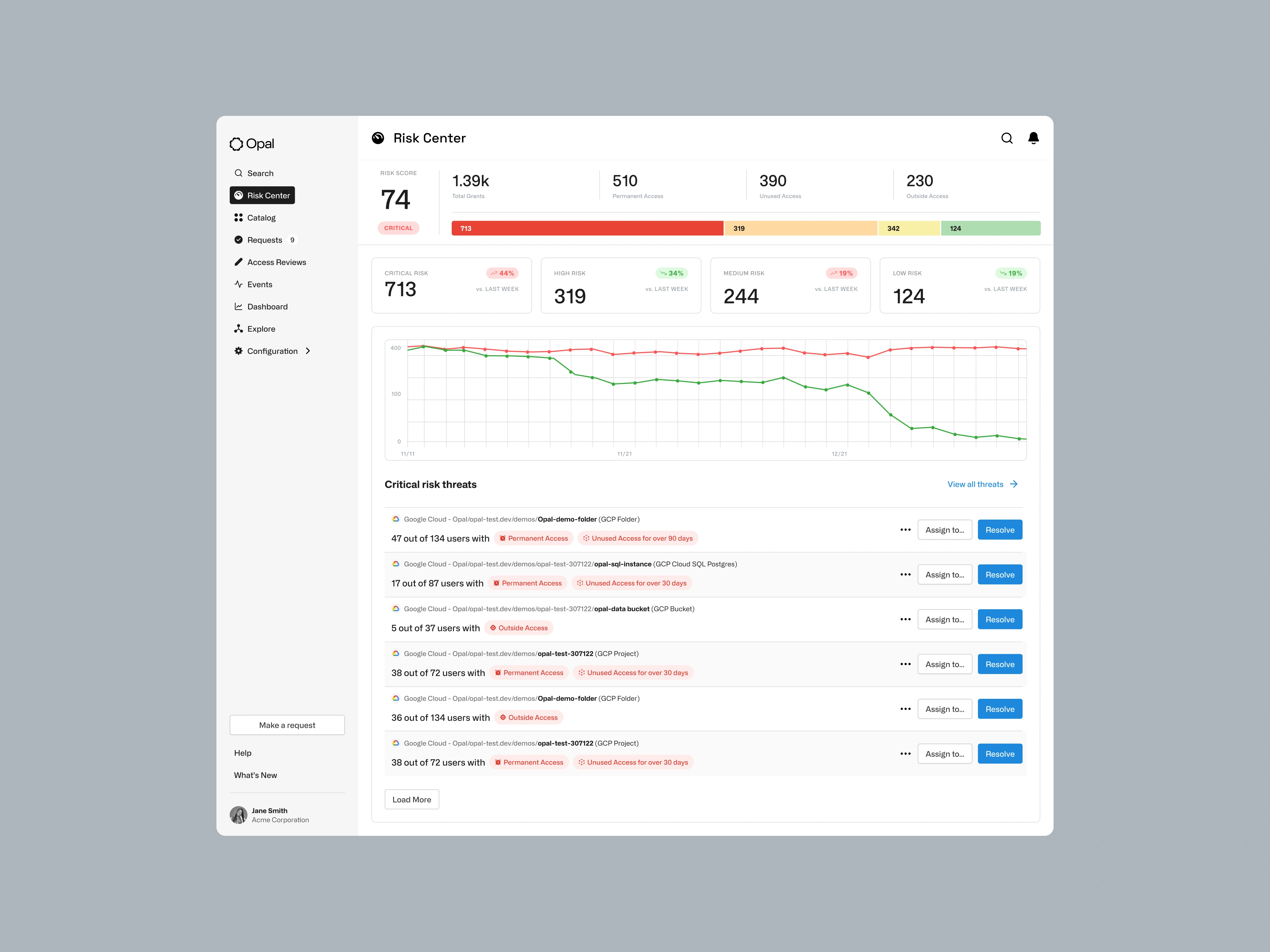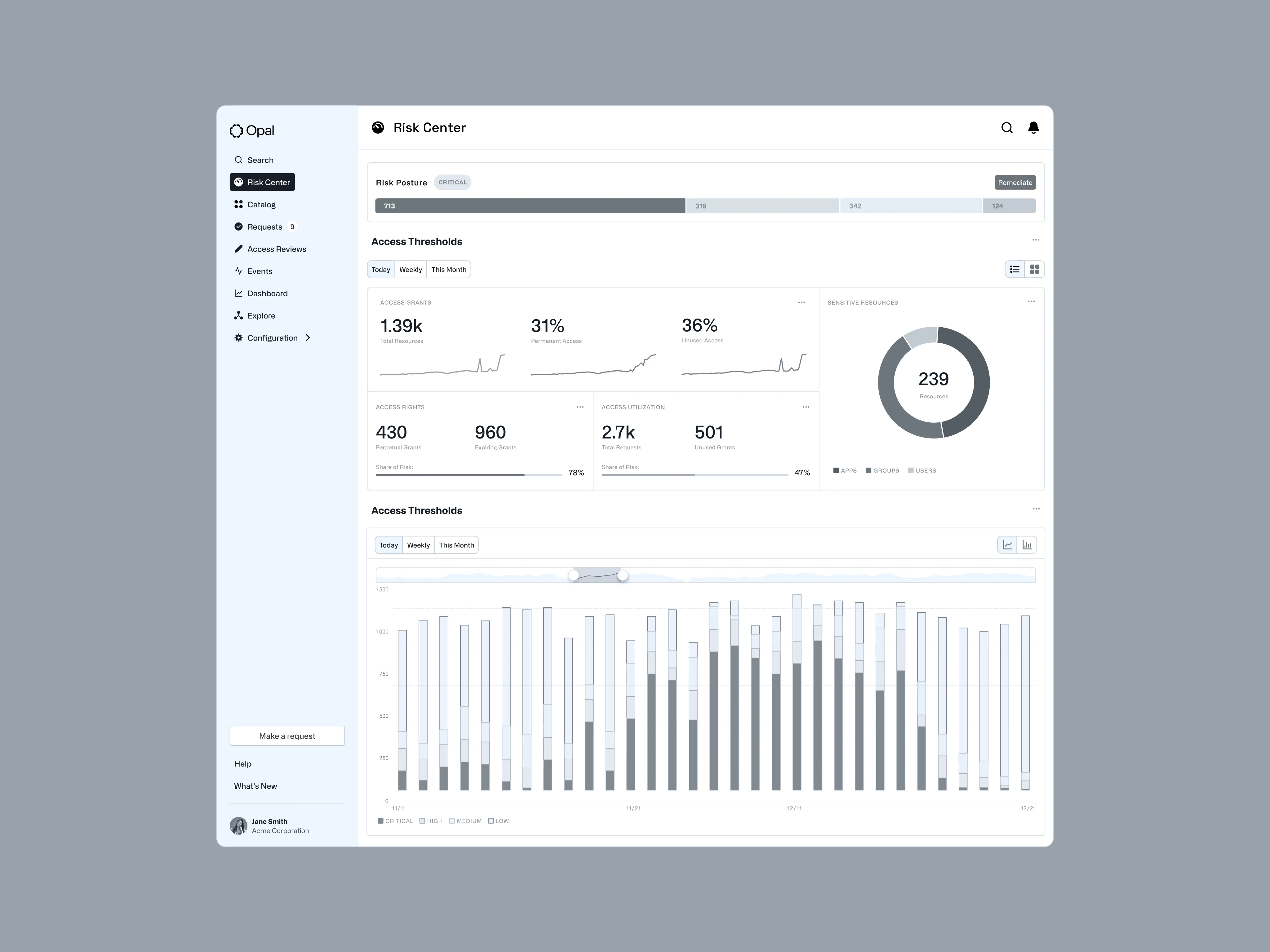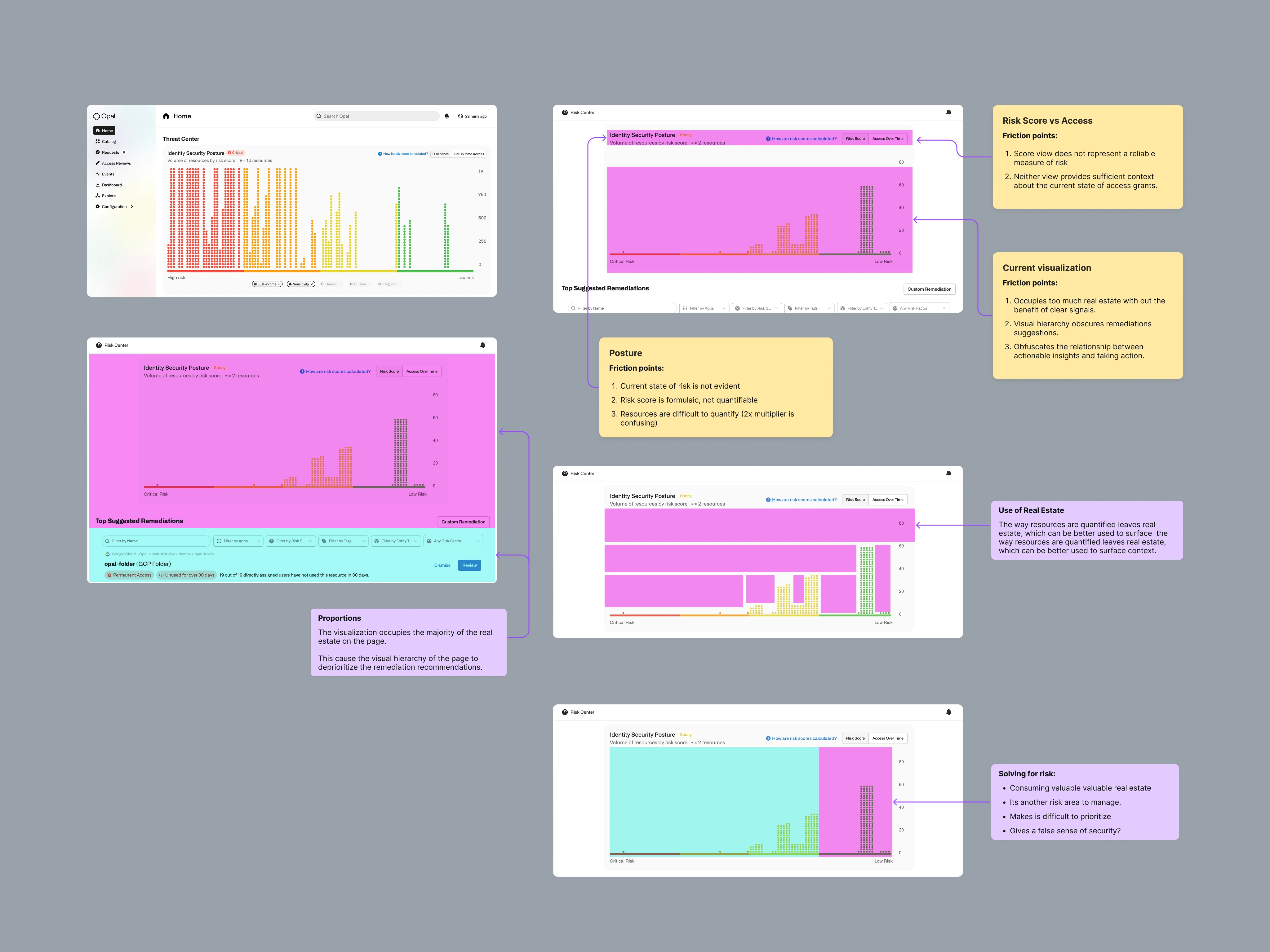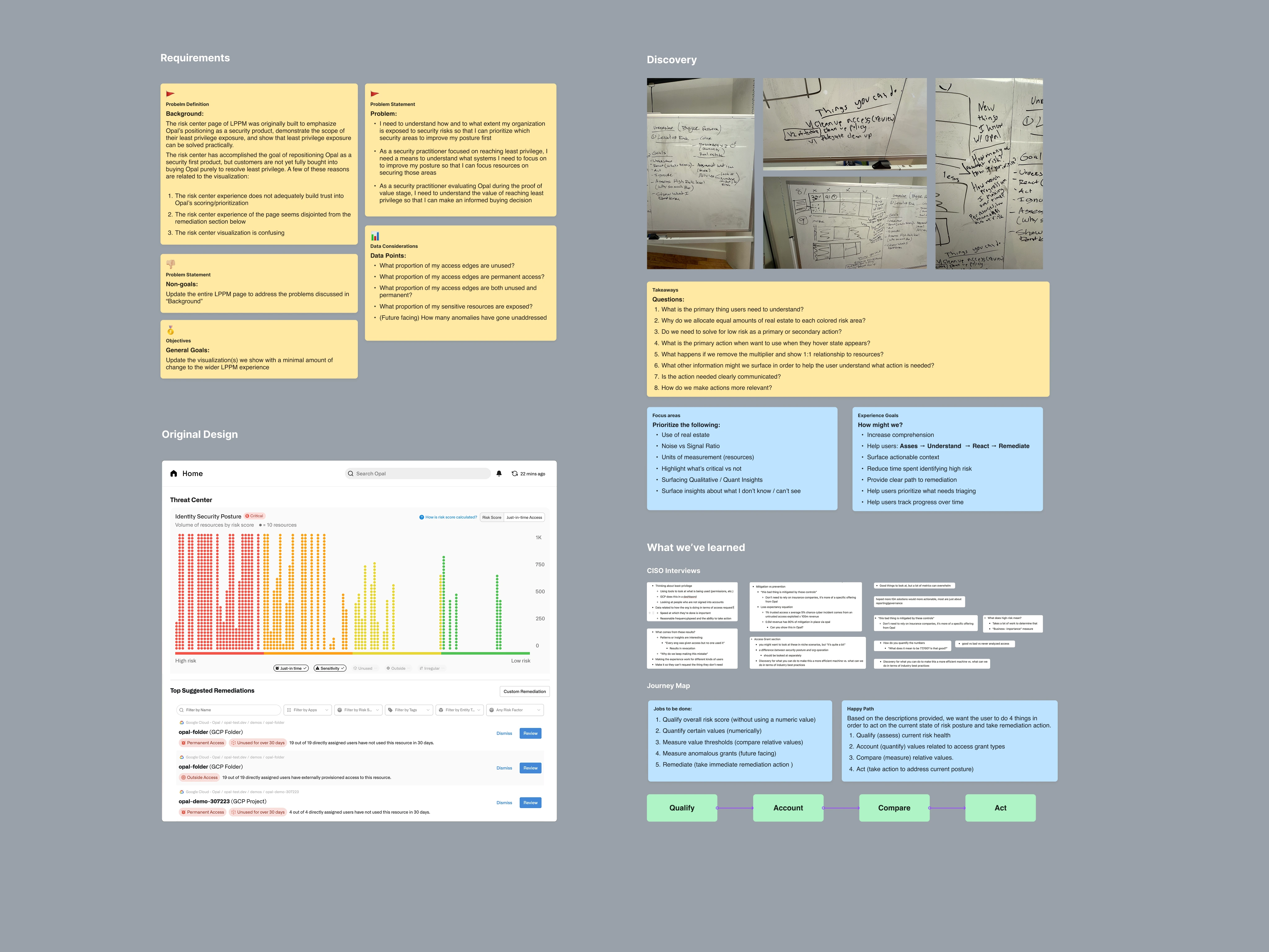 Opal the Risk Center, from scratch to make important signals clear, actionable, and more trustworthy. The project began with a deep dive into the existing product's flaws and the users' needs. We analyzed the original design, conducted CISO interviews, held whiteboard sessions, and created a user journey map to define the core problems and requirements.