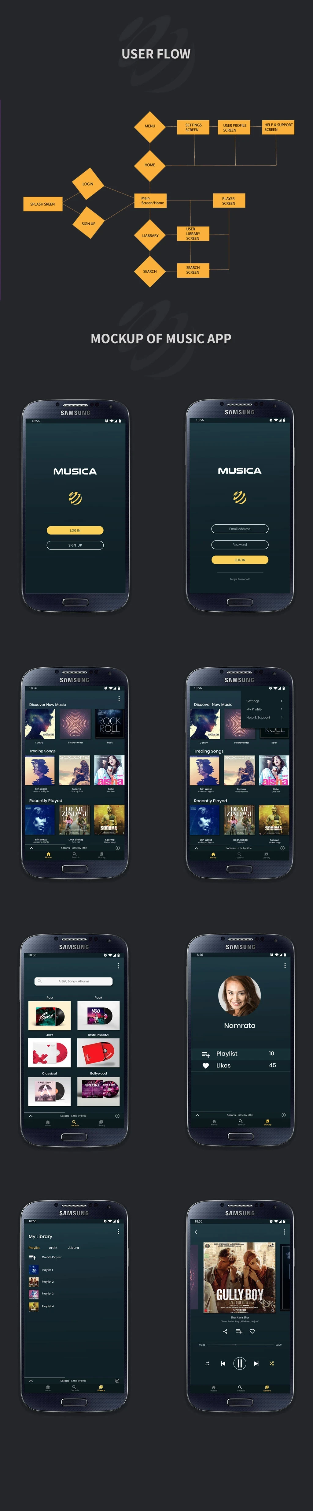 Use Adobe XD. It's an Android based Music streaming Application.