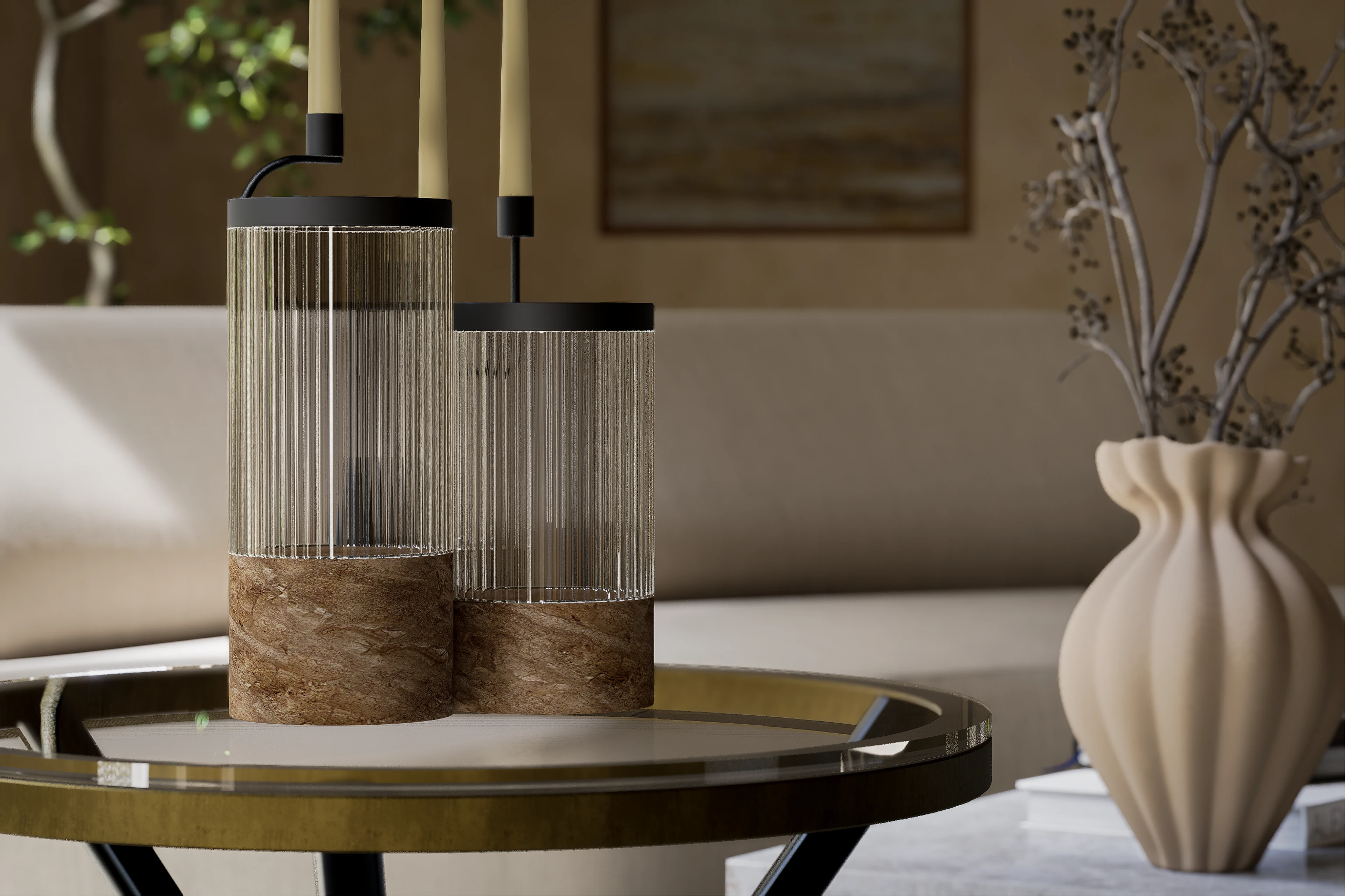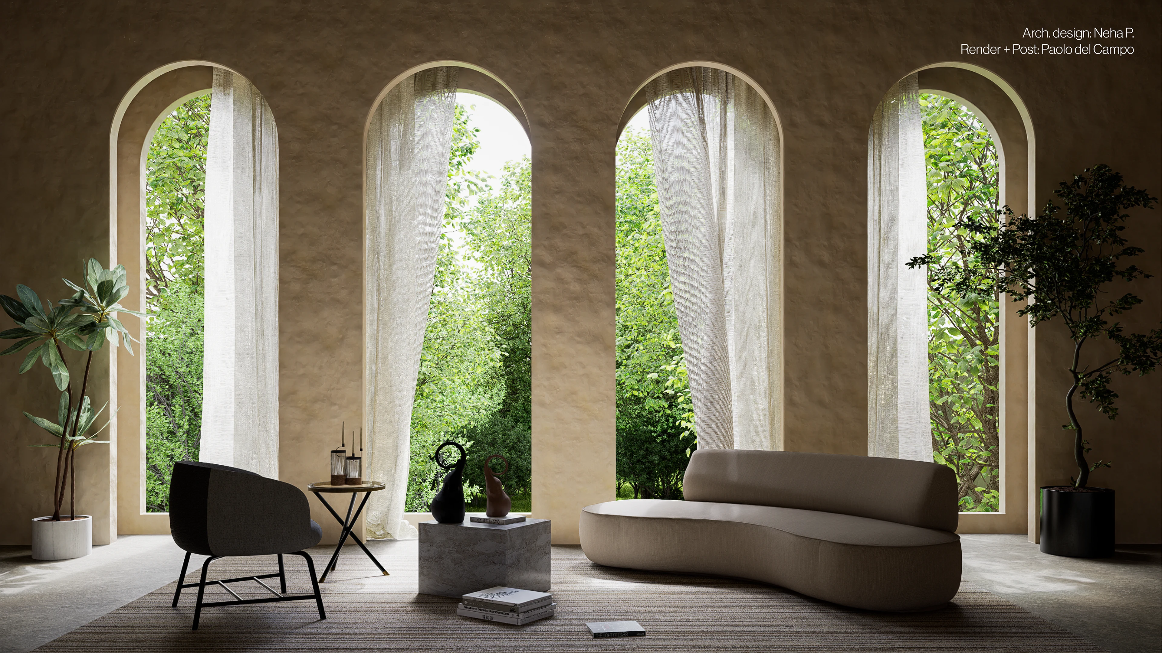 The Arches is a serene living space where natural light filters through tall openings, blending earthy textures with minimalist comfort.