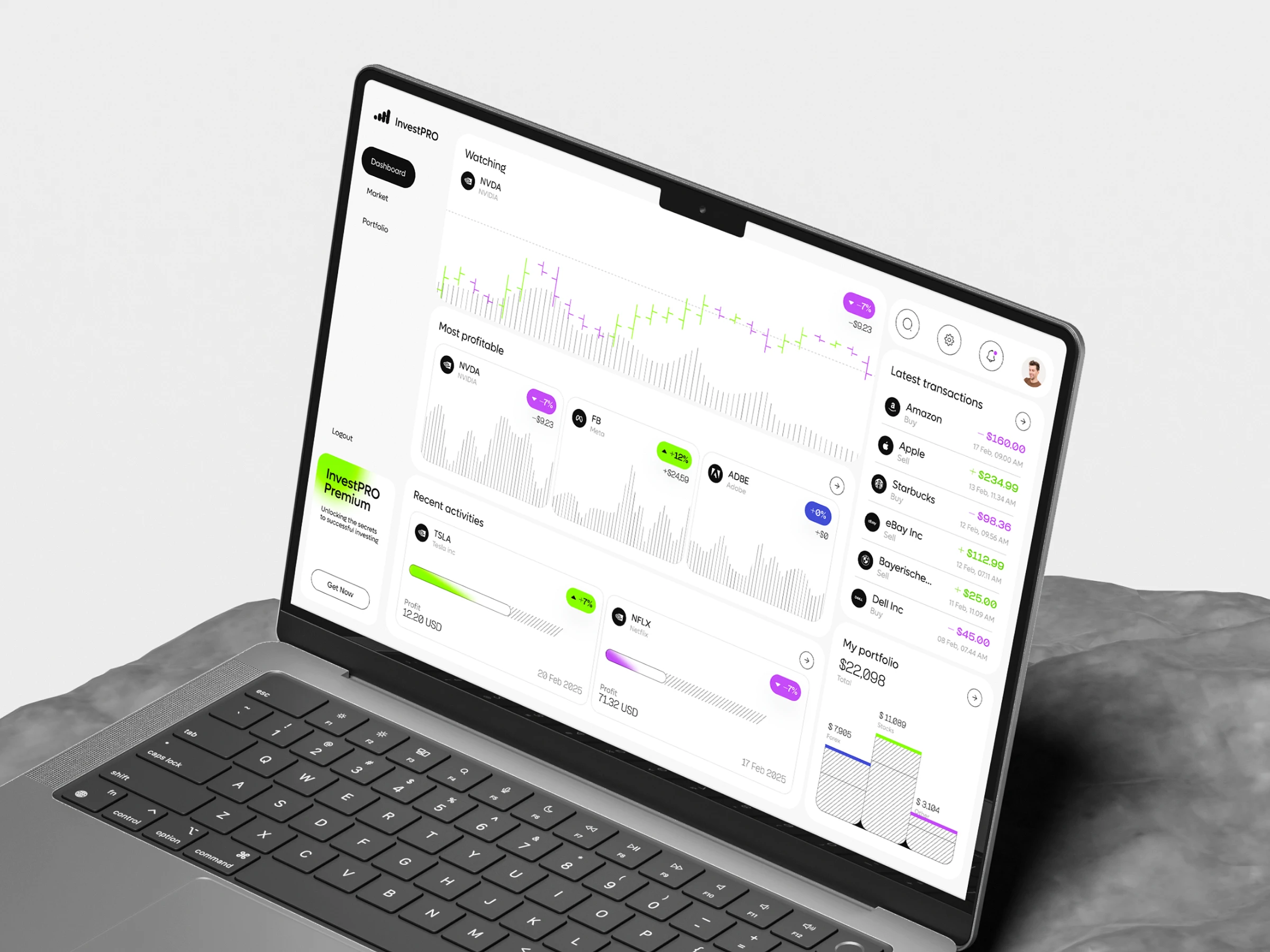 The dashboard showcases price trend charts, recent transactions, and the investment portfolio.