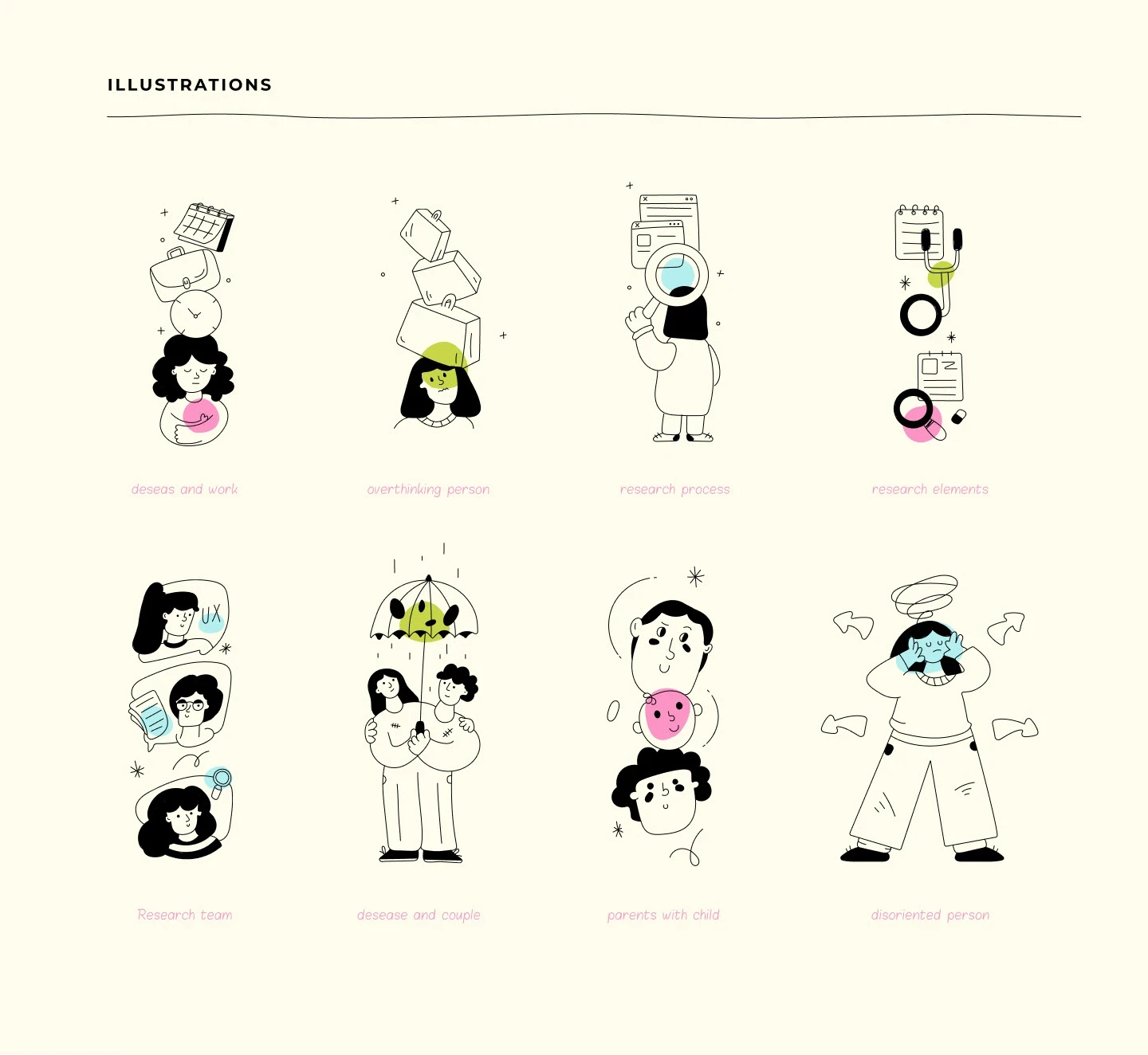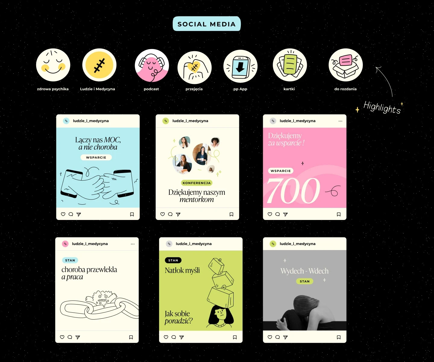 I created a scalable illustration + social media system for Ludzie i Medycyna, a foundation connecting healthcare and UX research. The goal was to make sensitive topics feel human and approachable without slipping into cold medical visuals or chaotic one-off posts. I built a minimal illustration language and a repeatable template system that stays consistent across posts, highlights, covers, and offline use.