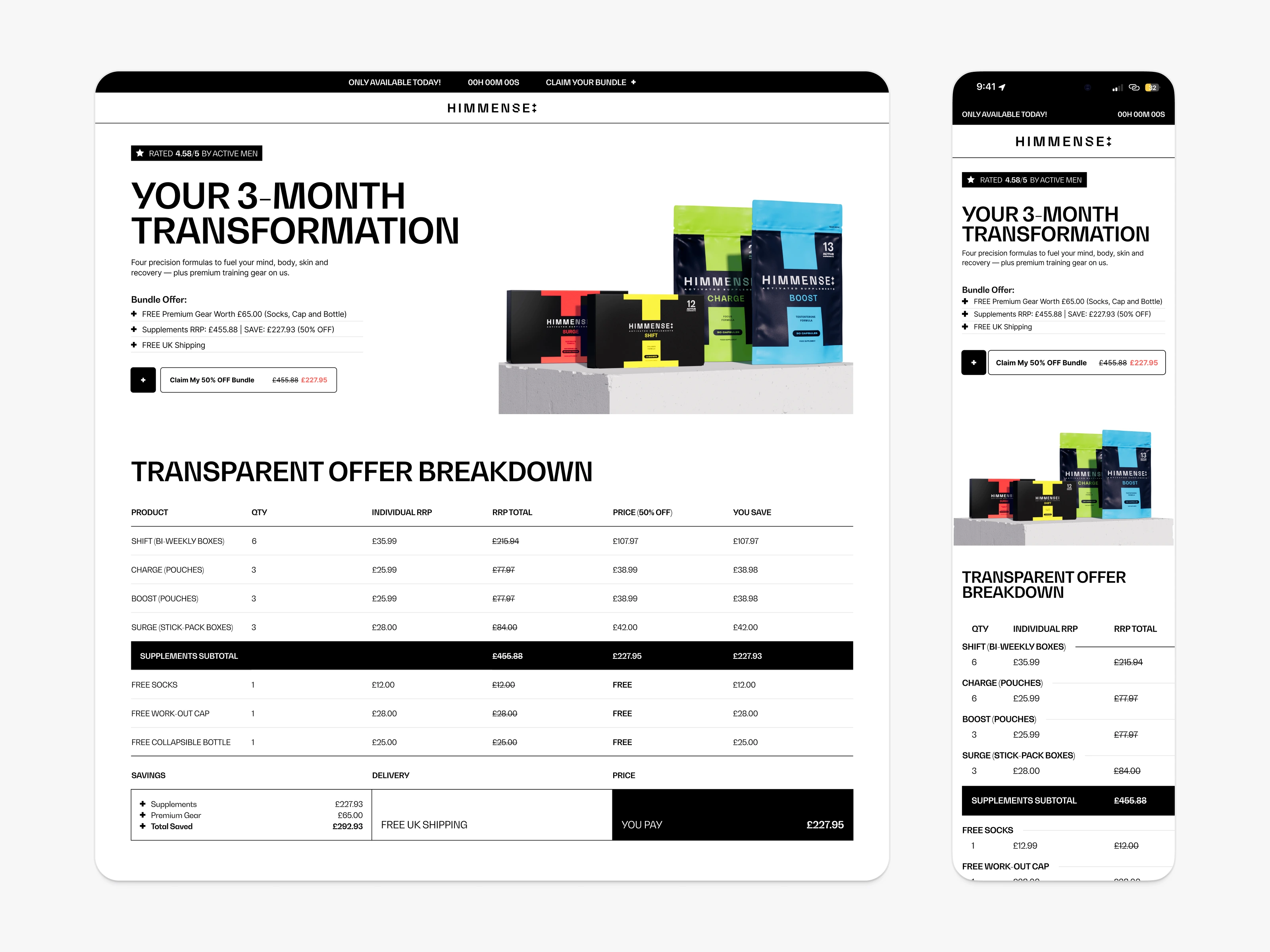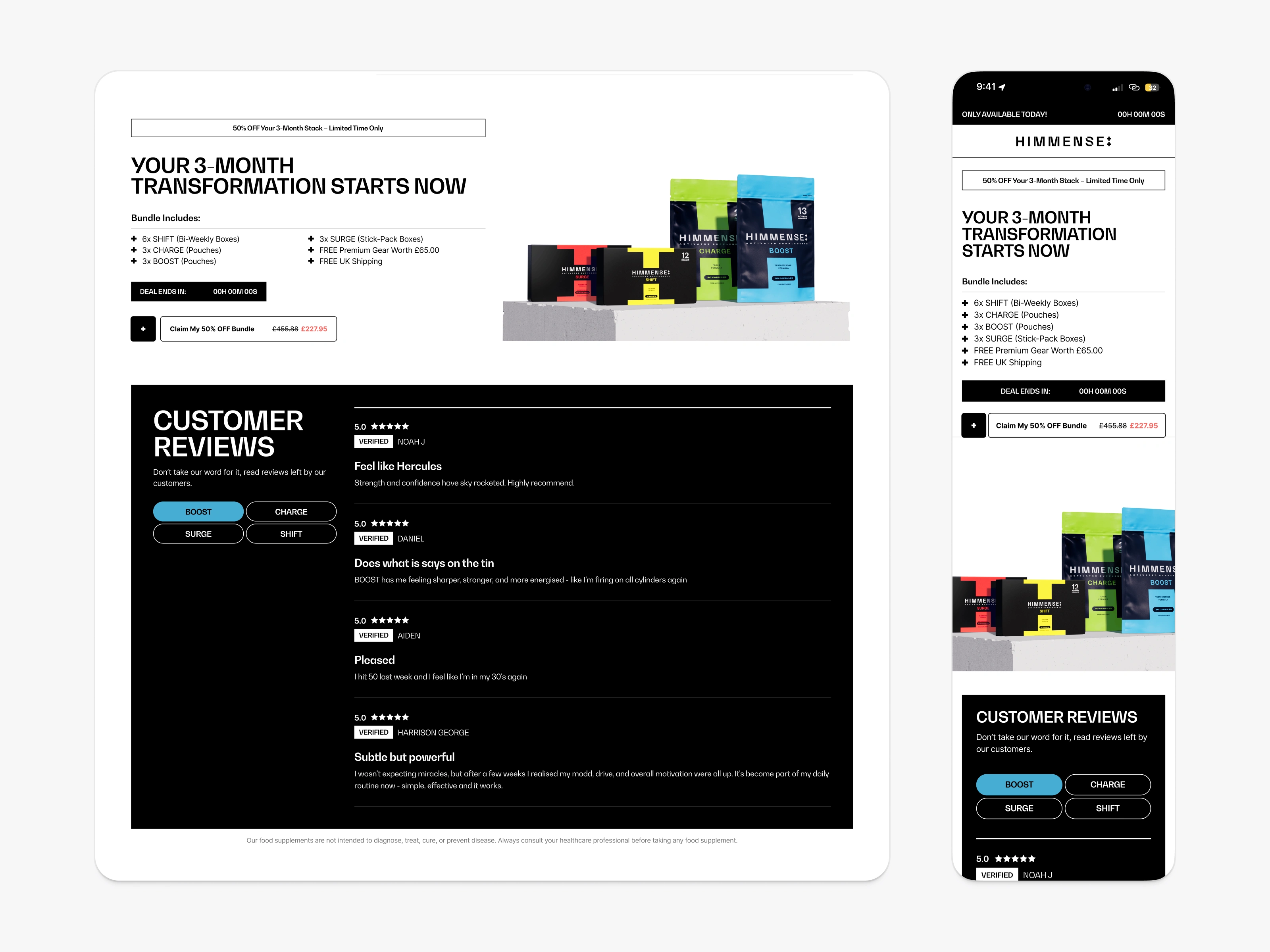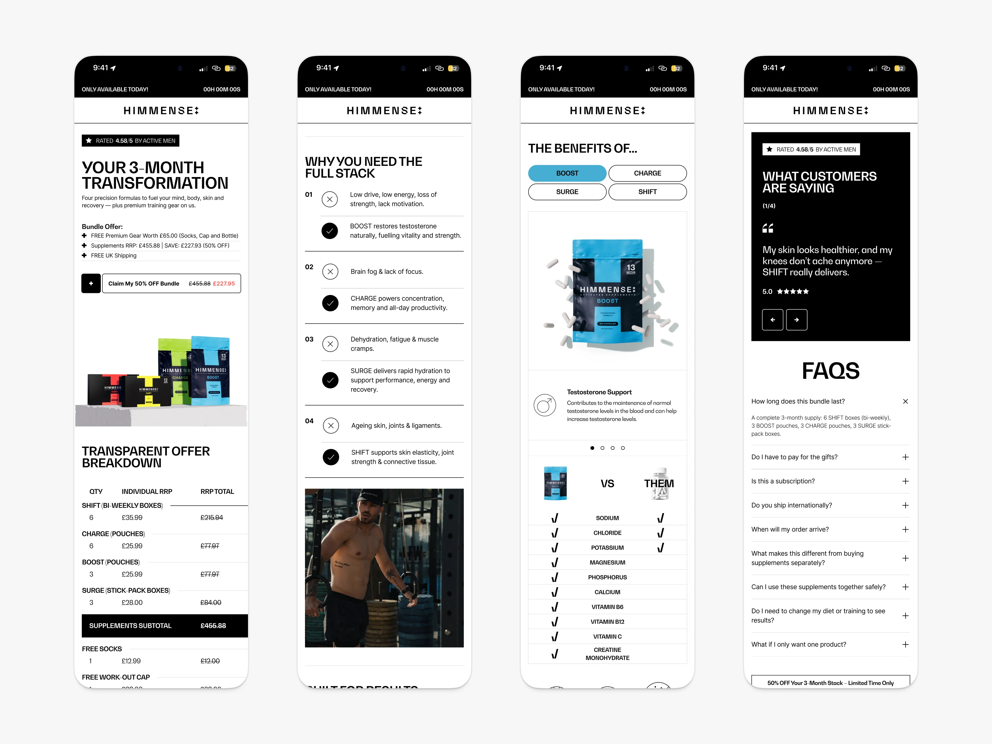 Designed and built a high-converting Replo landing page for Himmense to A/B test a new bundle offer. Modular, branded, and focused on boosting AOV.