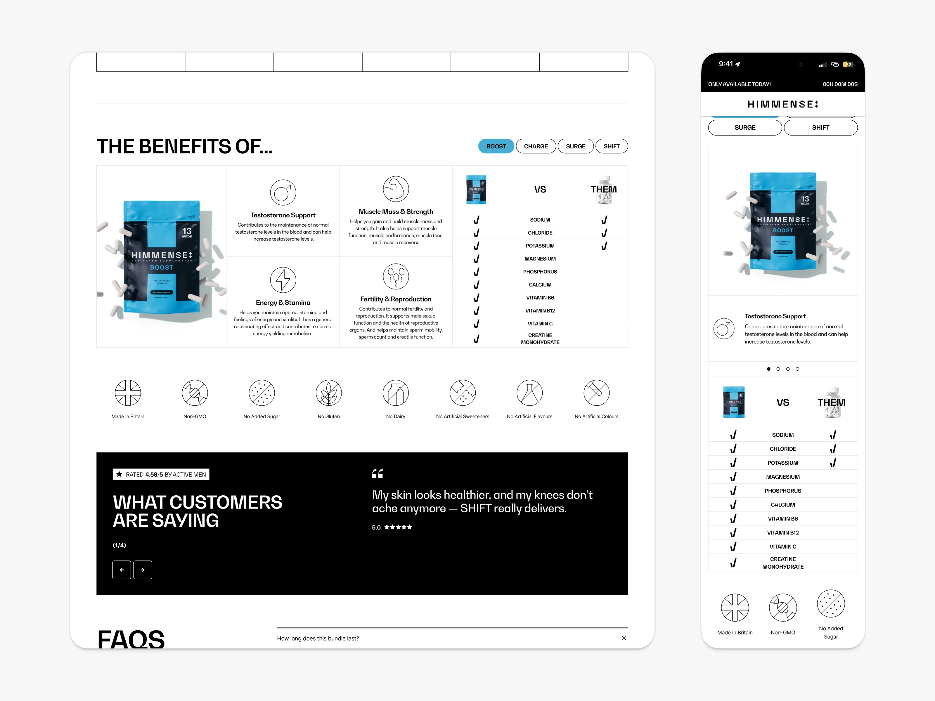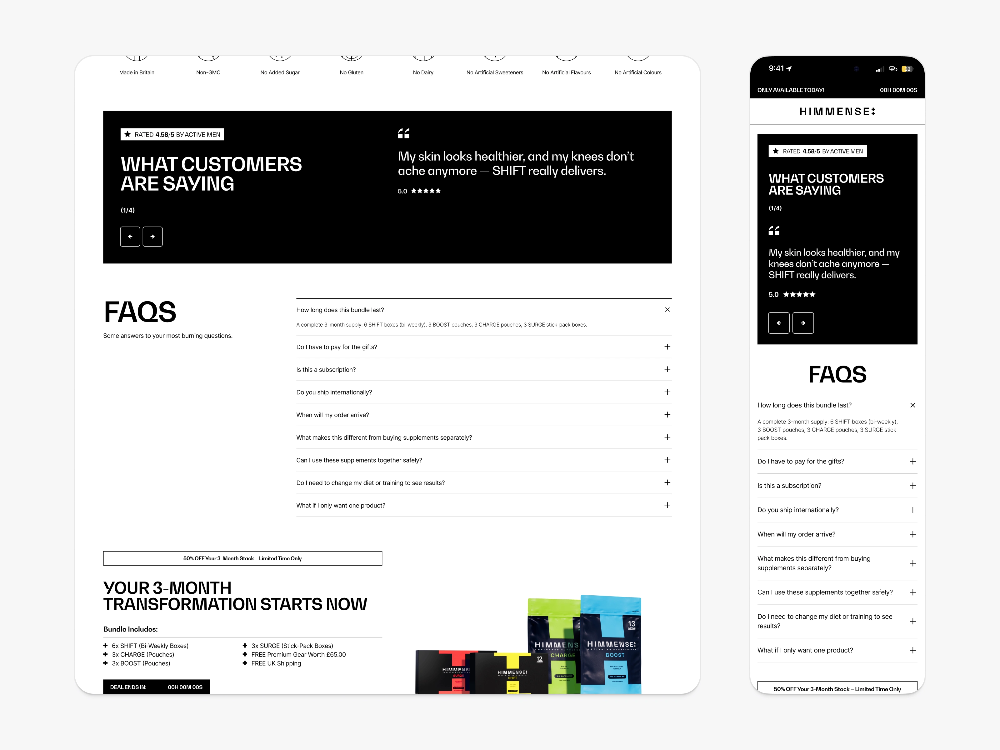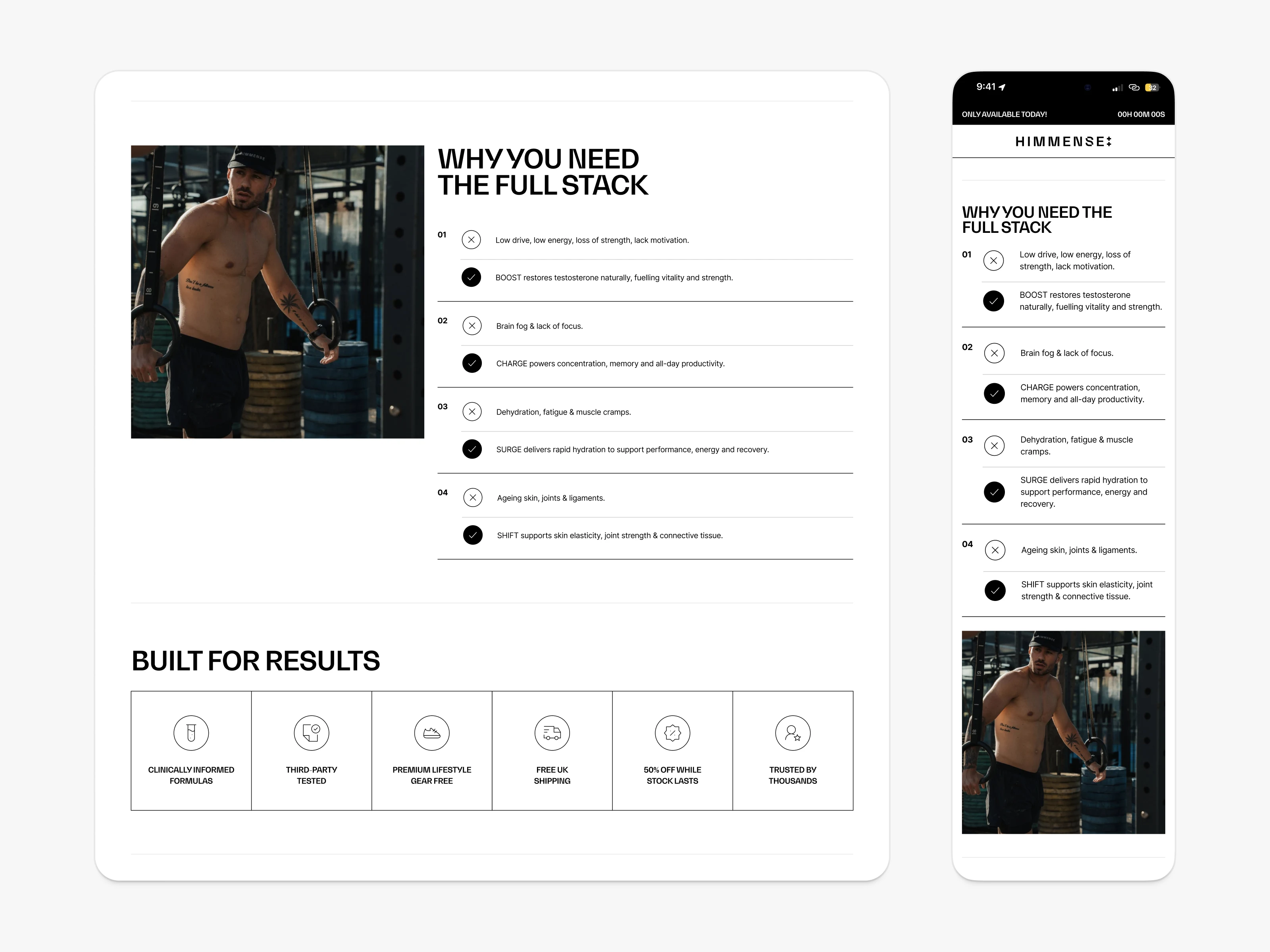 Designed and built a high-converting Replo landing page for Himmense to A/B test a new bundle offer. Modular, branded, and focused on boosting AOV.