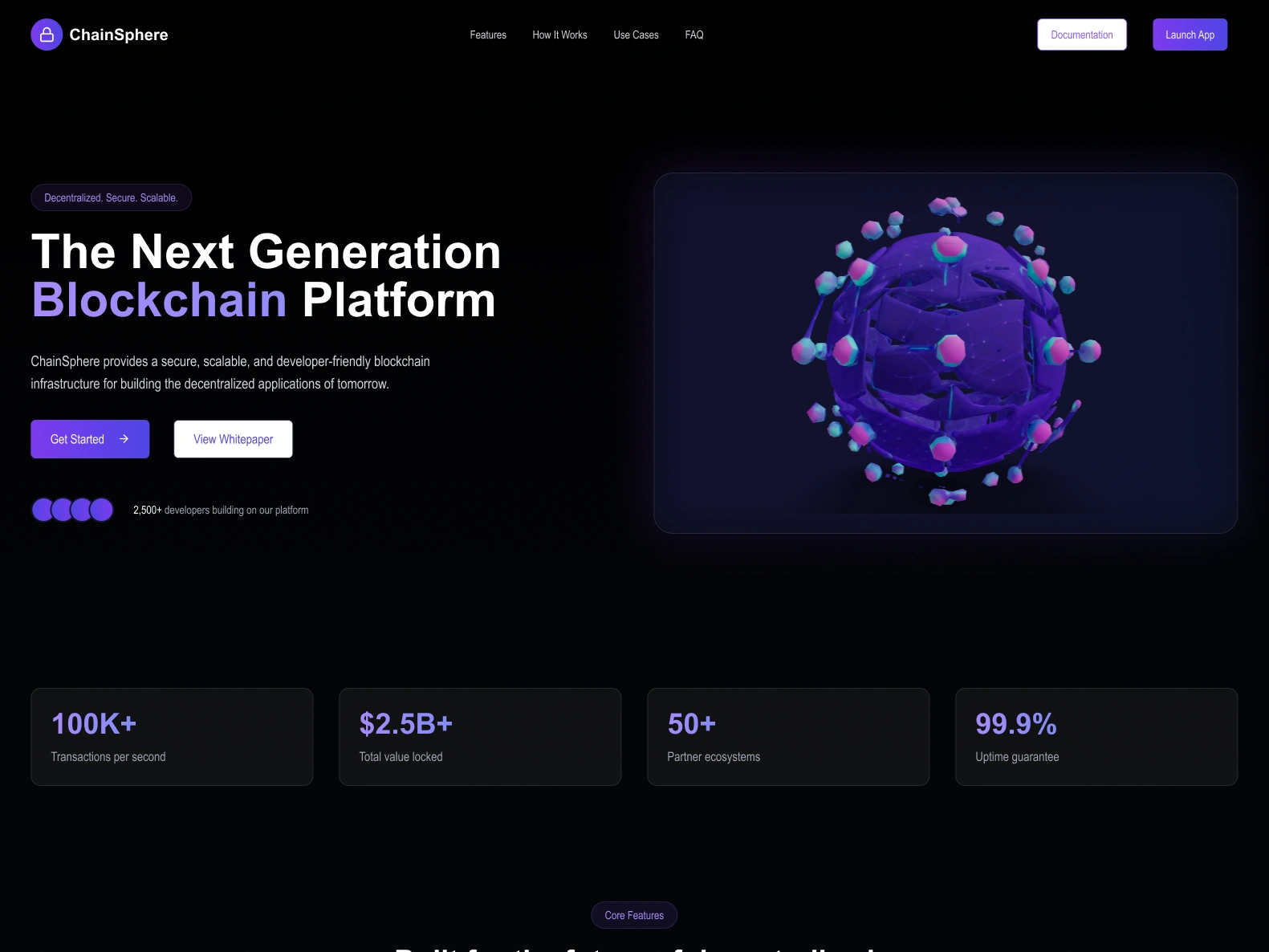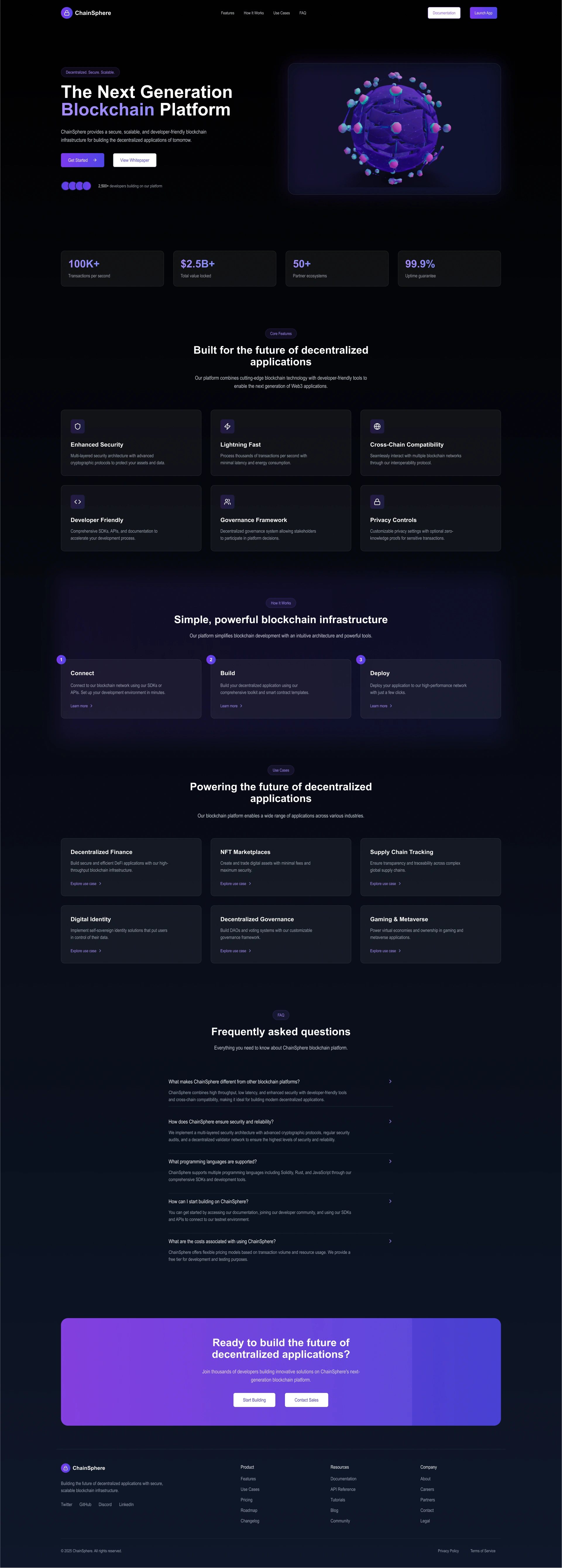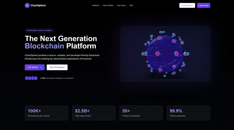✈️ Project Overview ChainSphere is a developer‑friendly, decentralized blockchain infrastructure built for today’s Web3 apps. I designed this dark‑mode landing page with bold gradients and subtle neon accents to give it that futuristic, high‑tech vibe.