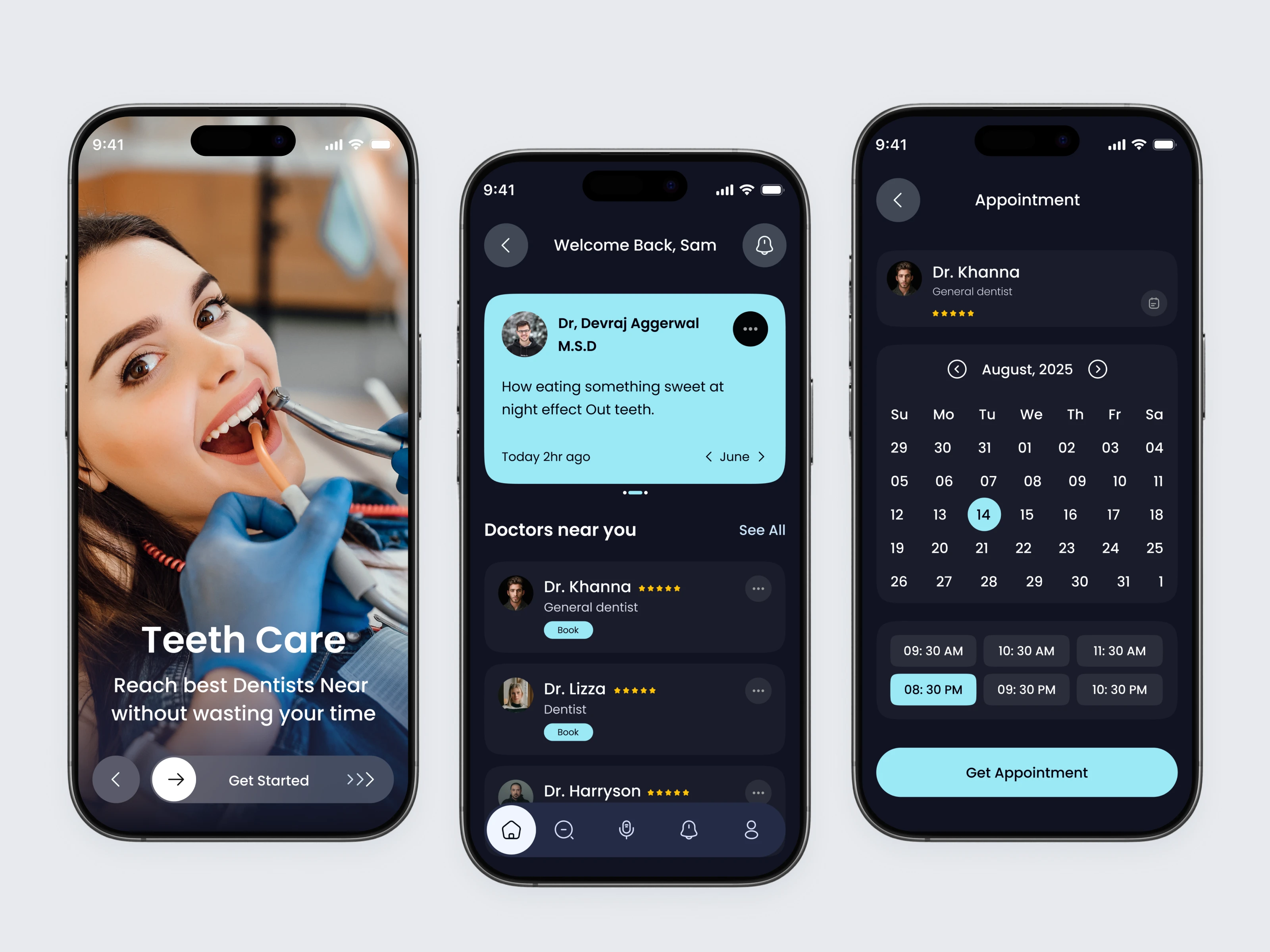 This is a clean and modern Teeth Care / Dental Appointment App UI concept. The design helps users easily find nearby dentists, check doctor profiles, and book appointments without wasting time.