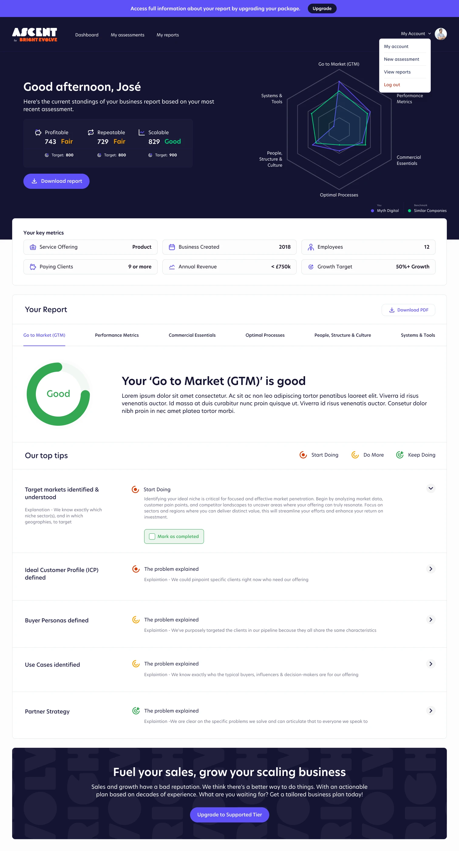 I designed the Ascent assessment dashboard—a dynamic, data-driven tool that delivers personalized business health reports to founders. The UI distills complex metrics (profitability, repeatability, scalability) into clear visualizations and practical next steps. Users get tailored insights with benchmarks, progress tracking, and actionable recommendations across key growth pillars. Every section is optimized for clarity and engagement, encouraging founders to upgrade and unlock deeper, data-backed guidance. The result is a modern, trust-building interface that empowers users to understand and scale their business with confidence.