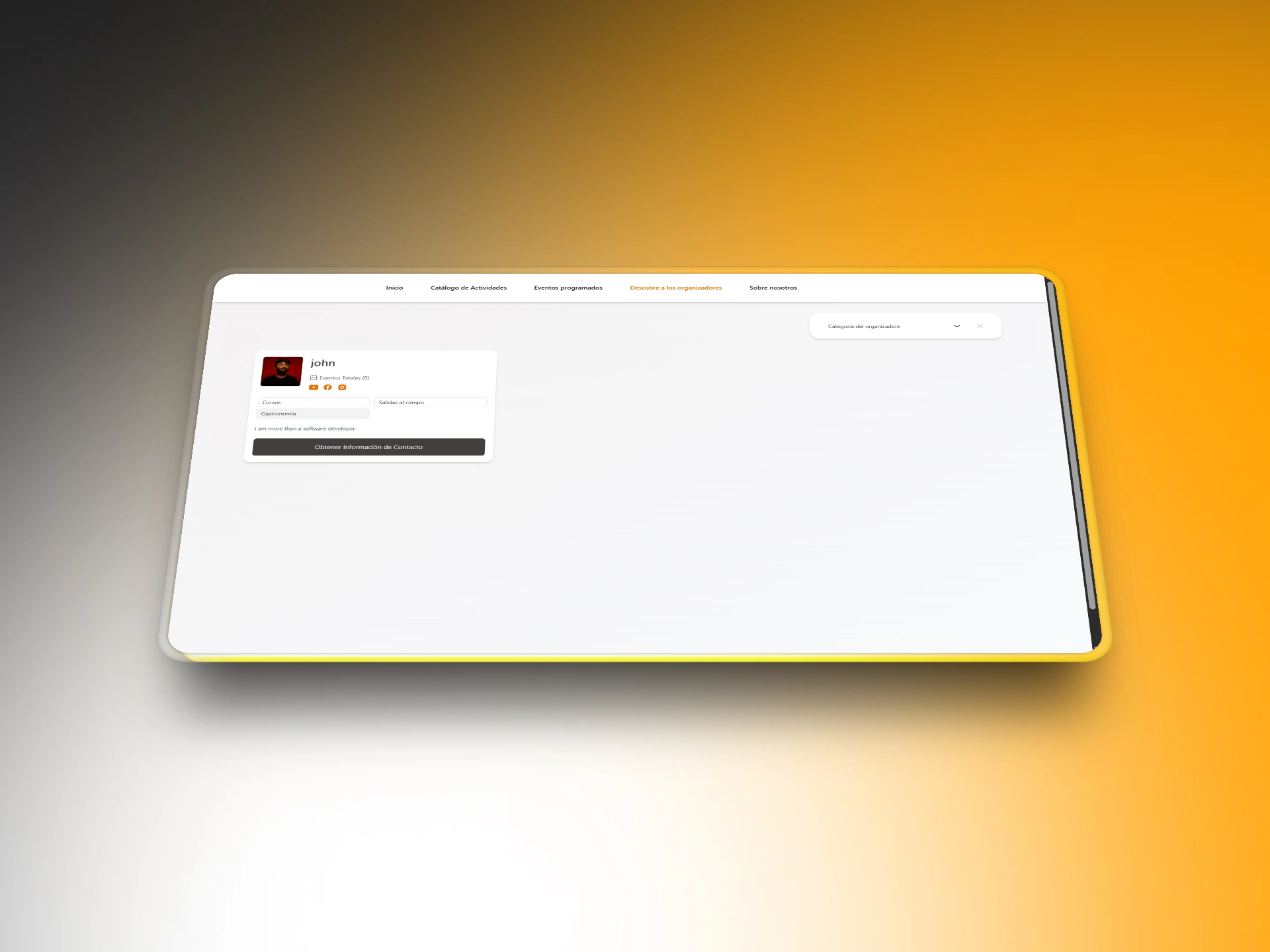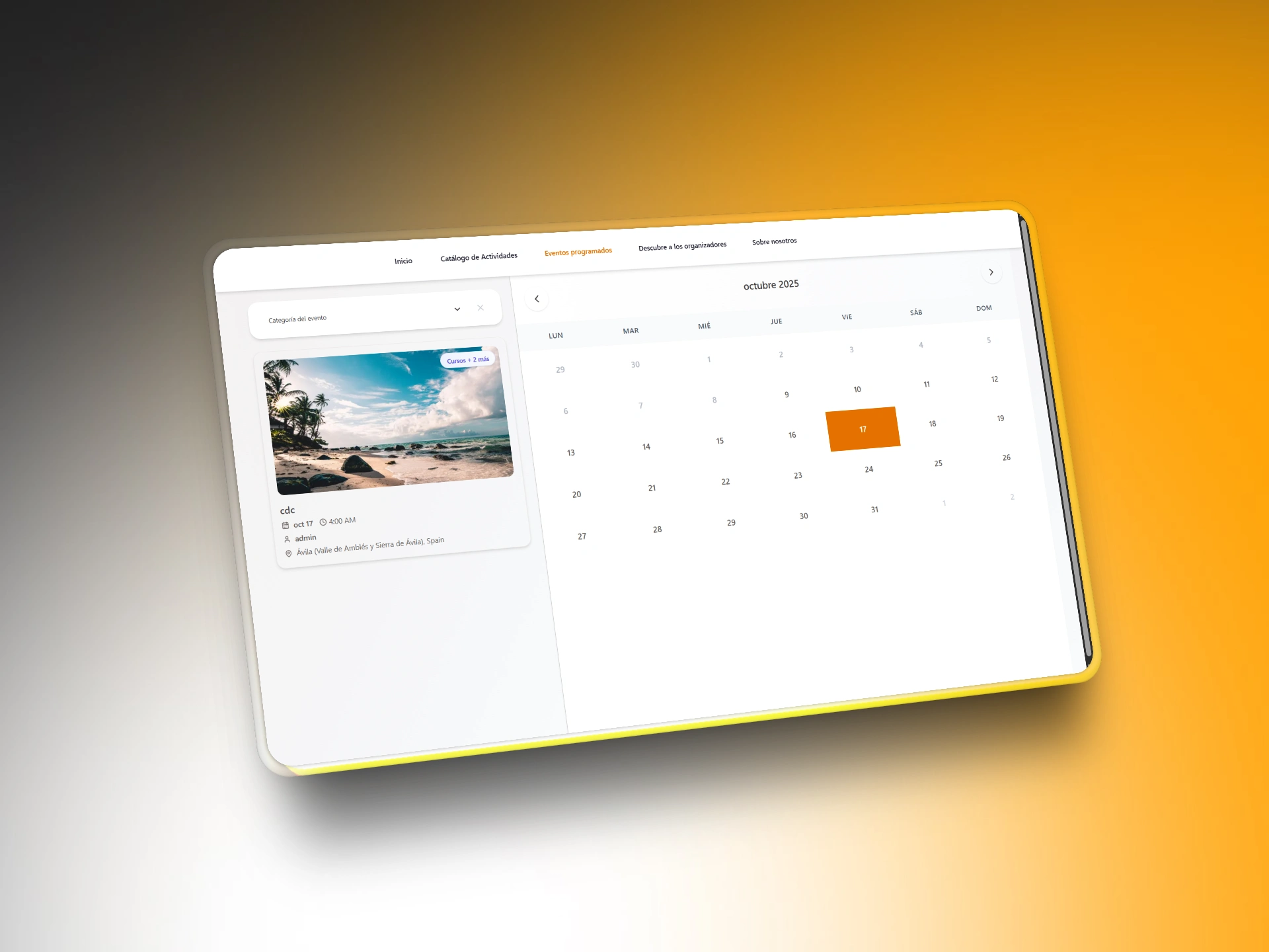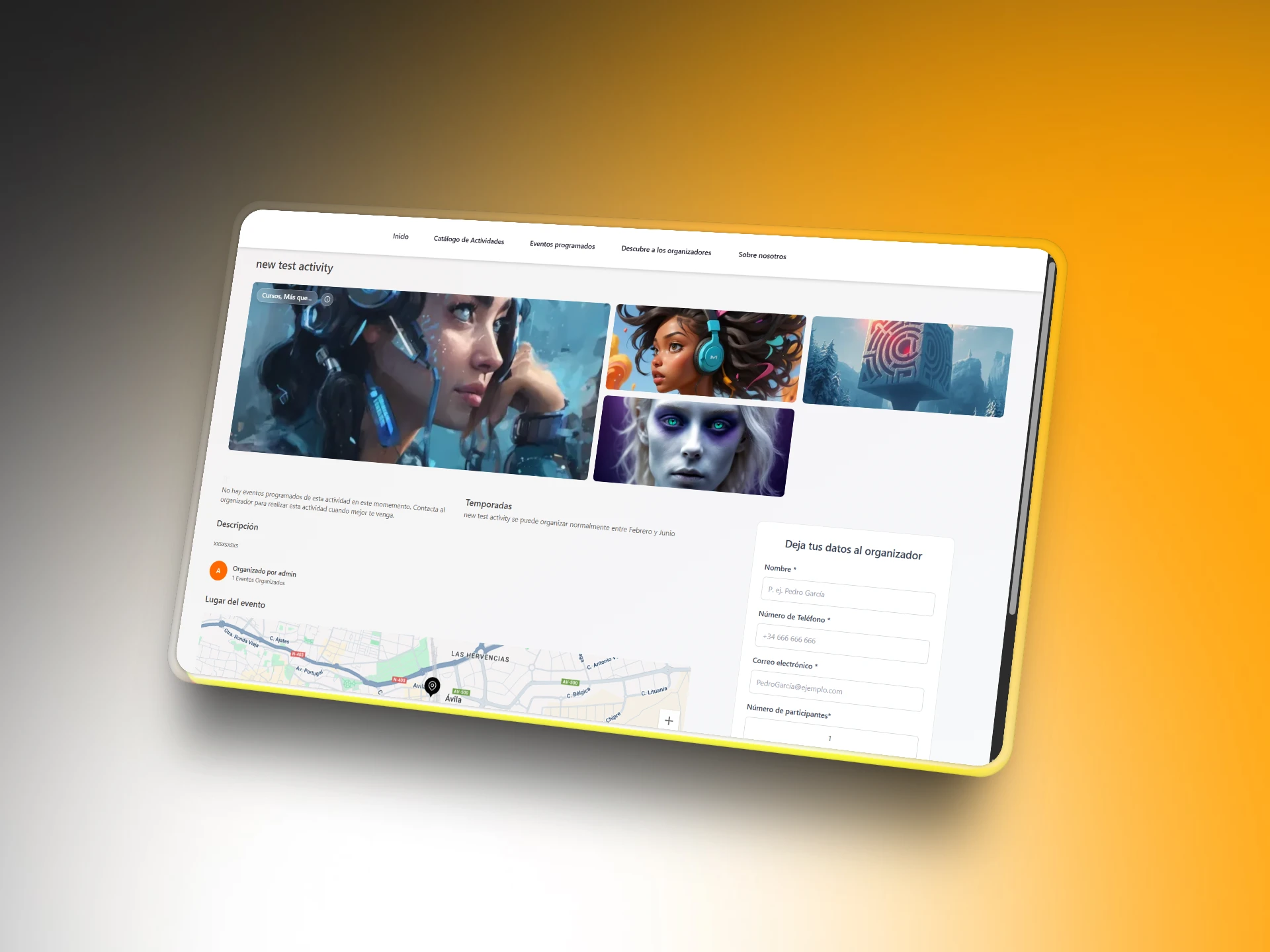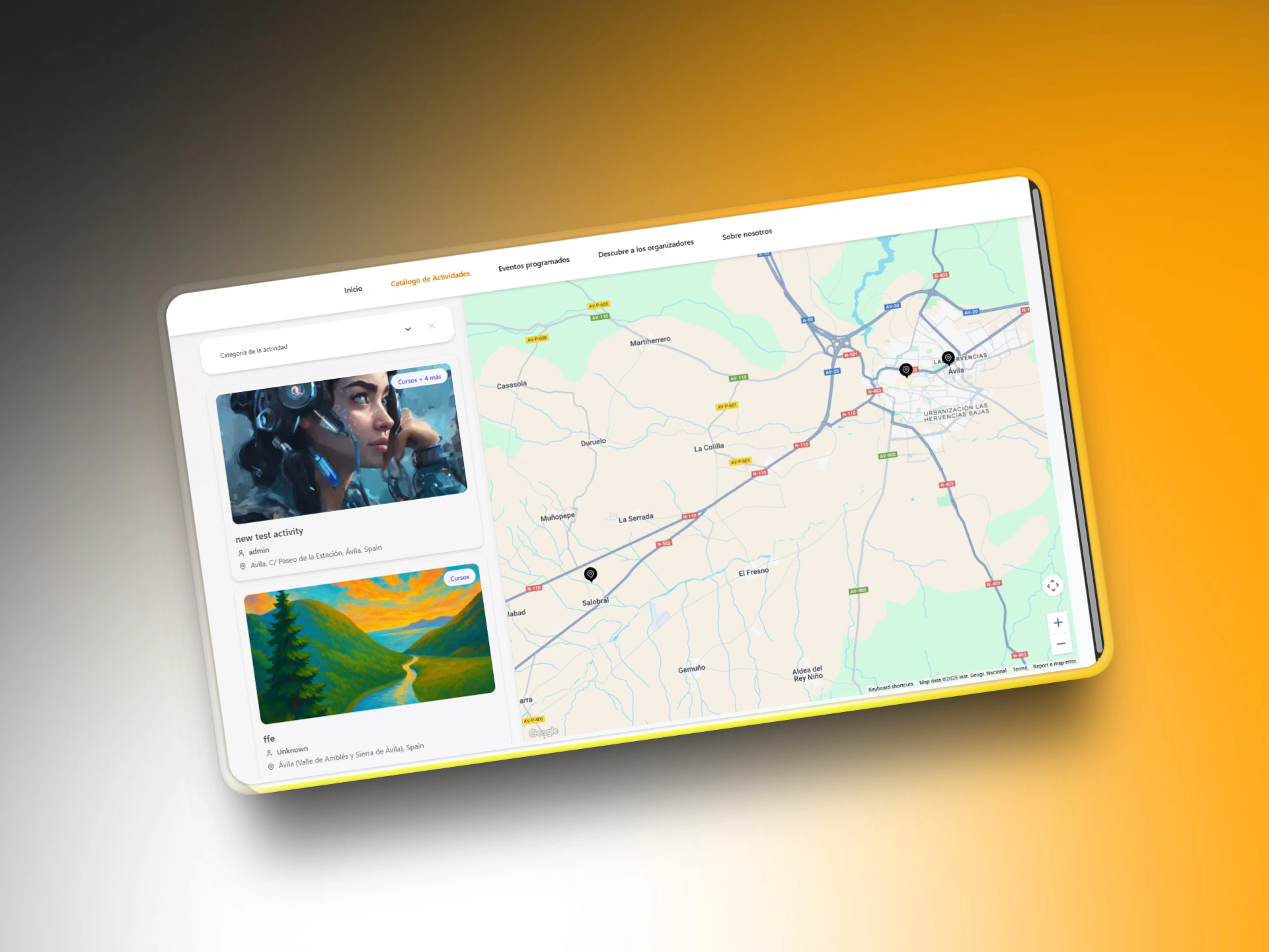 tourism activities platform, events booking app, interactive map, event calendar, location‑based search, and organizer dashboard to improve searchability