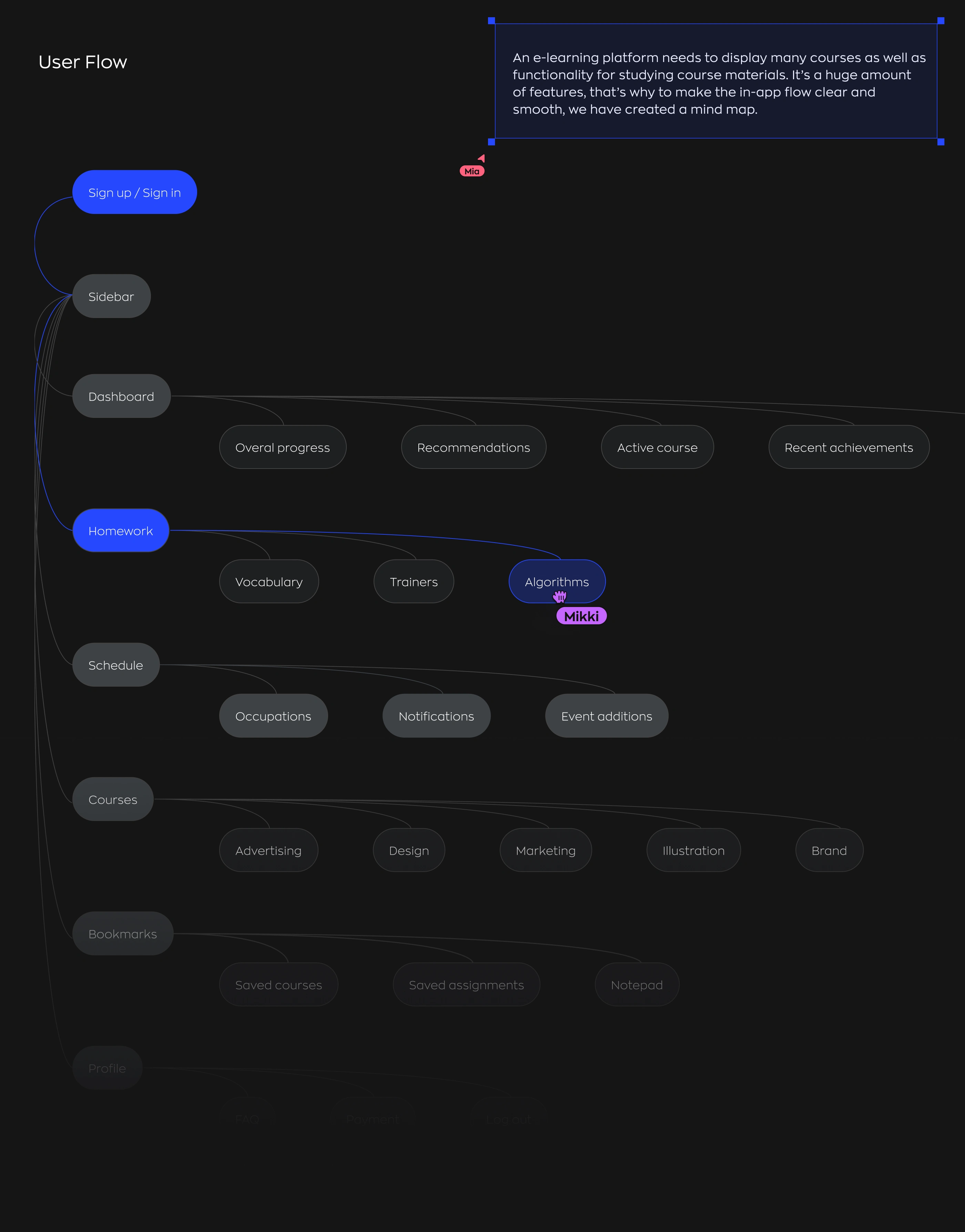 Designed an e-learning web app. Users get digital courses & new skills. Our UI/UX team ensured smooth learning with mind maps, custom icons, and wireframes.