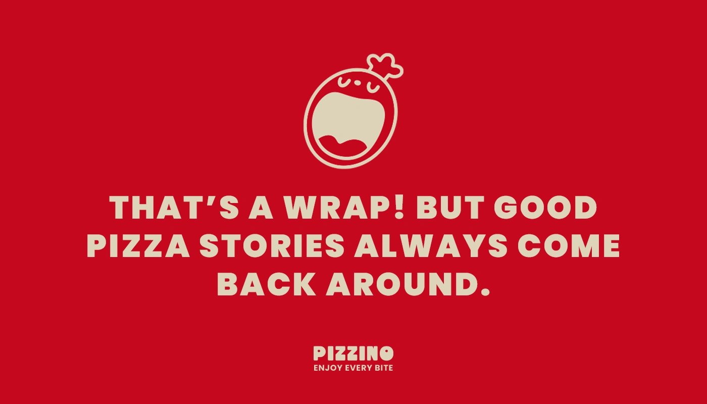 Playful red closing screen with Pizzino mascot and tagline about pizza stories returning.