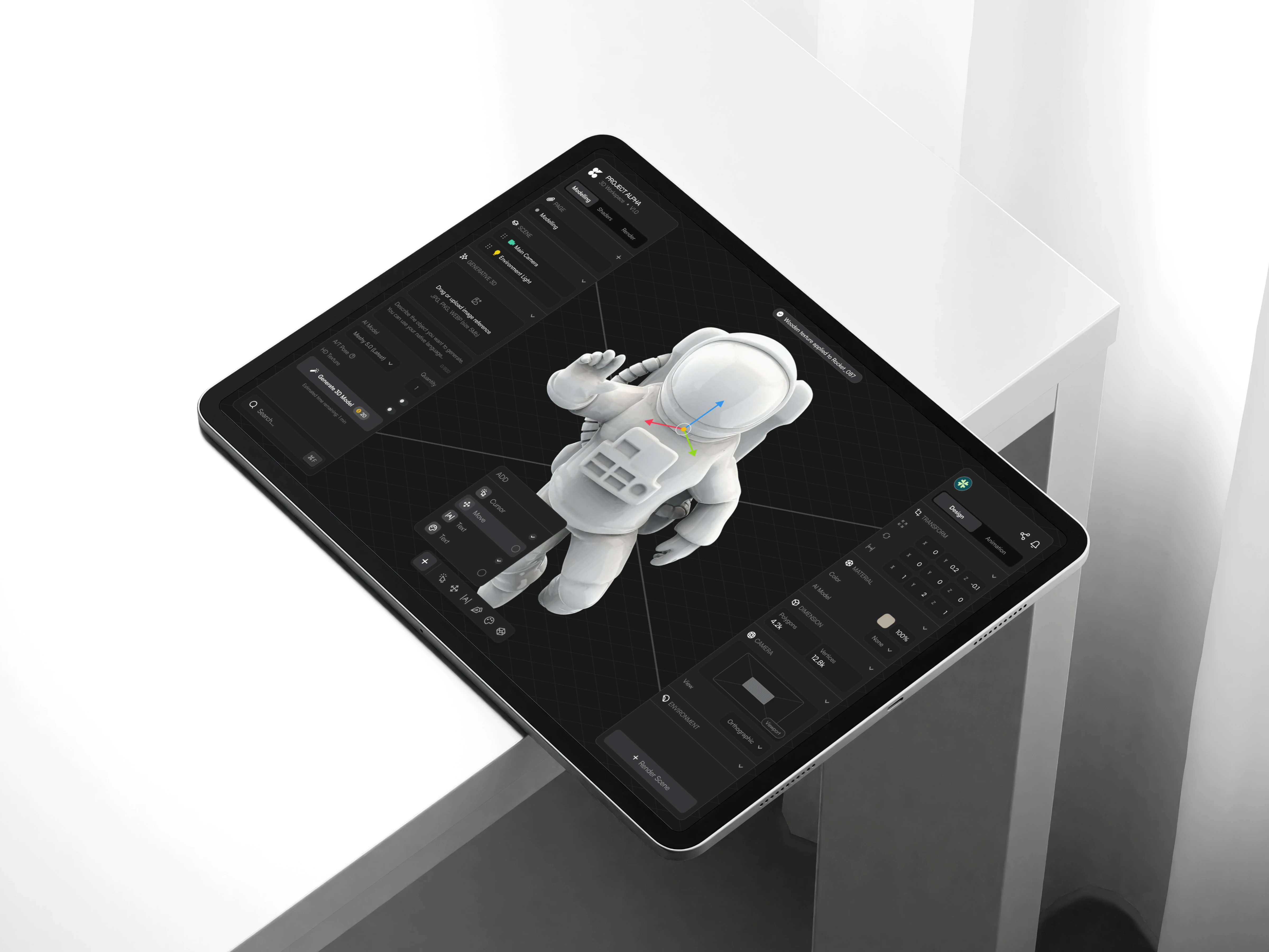 The 3D Builder Dashboard is designed as an immersive modeling workspace that integrates real-time 3D visualization, scene management, and object manipulation tools into a single streamlined interface. Built for tablet optimization, the dashboard balances advanced 3D modeling capabilities with a clean and structured UI system, ensuring both performance and usability.
