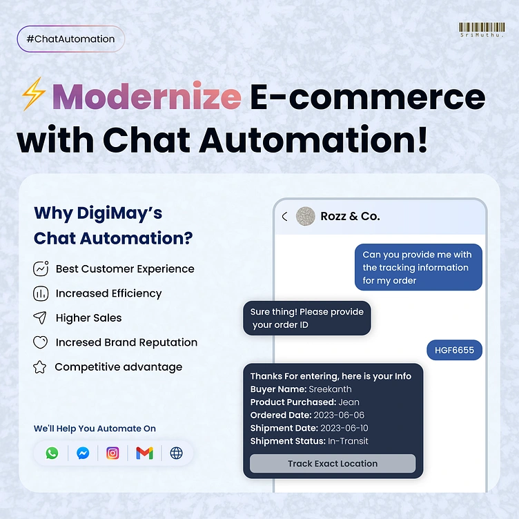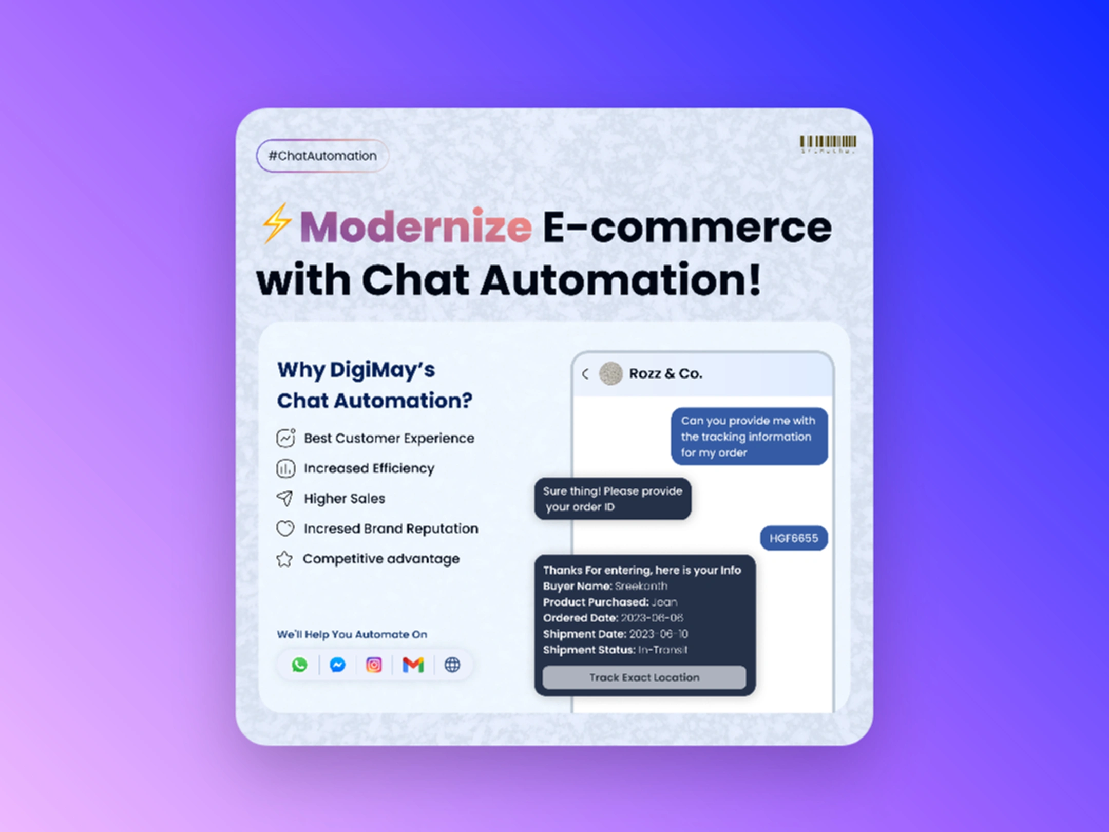 Engaging visual for chat automation in e-commerce. Highlights key benefits with a realistic mockup and clear icons for multi-platform support. Clean and modern.