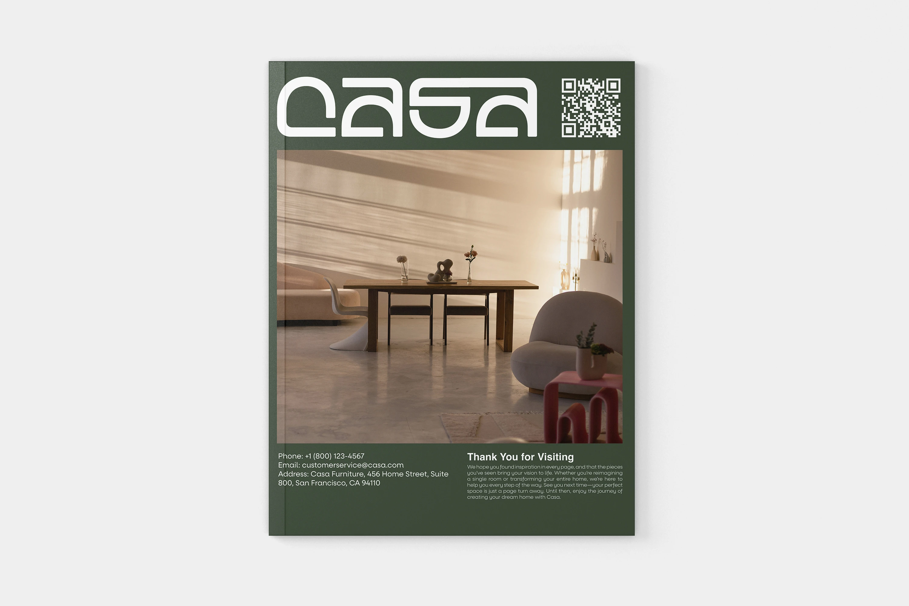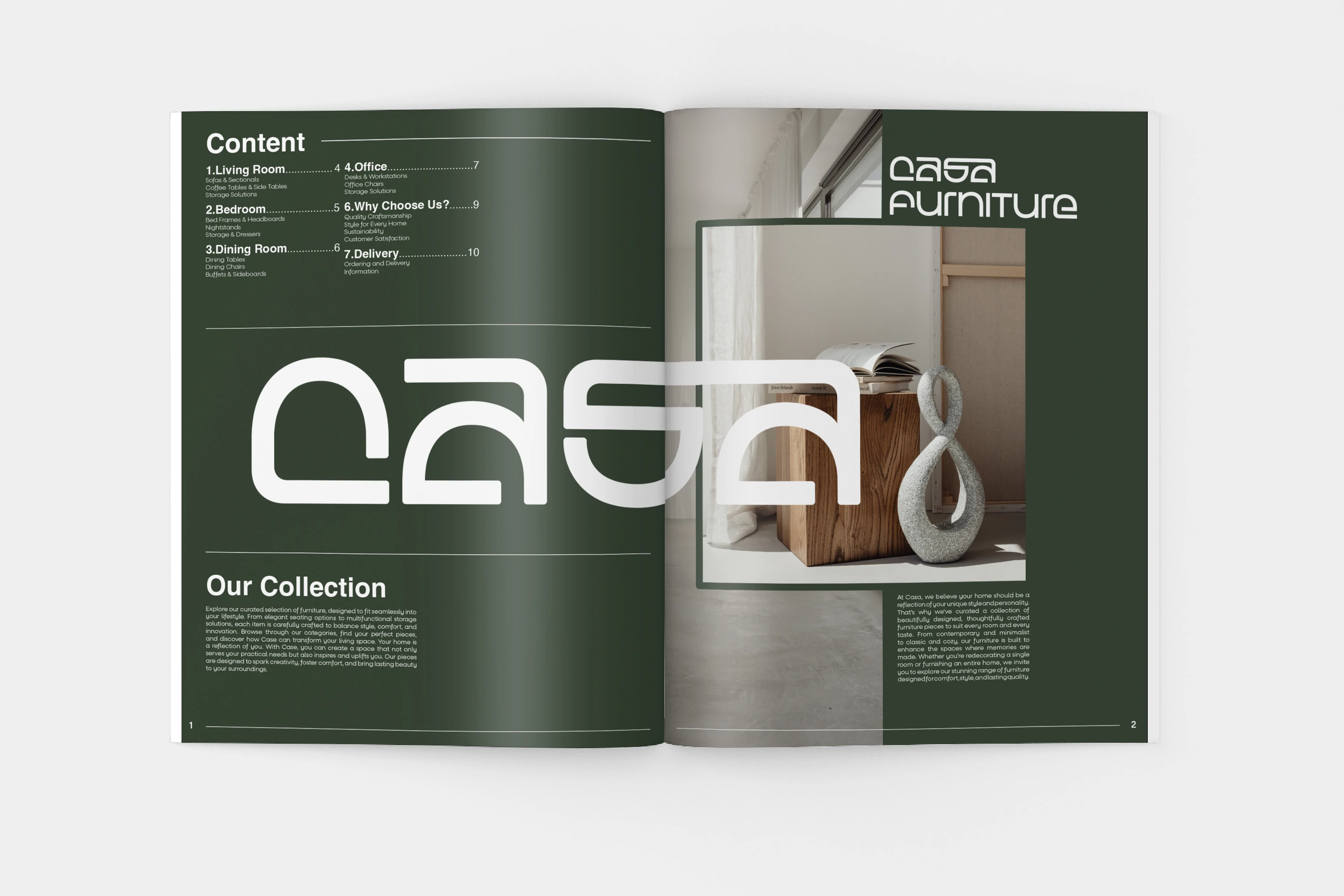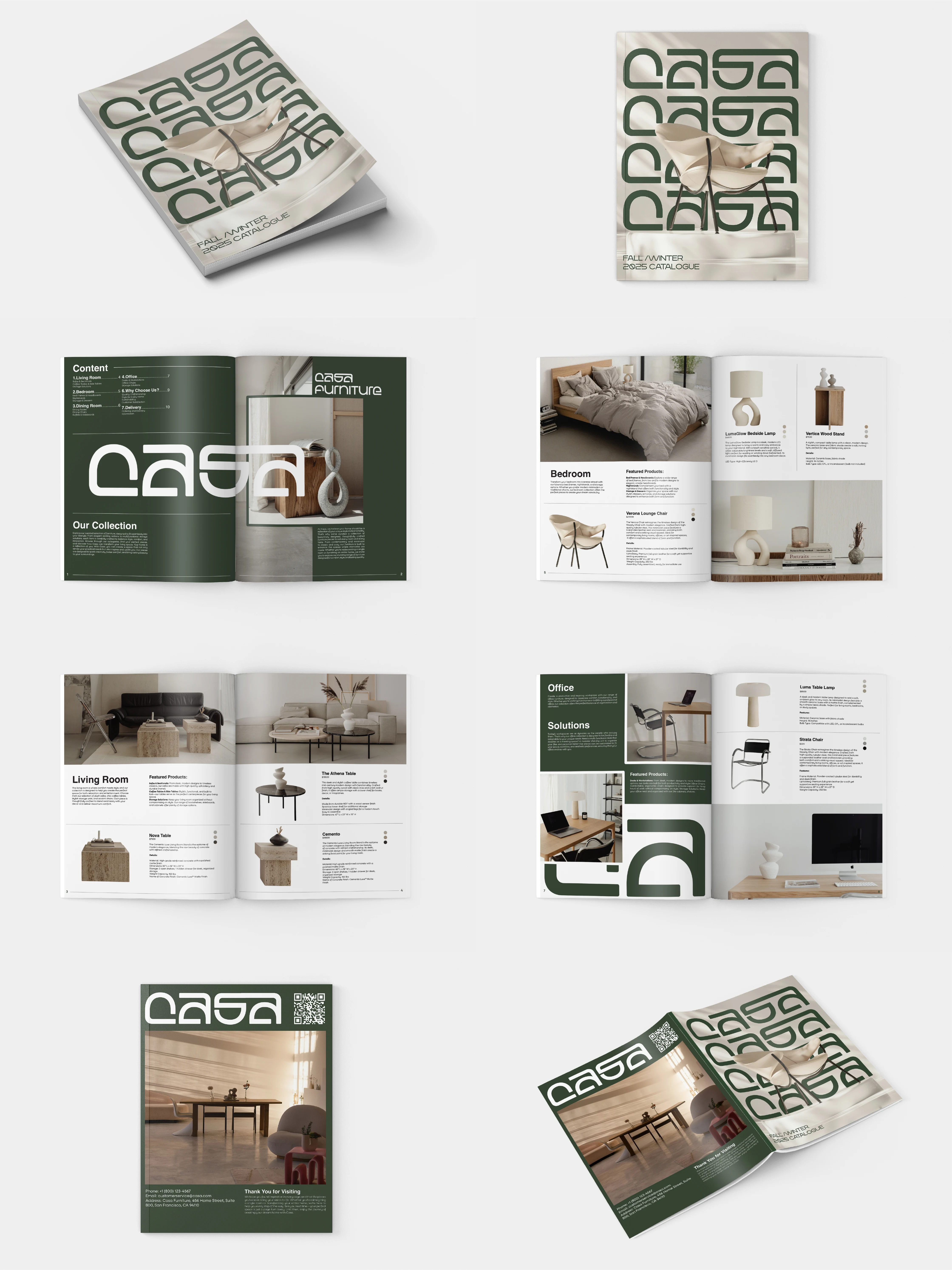 The word "Casa" originates from Spanish, Italian, and Latin, and is commonly used to refer to a person's house or home, evoking a sense of warmth, comfort, and personal space. The name conveys that the products offered are meant to enhance the home environment. This project is a furniture catalog I created for the fictional brief "Casa," featuring various layout designs, along with consistent imagery and design elements throughout.