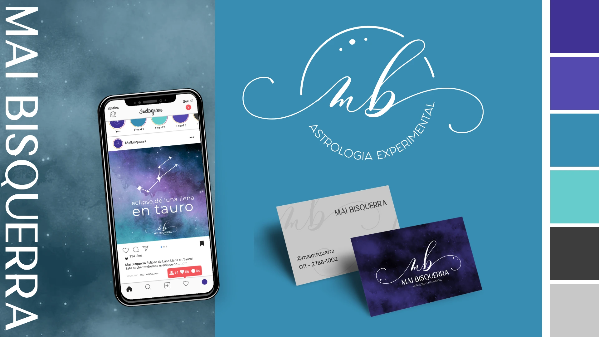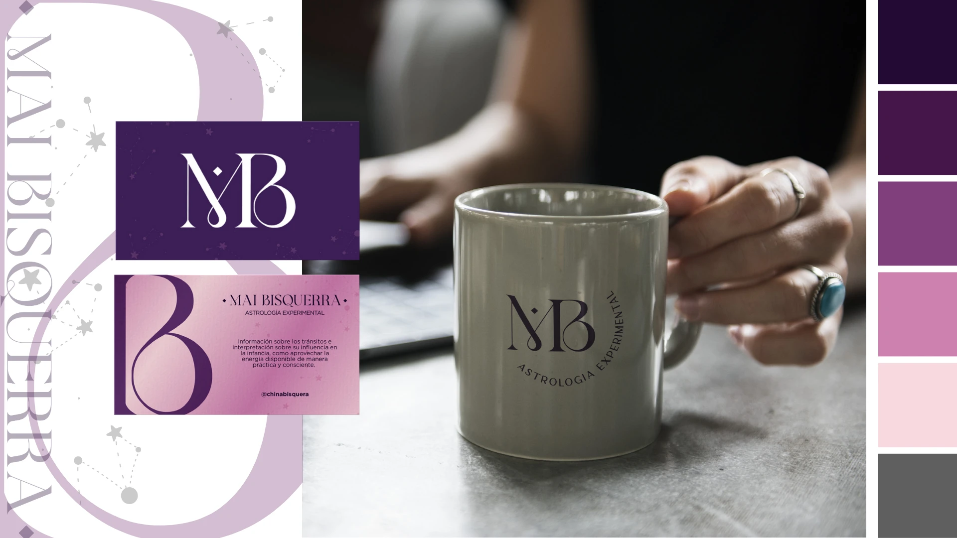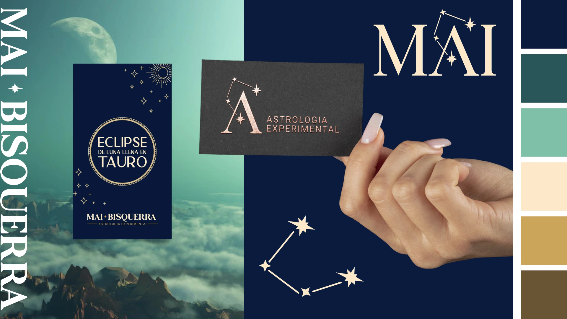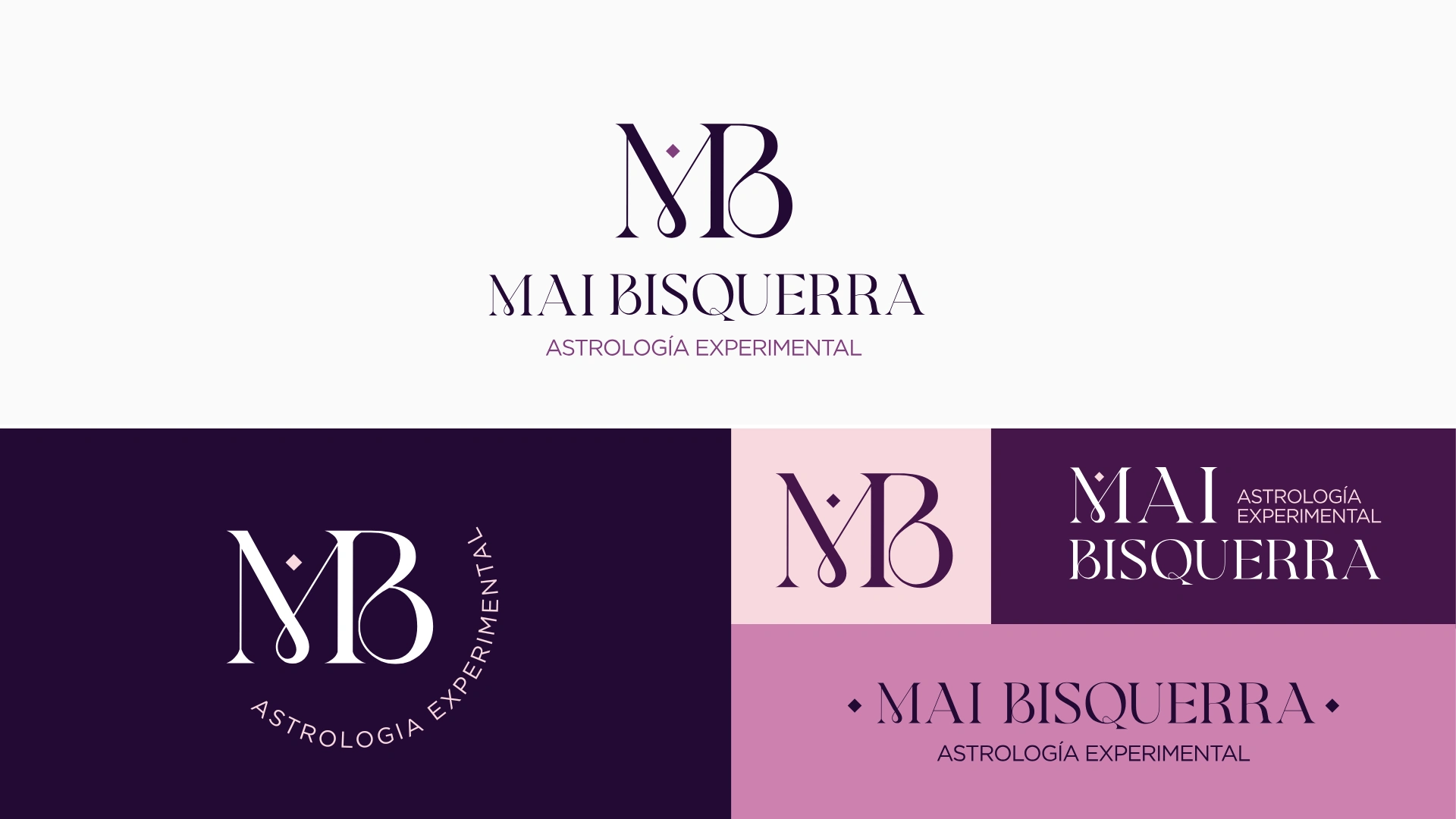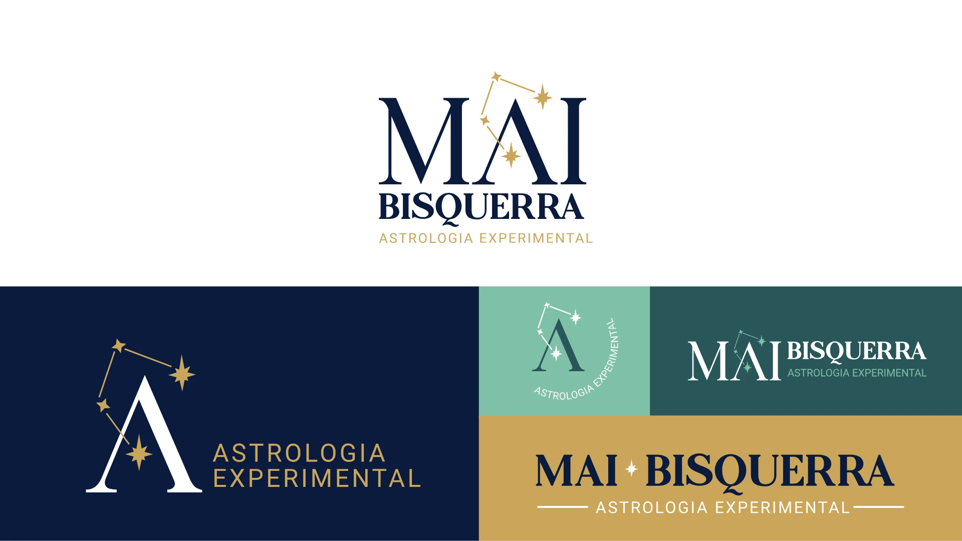 Visual identity proposal for Mai Bisquerra, a psychopedagogue and astrologer. We aim to create a brand that evokes transformation, growth, and a deep connection between parents, children, and the universe, transmitting the values of guidance, intuition, and empowerment through astrology.