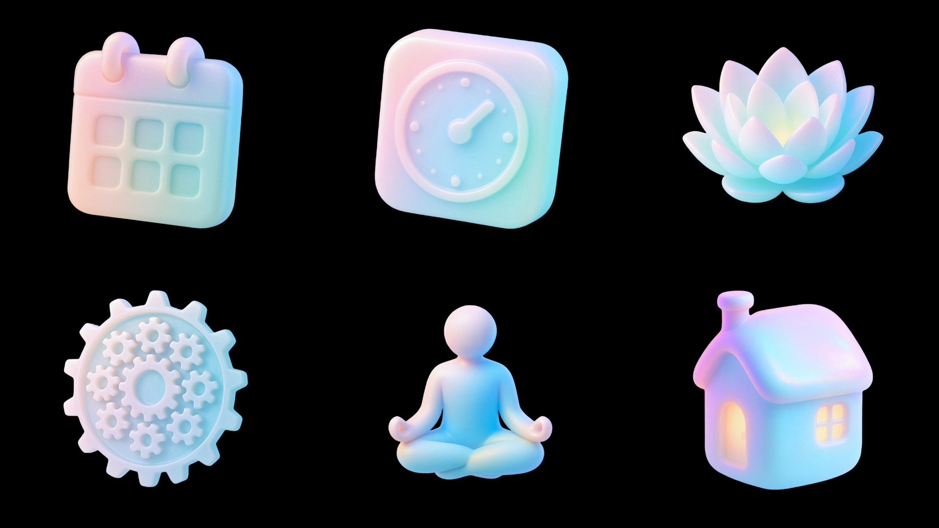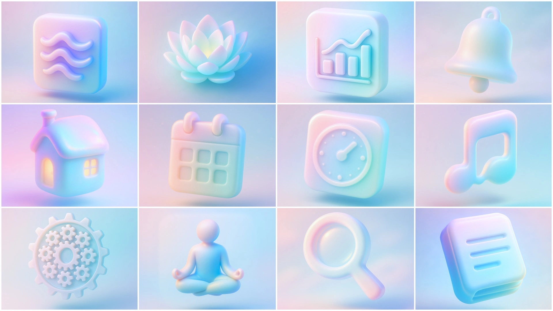 Deliver a complete, premium icon set for a meditation & mindfulness app – surreal, calming aesthetic with 3D elements and pastel gradients with AI. Every icon needed to feel part of the same dreamy universe.