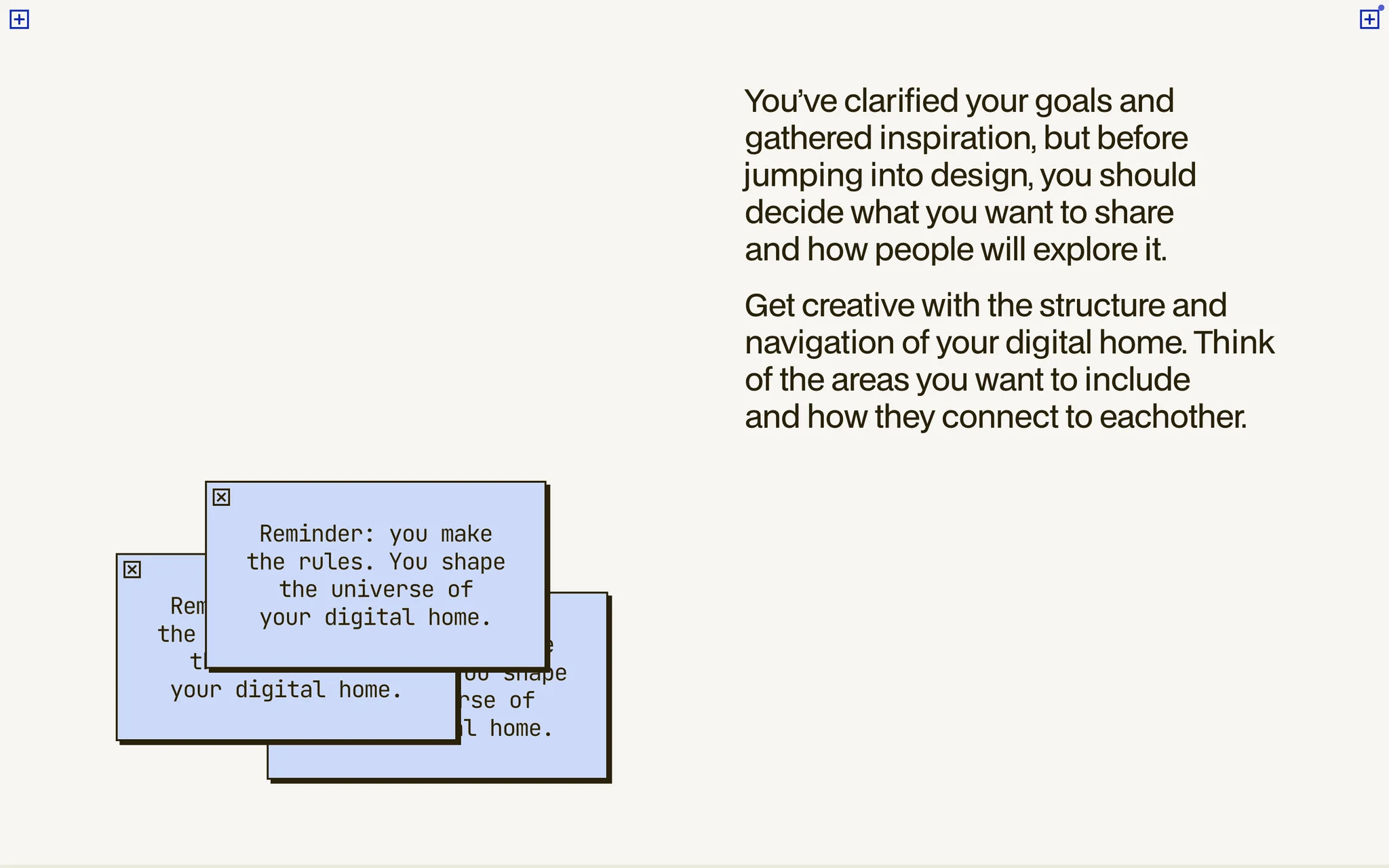 As part of my bachelor thesis, I studied web editorials as a format that brings storytelling and interactivity to digital publishing, using the web as a canvas. This project resulted in the creation of my own editorial: a web zine that encourages creatives to reclaim their space on the internet by creating their own digital home.