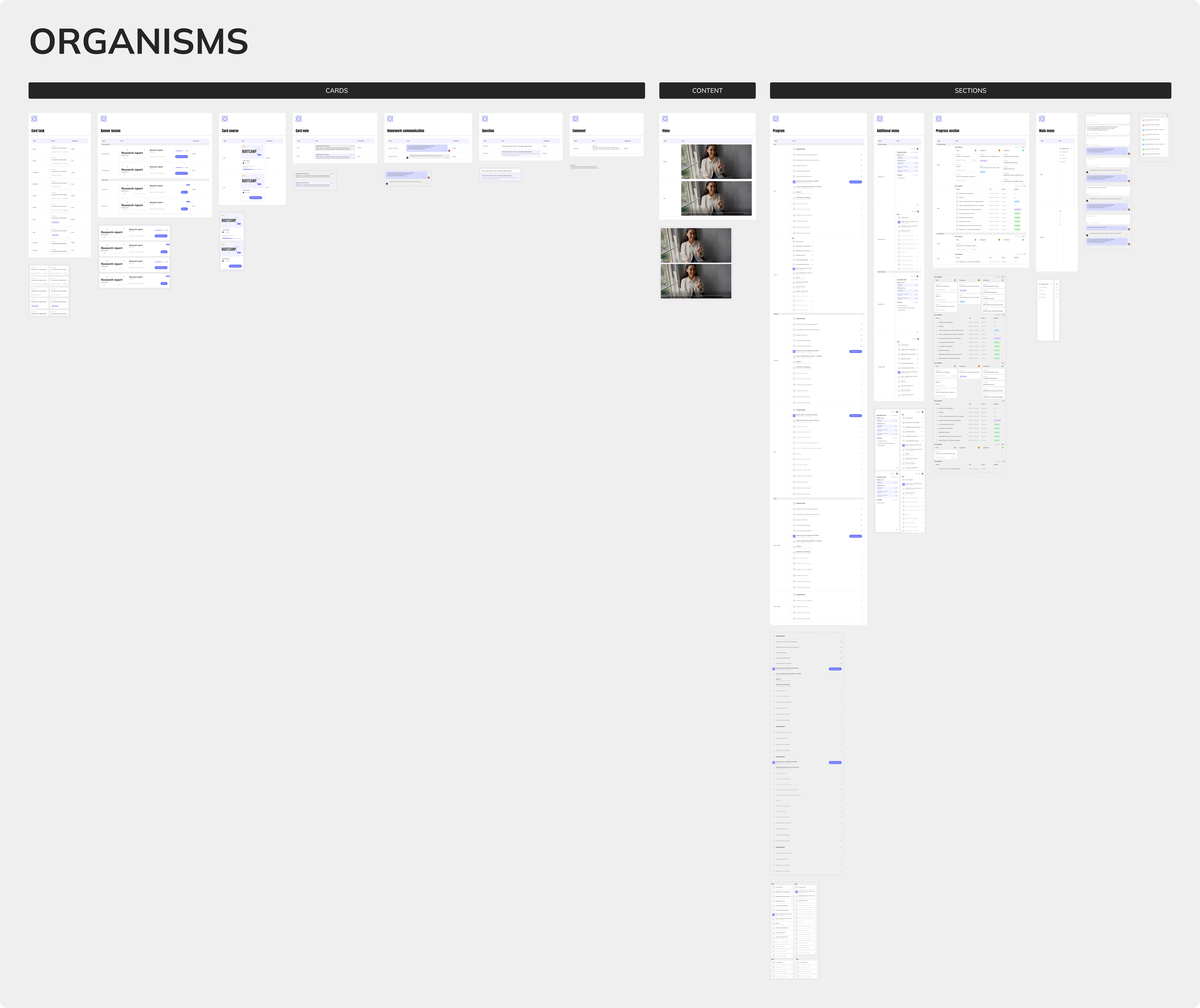 Design system – Organisms: complex UI structures such as cards, content blocks, and sections.