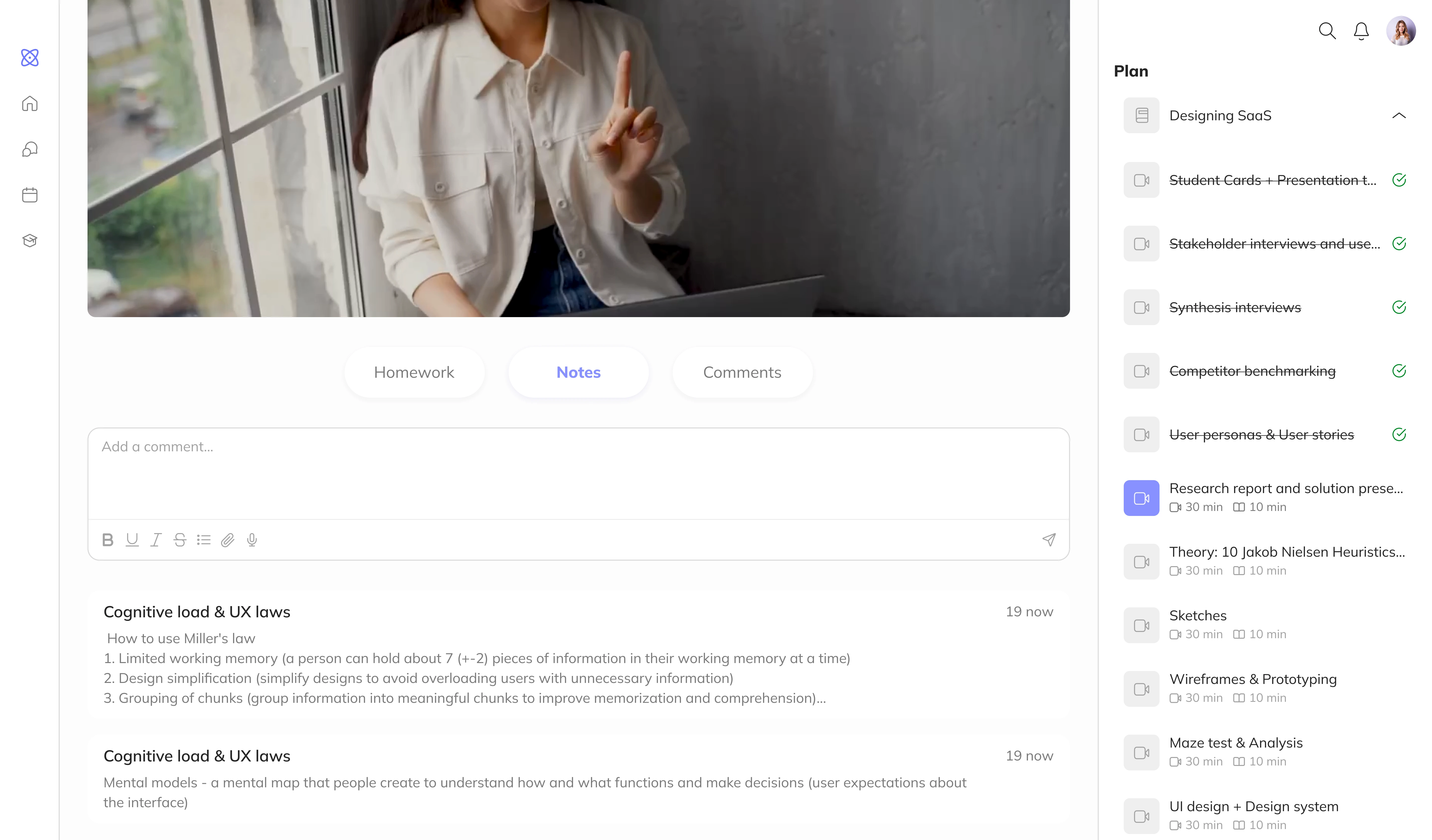Notes tab of a lesson page for saving key insights and references.