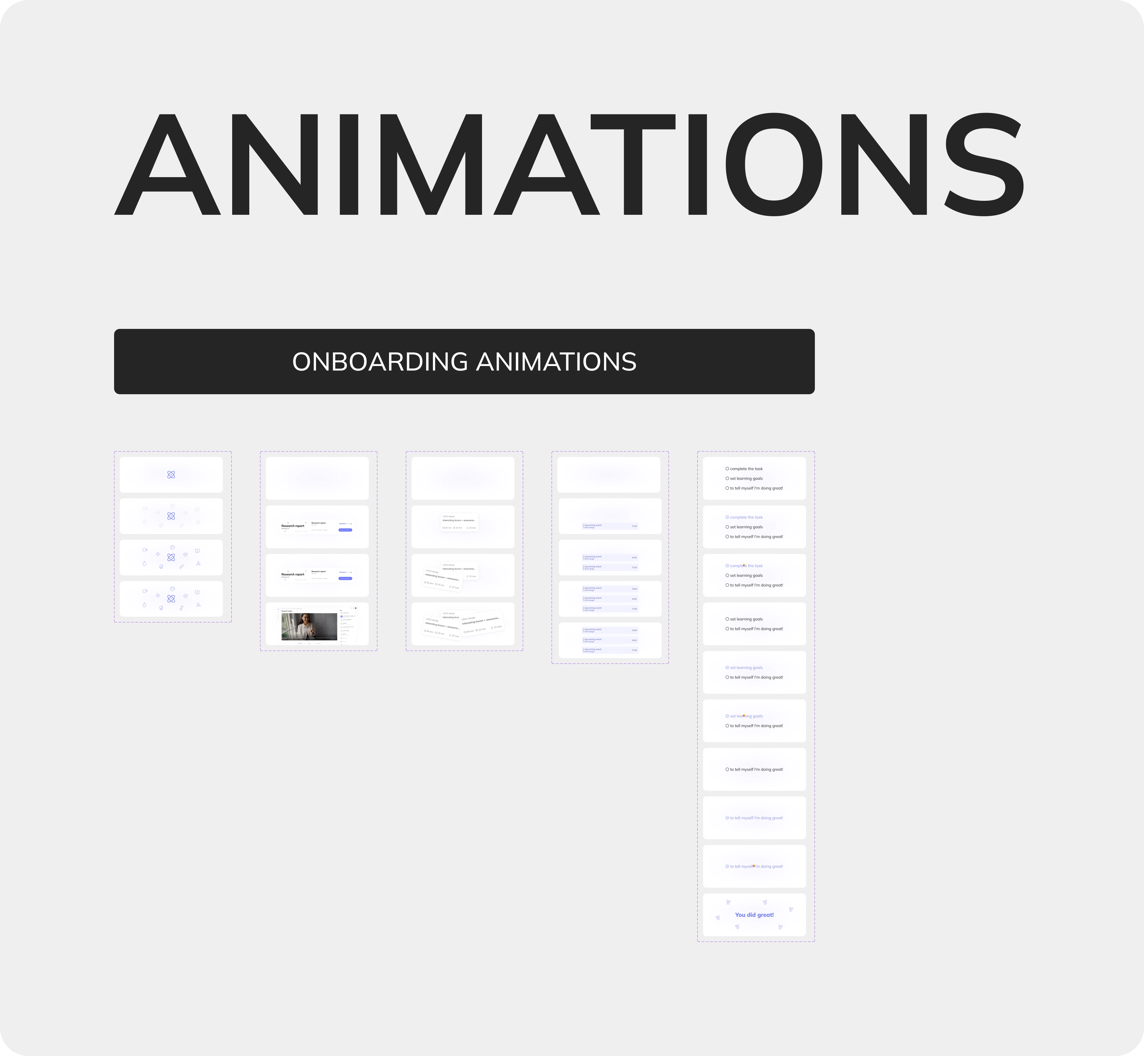 Design system – Animations: onboarding animations demonstrating platform interactions.
