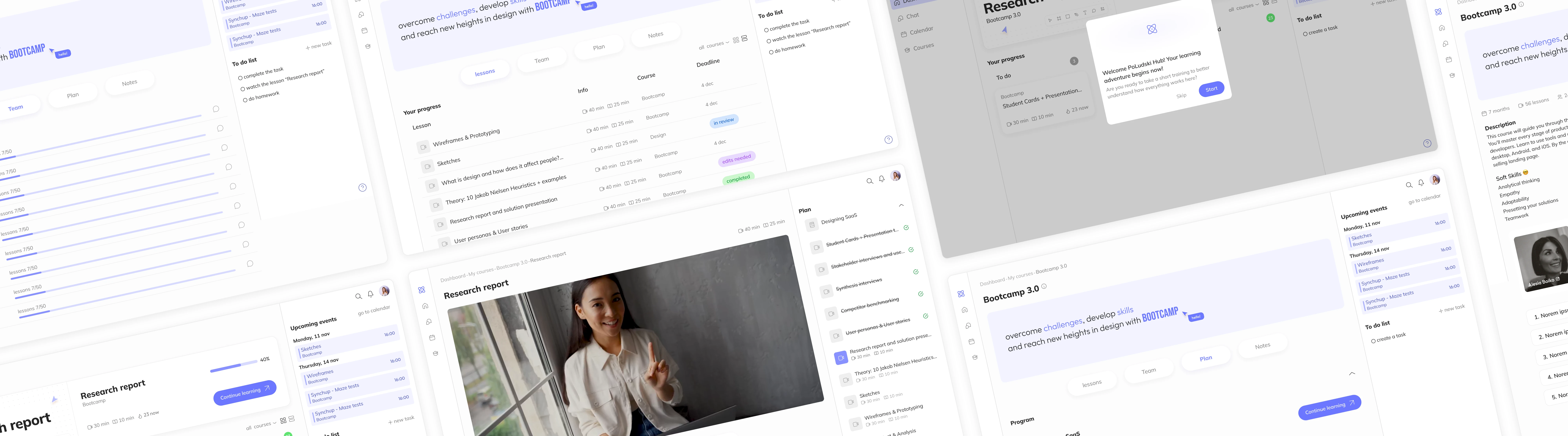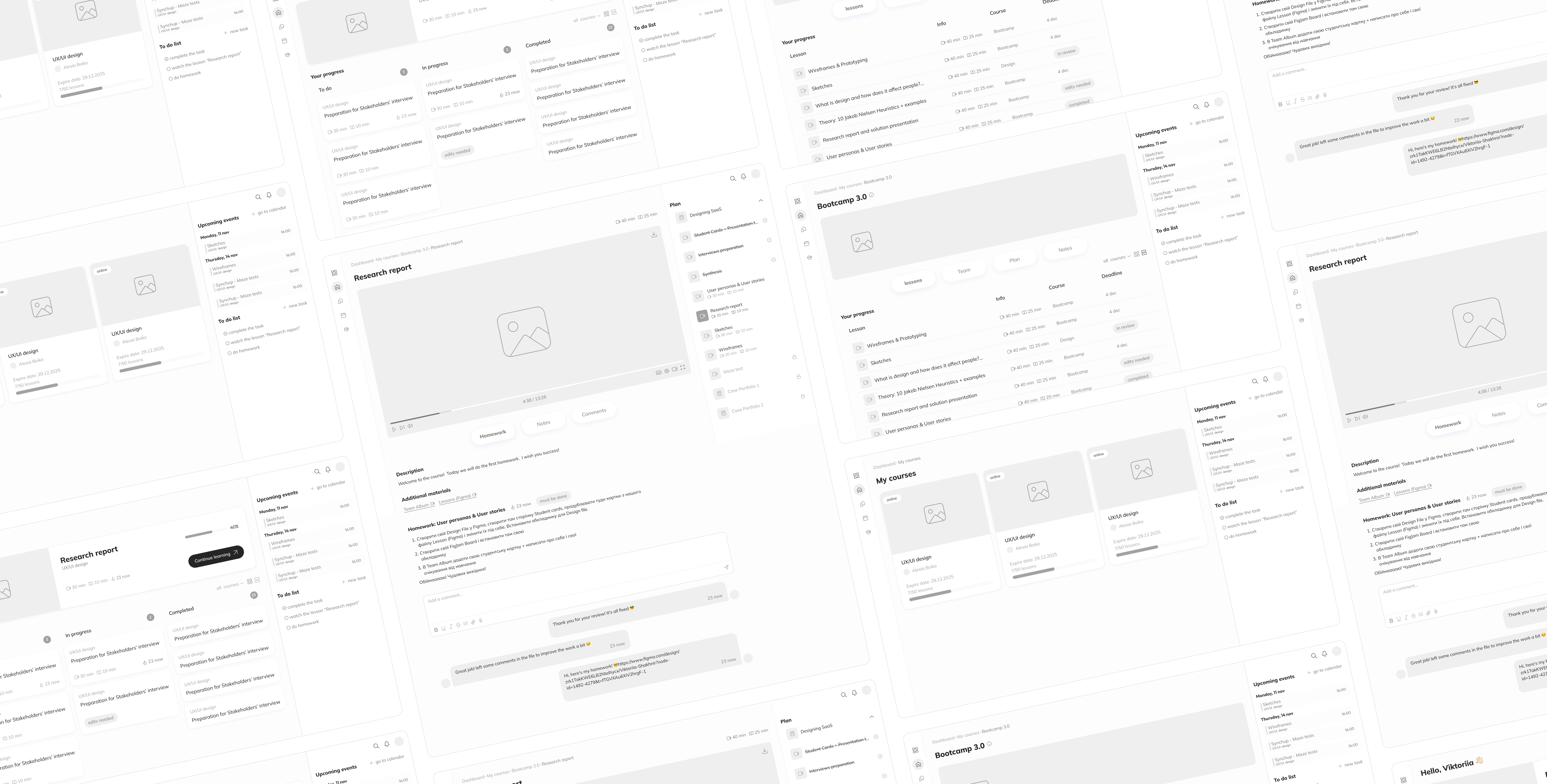 Set of mid-fidelity wireframes demonstrating core screens of the learning platform.