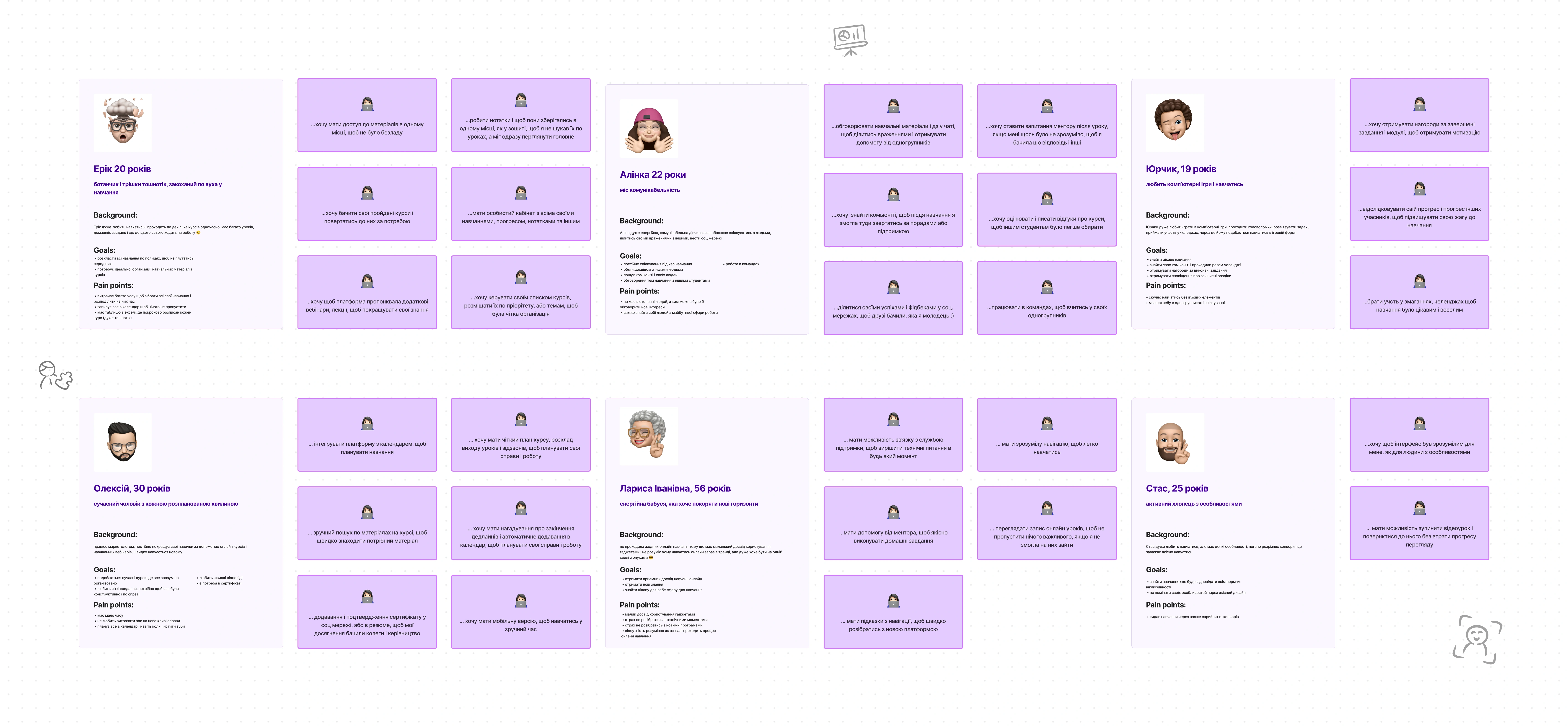 Personas representing target users with goals, pain points and backgroun