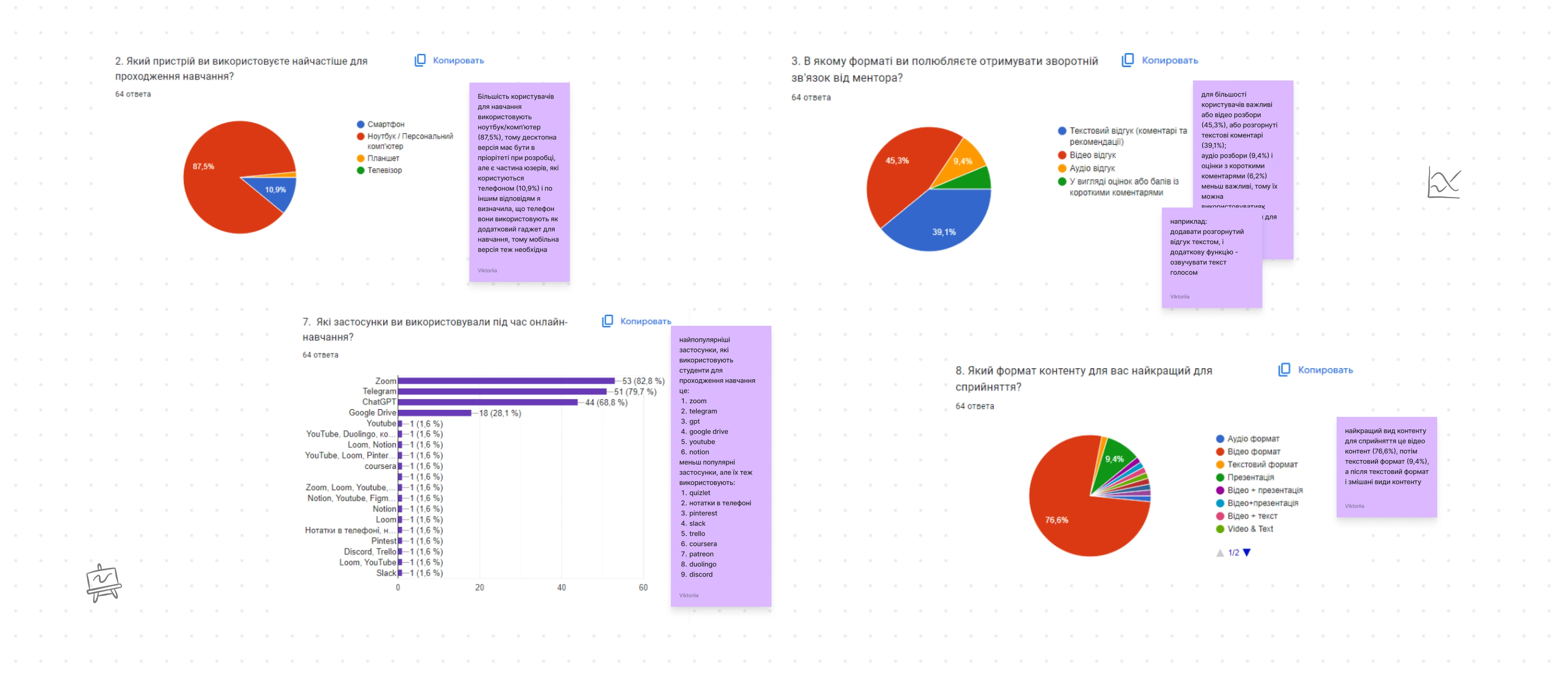 User survey results with key insights about learning habits and content preferences.