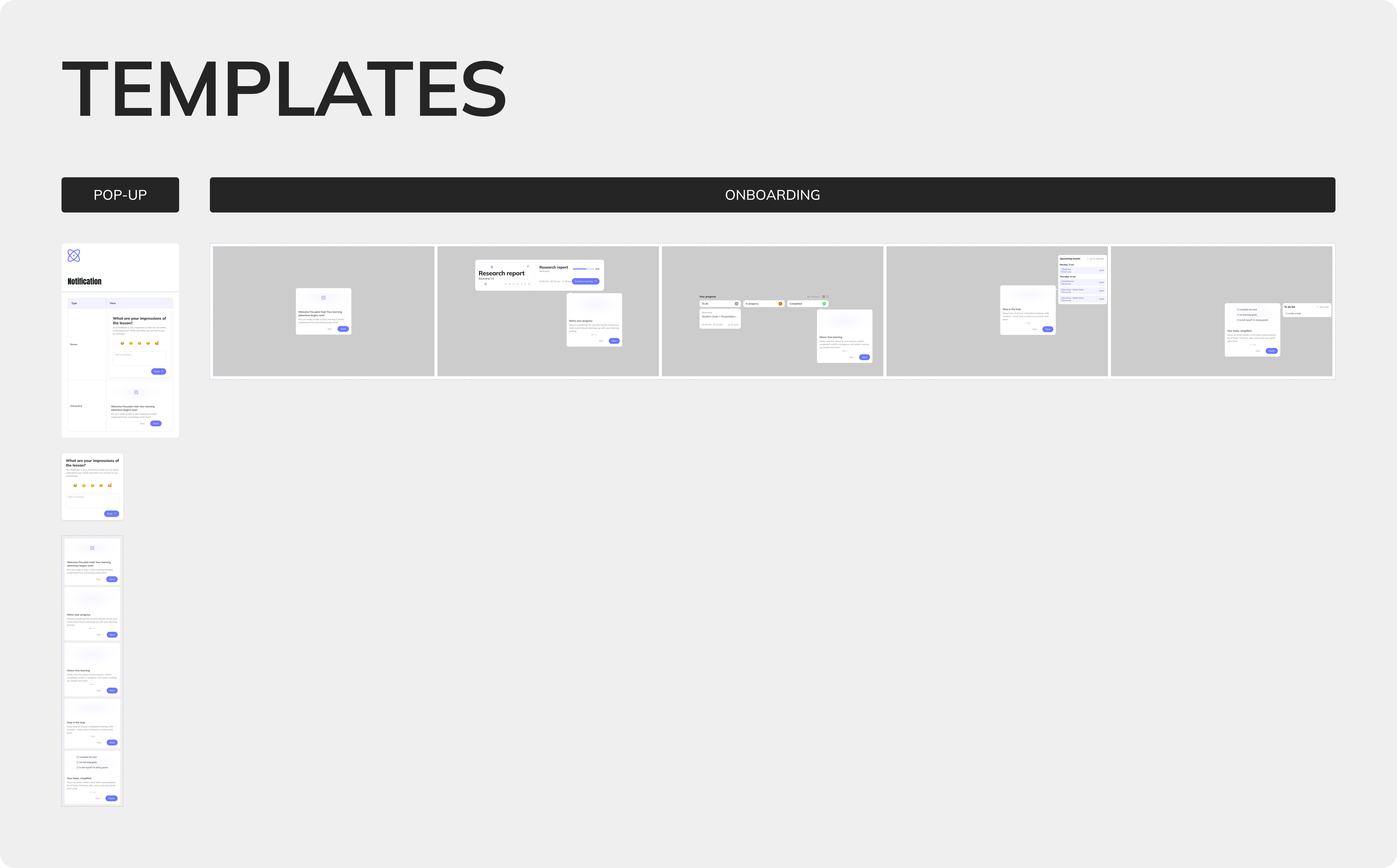 Design system – Templates: pop-ups and onboarding flows built from reusable components.