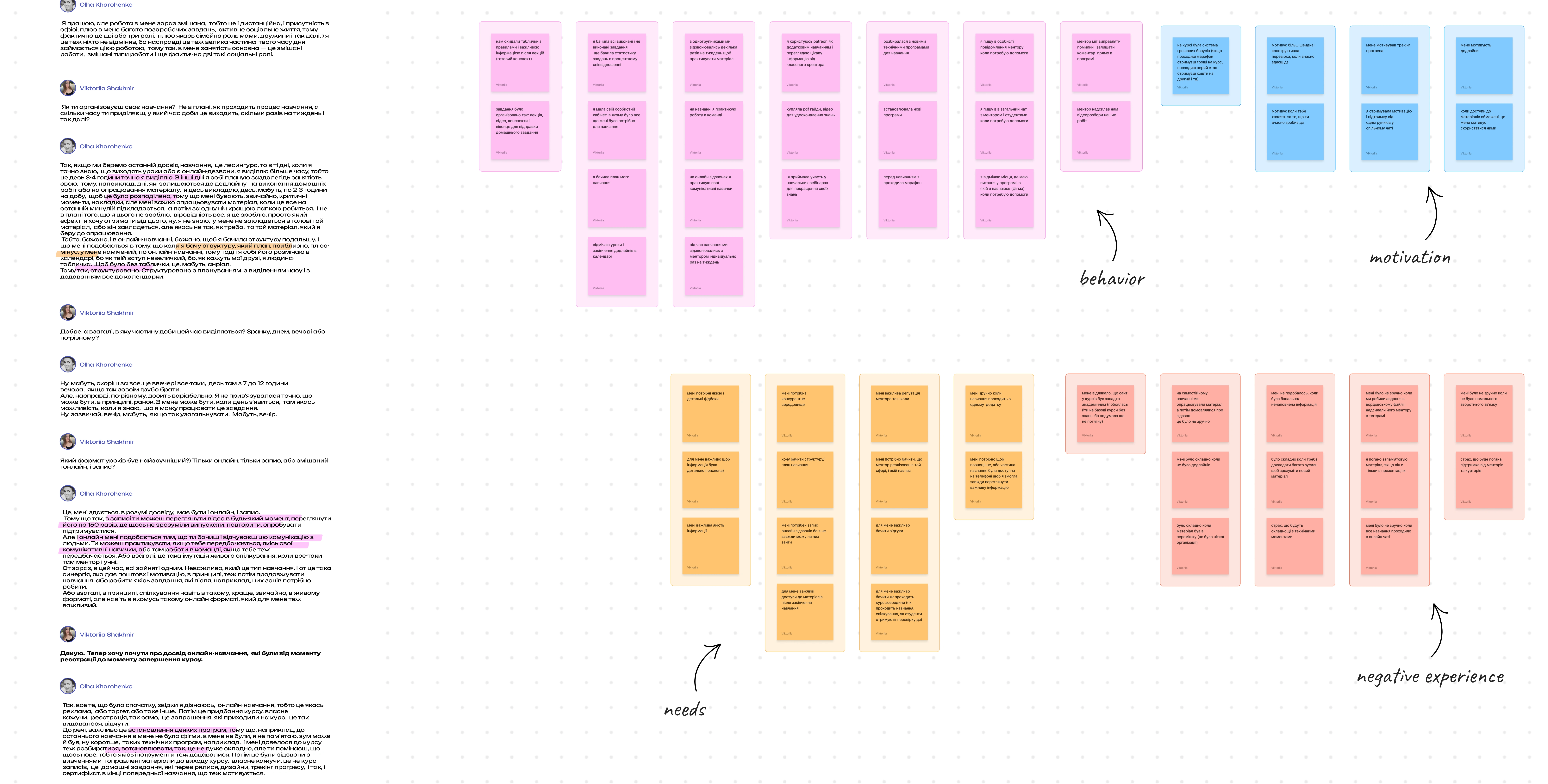 User interview analysis with grouped insights on behavior, needs, motivation and negative experiences.