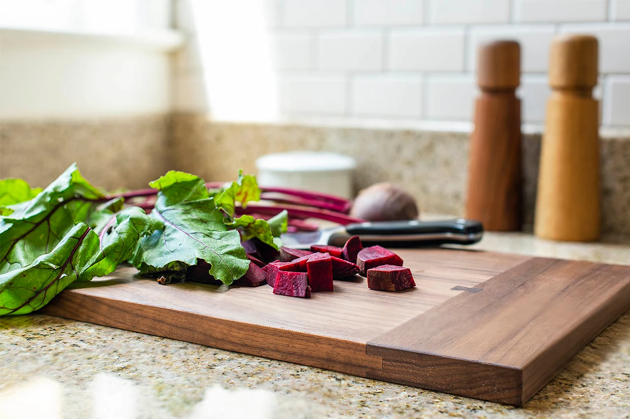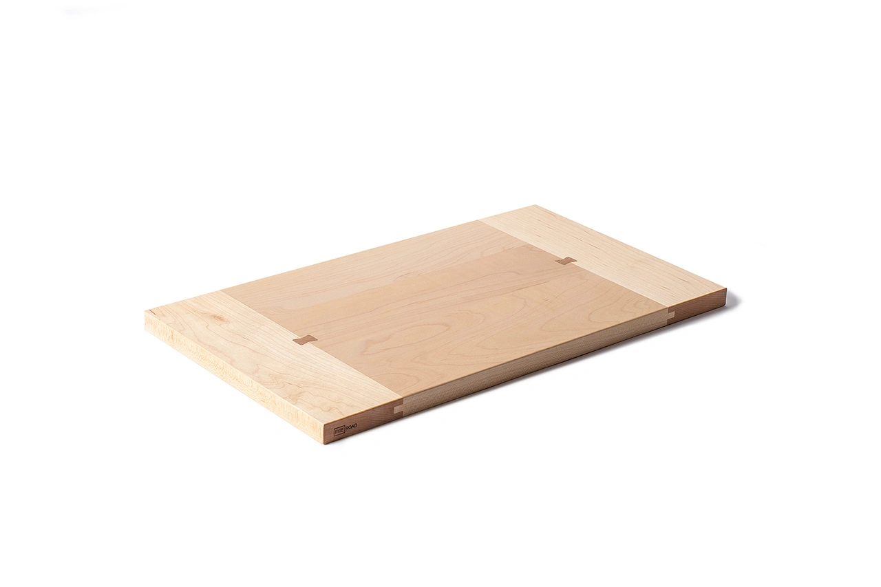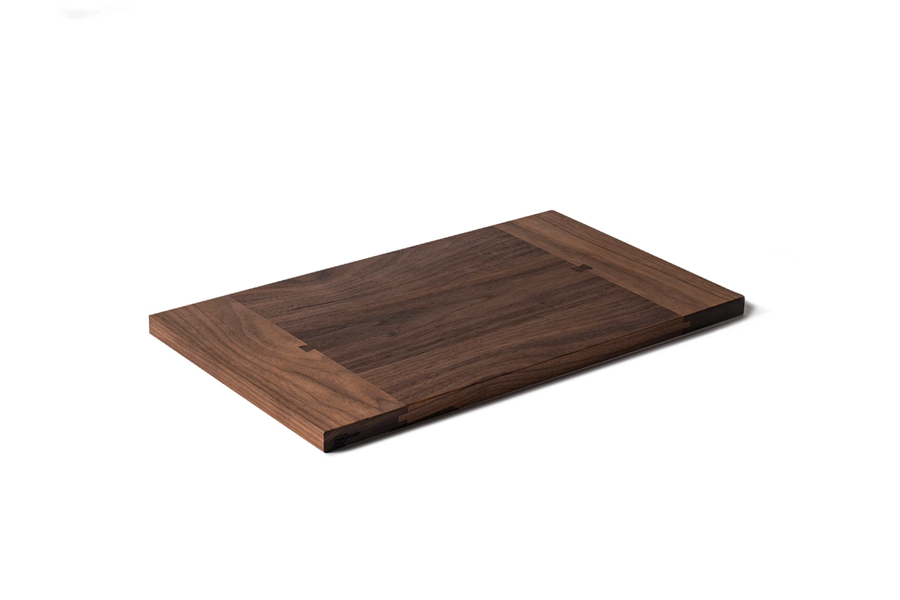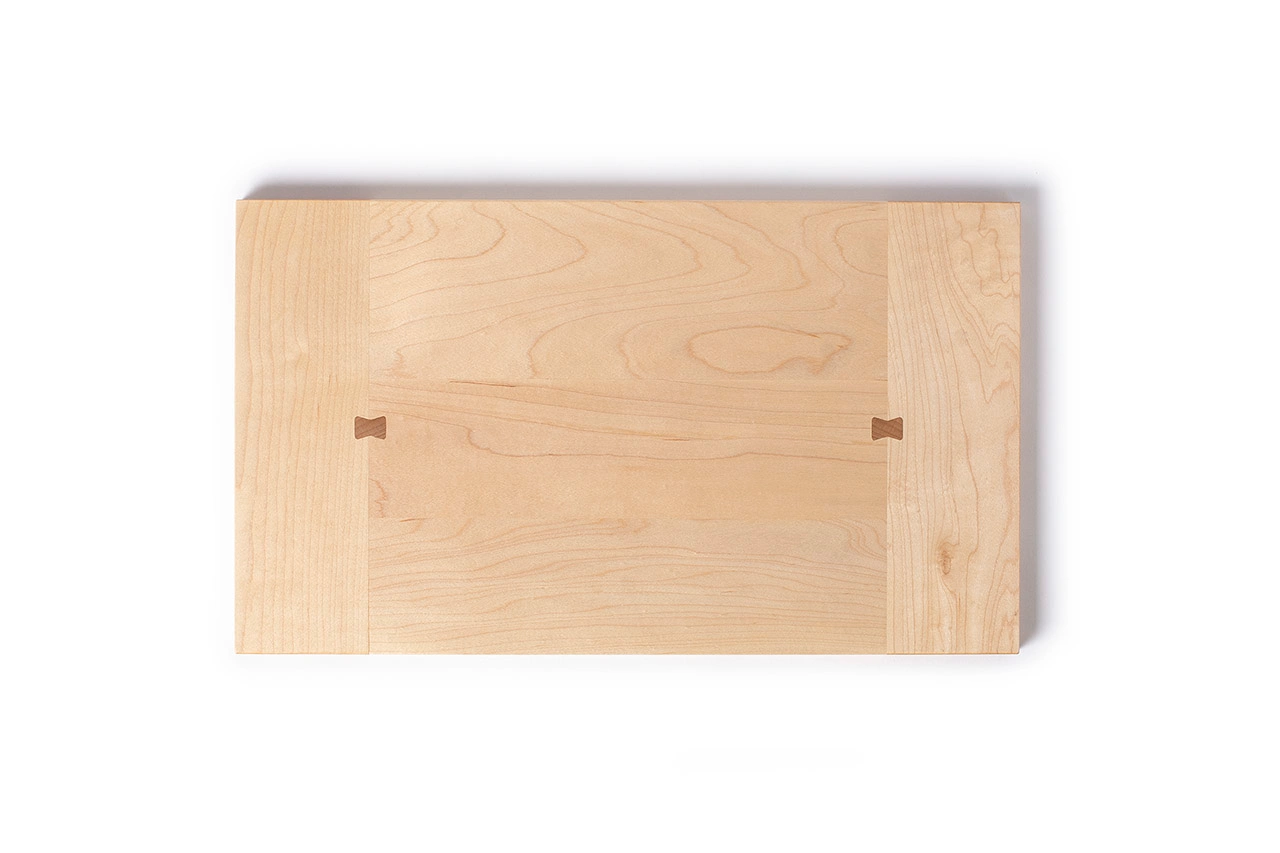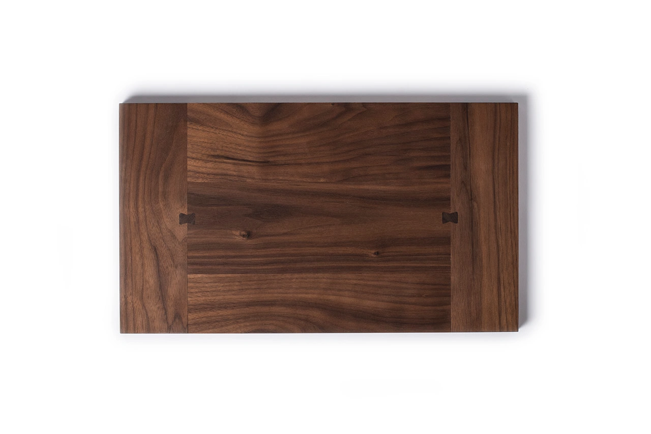 The Dovetail cutting board uses two butterfly keys to join the wood together to create a very stable and striking design. The three grain directions of the wood help to prevent warping and keep the wood from absorbing too much moisture. A fresh take on the Shaker Style board, the Dovetail Board uses advanced manufacturing to CNC carve each butterfly key, giving a traditional craft detail to this modern cutting board. Whether you are chopping in a production kitchen or serving up feast at home, this solid wood board is up to the task in style. The Dovetail Board is handmade in San Francisco from North American walnut and maple.