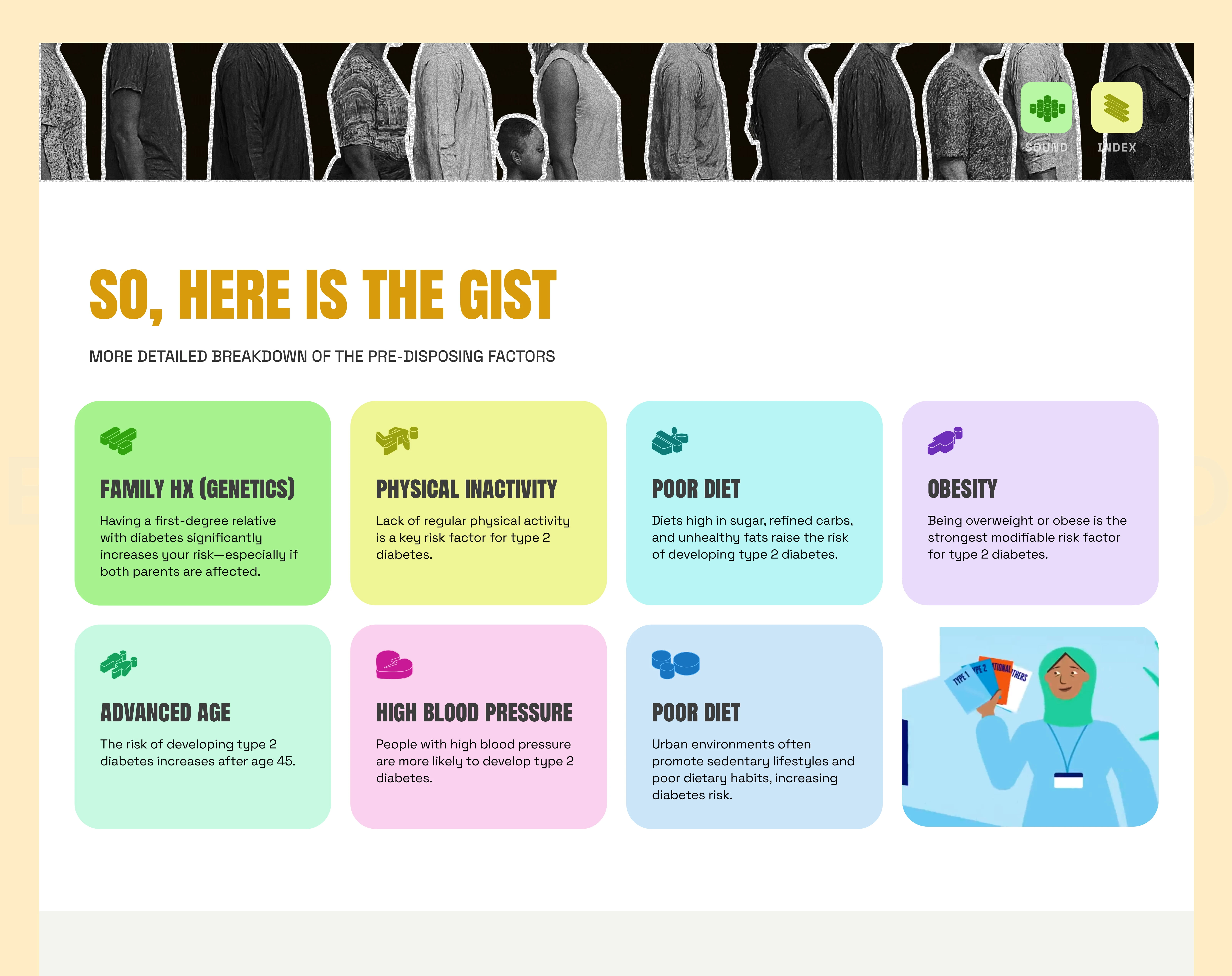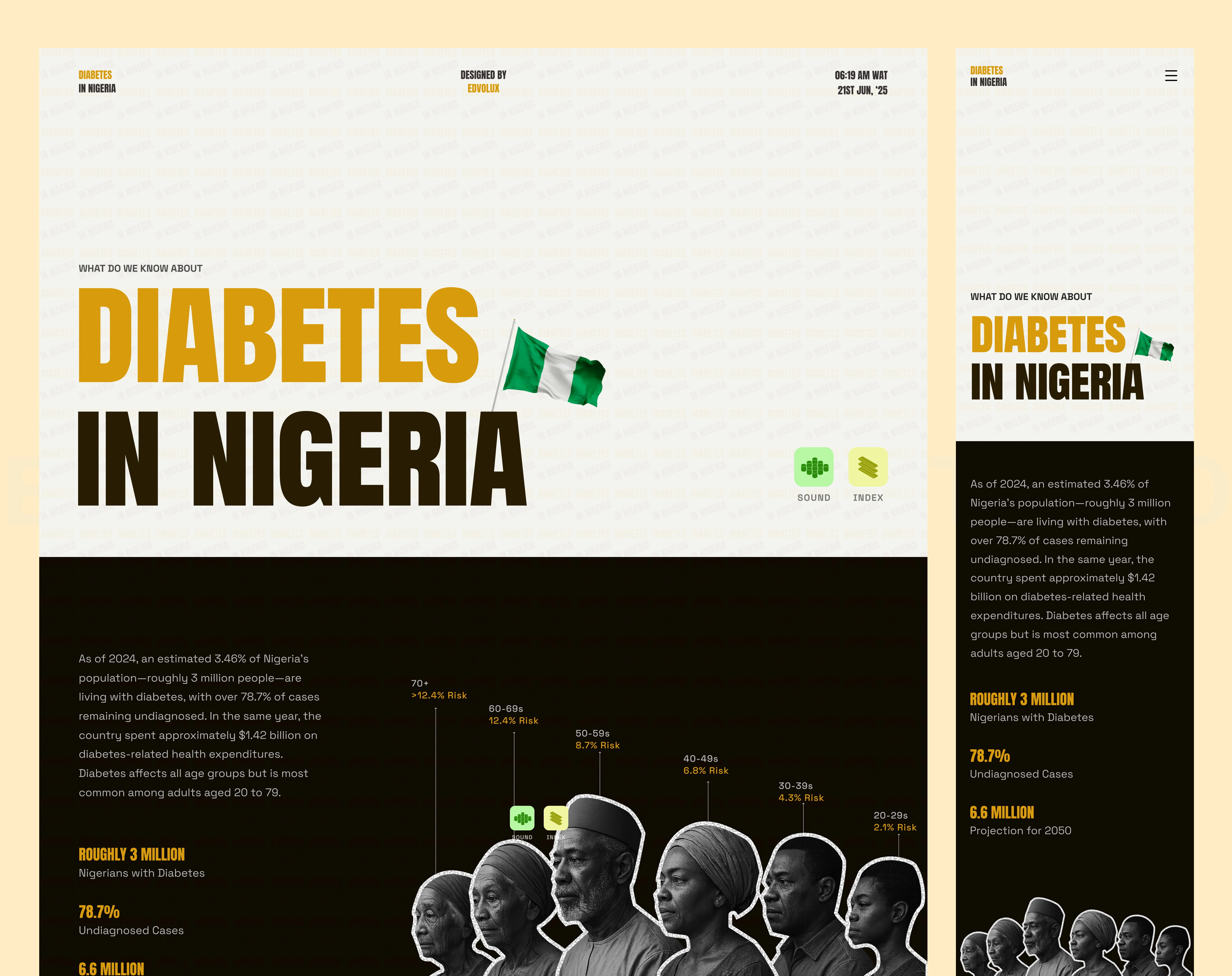Diabetes Nigeria is an educational website designed to make learning about diabetes simple, approachable, and engaging. The goal was to remove fear, complexity, and medical jargon from health education and replace it with clear information, friendly language, and an interactive experience that encourages learning rather than overwhelm.