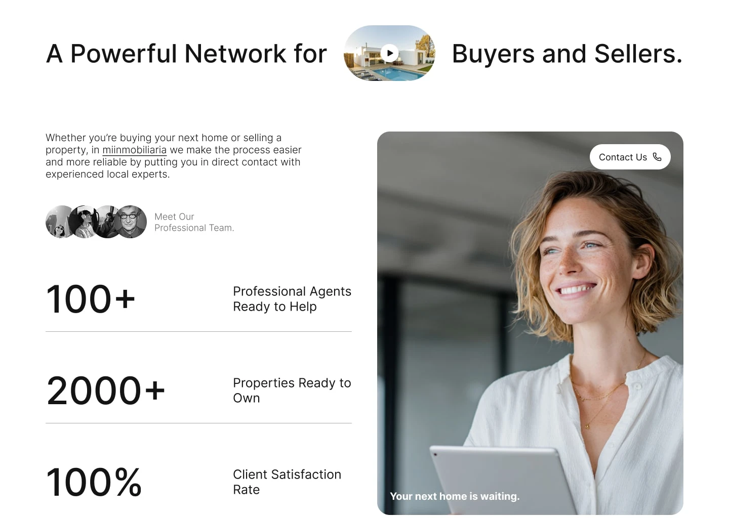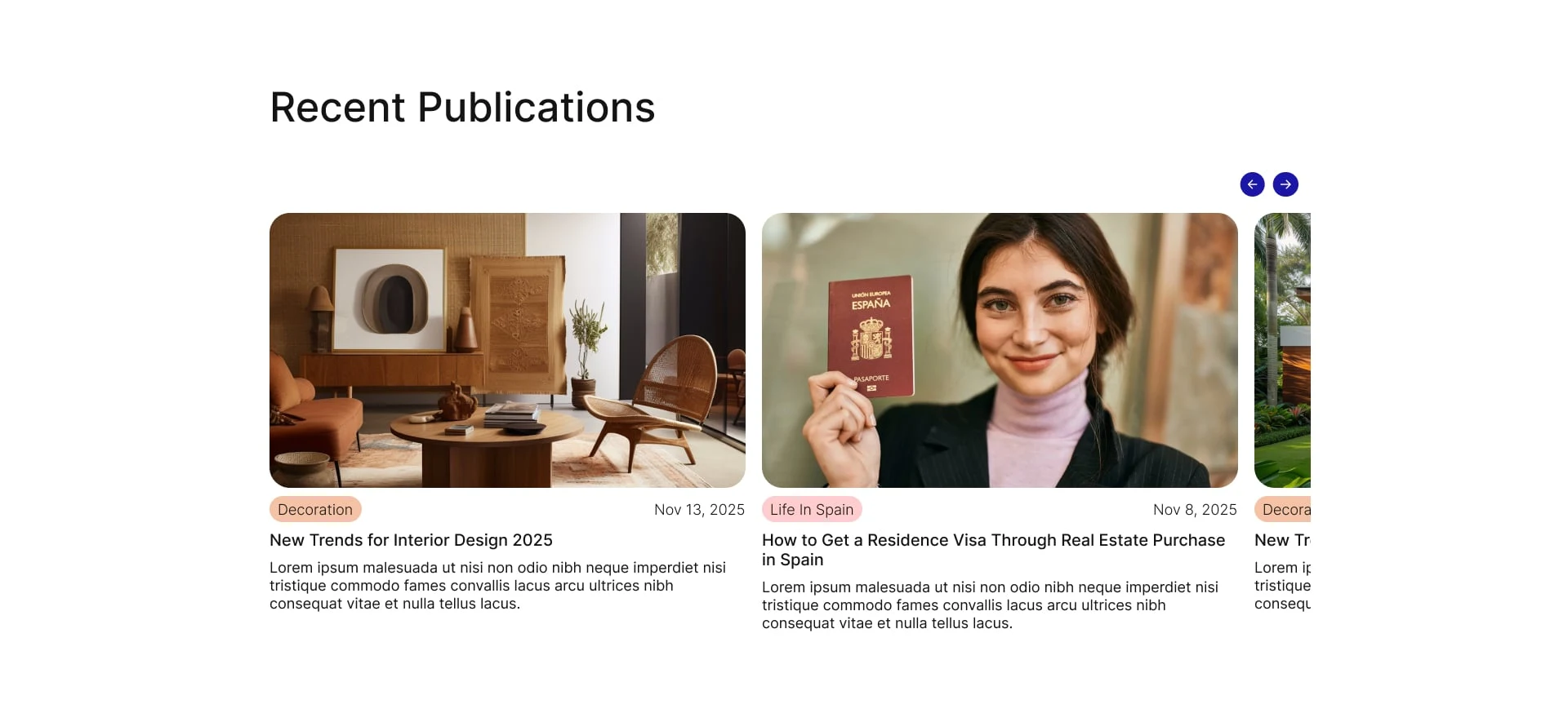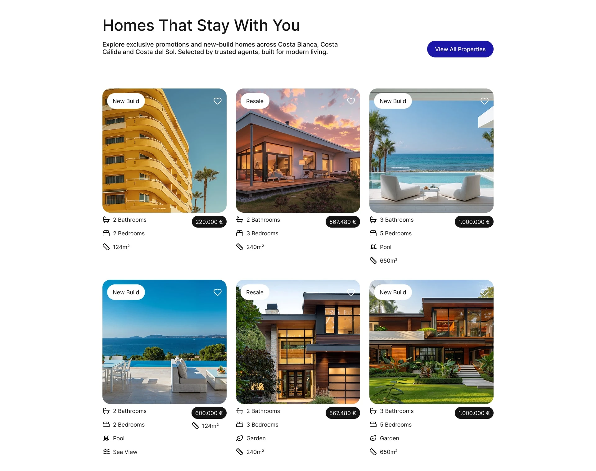 For the development of this design, a minimalist and functional approach was chosen: Clean UI: Use of ample white space and a neutral color palette to highlight the architectural photography. Information Architecture: A "Hero Section" was designed with a simplified search engine to reduce the user's cognitive load from the very first second. Modular Components: Creation of dynamic property cards that display key information (square meters, number of rooms, price) in an iconographic and structured way. Engagement & Trust: Integration of social proof sections (testimonials) and an informative blog ("Recent Publications") to position the brand as an authority in the Spanish real estate market.