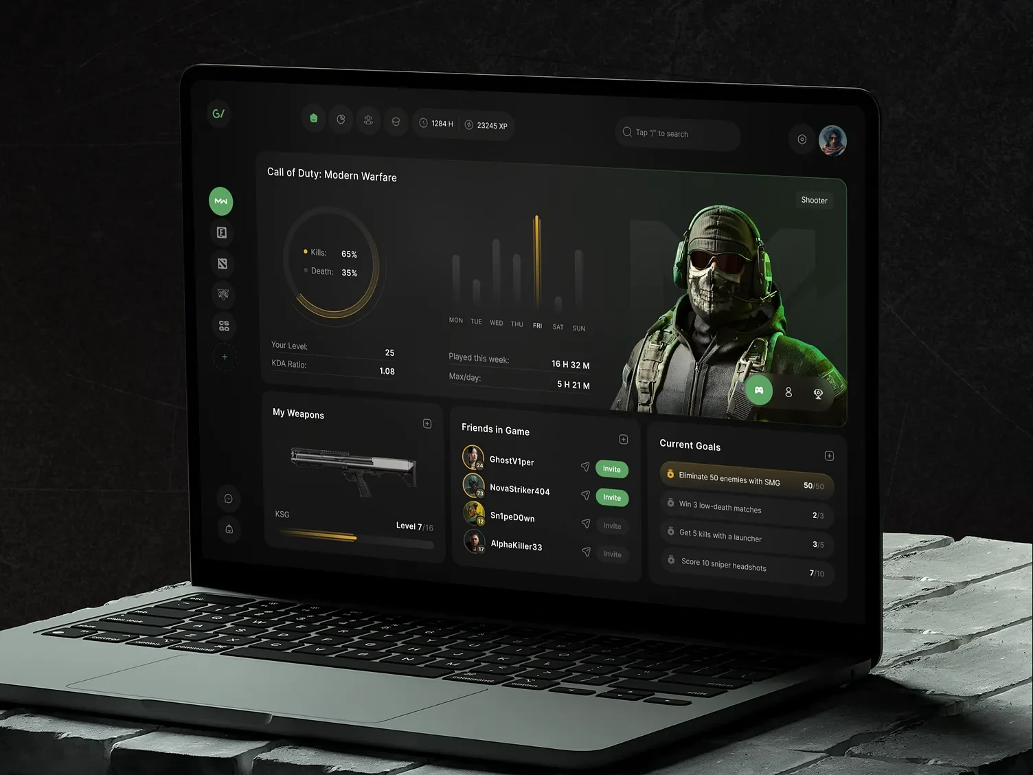 Easily switch between games, check your weekly activity, monitor your K/D ratio, complete custom challenges, and follow your friends' progress. Everything is organized in one clean and focused interface. No more hunting through scattered menus or relying on third-party tools.