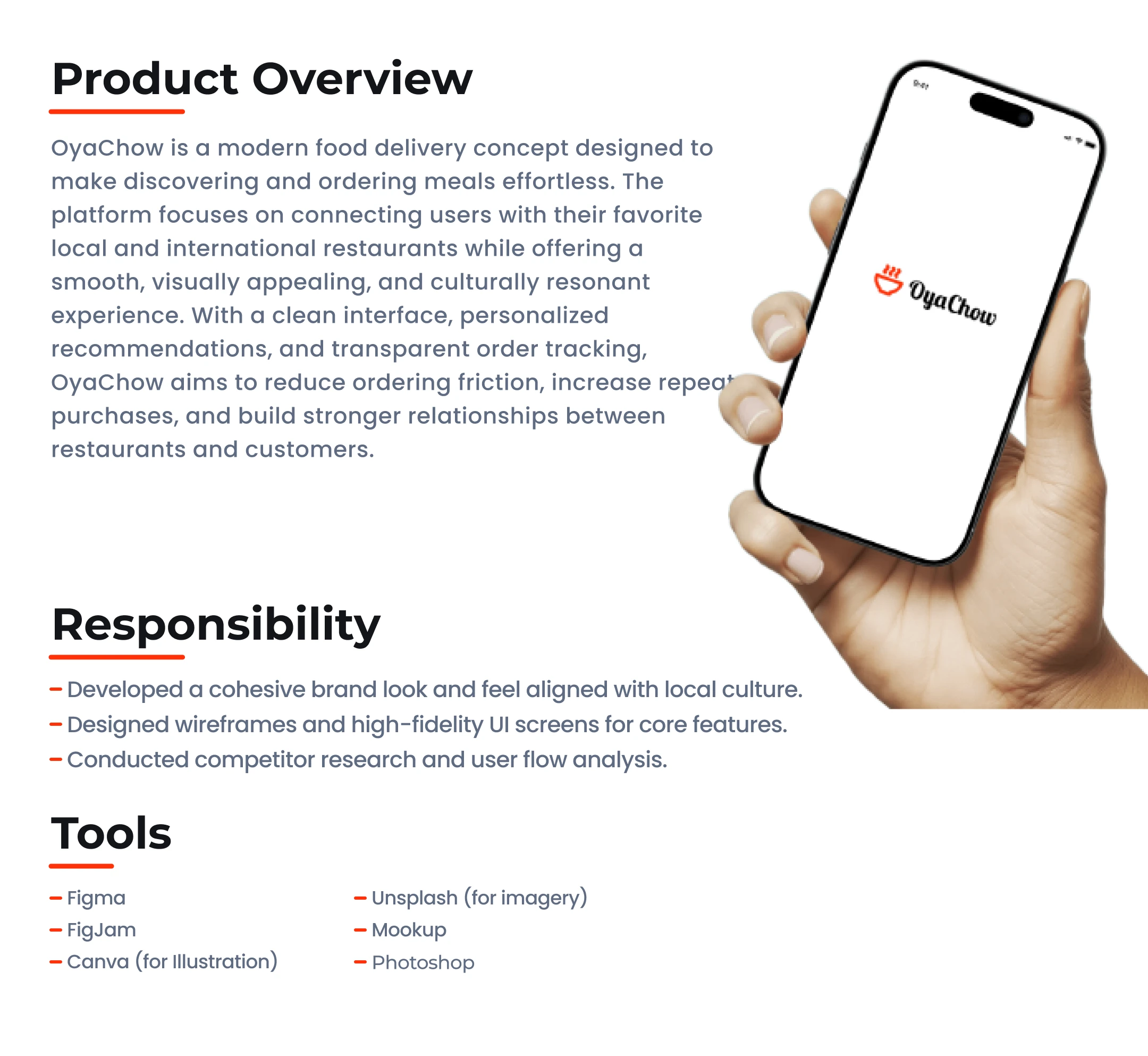 OyaChow is a food delivery platform I designed with the goal of making food ordering fast, reliable, and enjoyable for both customers and restaurant partners.