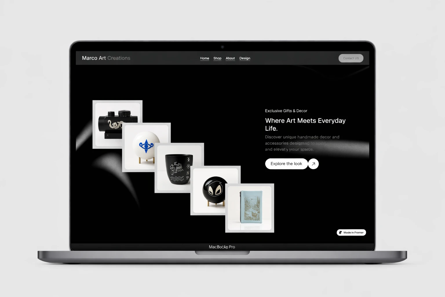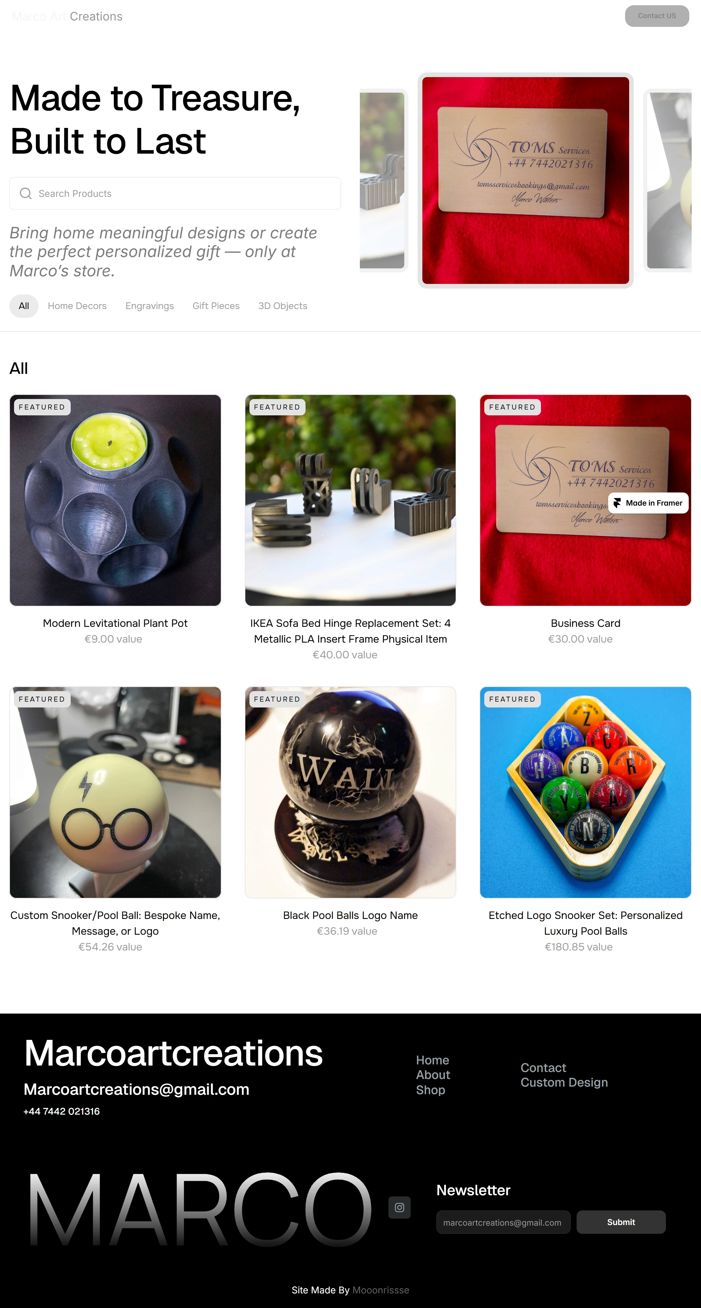 Built in Framer, this portfolio captures Marco’s bold approach to custom engraving and 3D creation—where materials, detail, and design merge into memorable physical pieces.