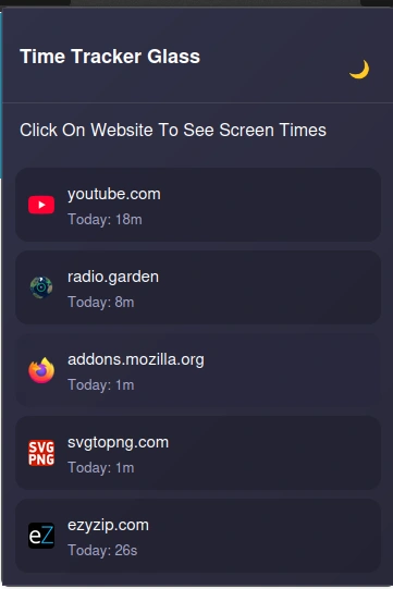 I developed Time Tracker Glass, a lightweight and privacy-friendly Firefox extension that helps users monitor how much time they spend on different websites — just like Digital Wellbeing on Android, but for the desktop browser.