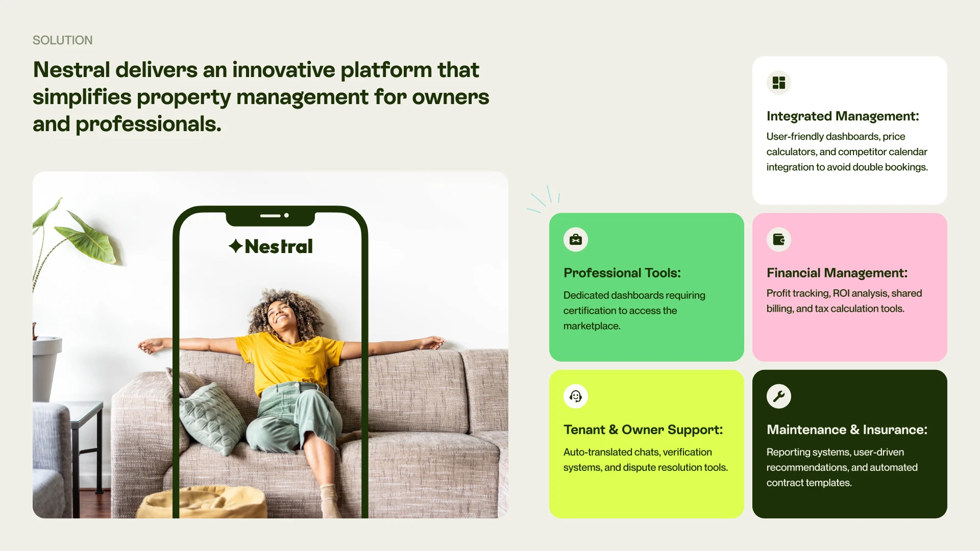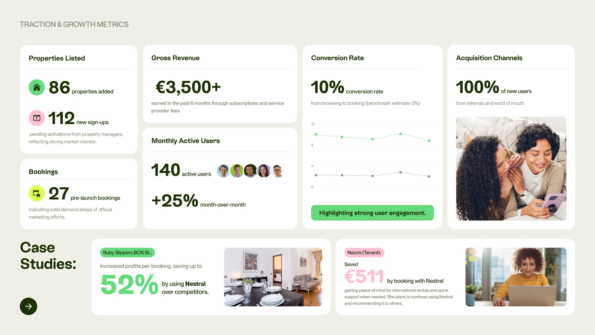 Built in Figma, the 16-slide deck featured clean layouts, warm colors, human-centric imagery, and custom visuals. Product UI, revenue breakdowns, and market expansion graphics anchored the story in real context.