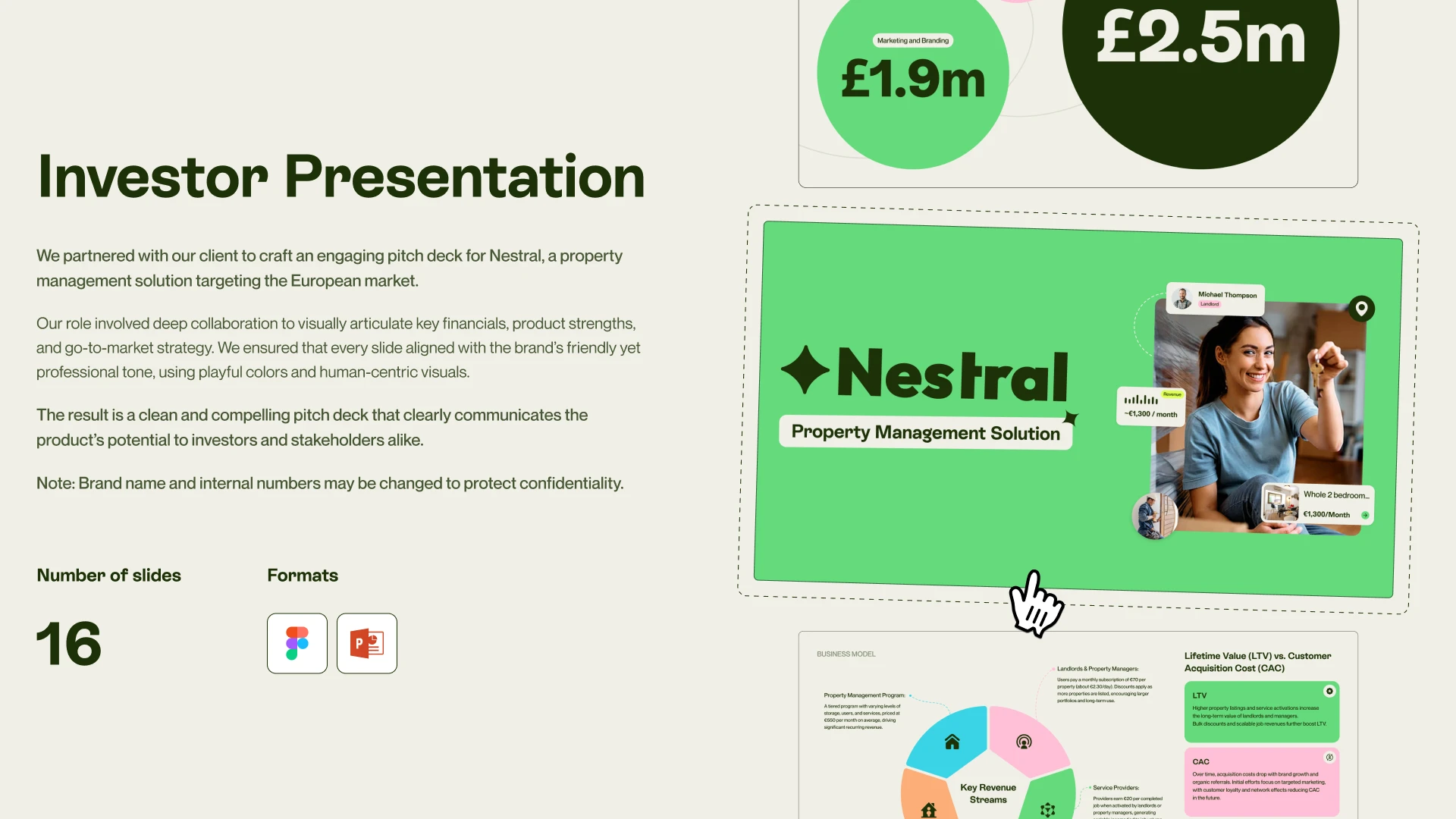 The result was a professional, investor-ready presentation that simplified complex data, highlighted growth potential, and strengthened the client’s credibility.