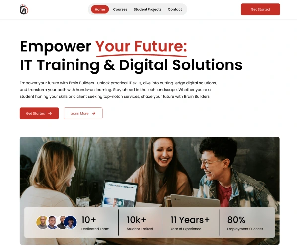 Brain Builders I.T Firm is a technology and training company focused on delivering high-quality digital education and IT solutions. With a mission to empower individuals and communities through practical, accessible tech training, the organization has trained over 500 individuals and partnered with several organizations to extend its reach. The redesigned website showcases student projects, organizational partnerships, and lays the foundation for future e-learning services including recorded courses and diaspora training.