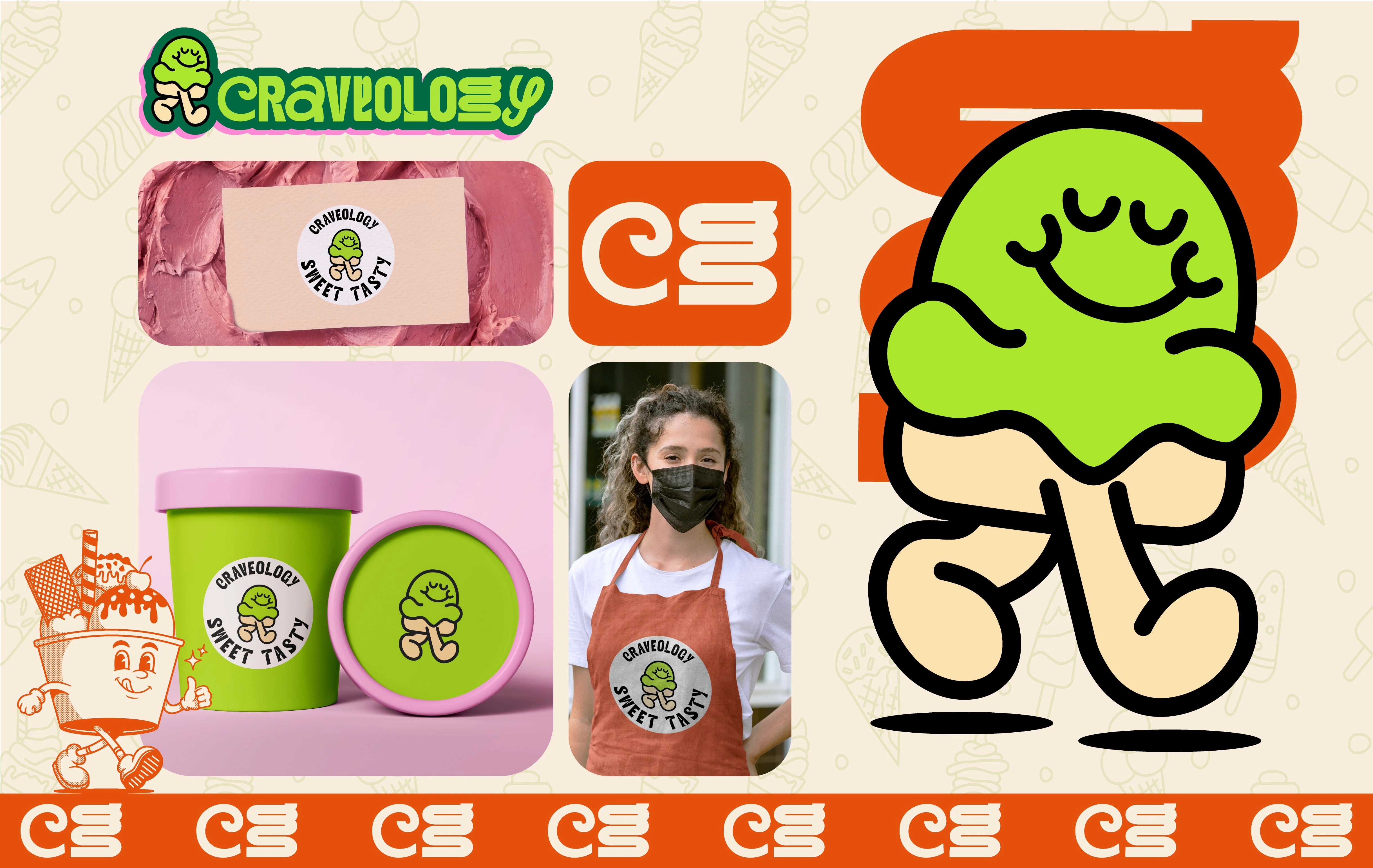Logo: Custom typography in rounded, bubbly forms (e.g., "Cravology" with layered green/pink outlines). Versatile: Primary (full wordmark), Secondary (CS monogram), Icon (smiling scoop mascot). Color Palette: Lime Green (#A8E6CF) for zest, Pastel Pink (#F7CAC9) for sweetness, Cream (#FFF8E7) for indulgence, Charcoal (#2C3E50) for grounding. Typography: Playful sans-serif (e.g., custom "C" with ice cream drip) + clean modern body (e.g., Montserrat). Mascot: "Scoop"—a happy, green ice cream character embodying quirky charm and brand recall.