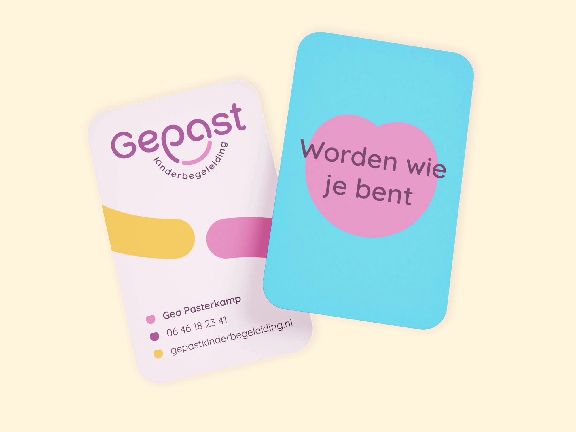 A brand new visual identity and website for Gepast Kinderbegeleiding, a company focusing on child care and pedagogical work. Their slogan 'Worden wie je bent' translates to 'Become who you are' and is centered in the brand strategy. This is translated to a colorful and warm identity.
