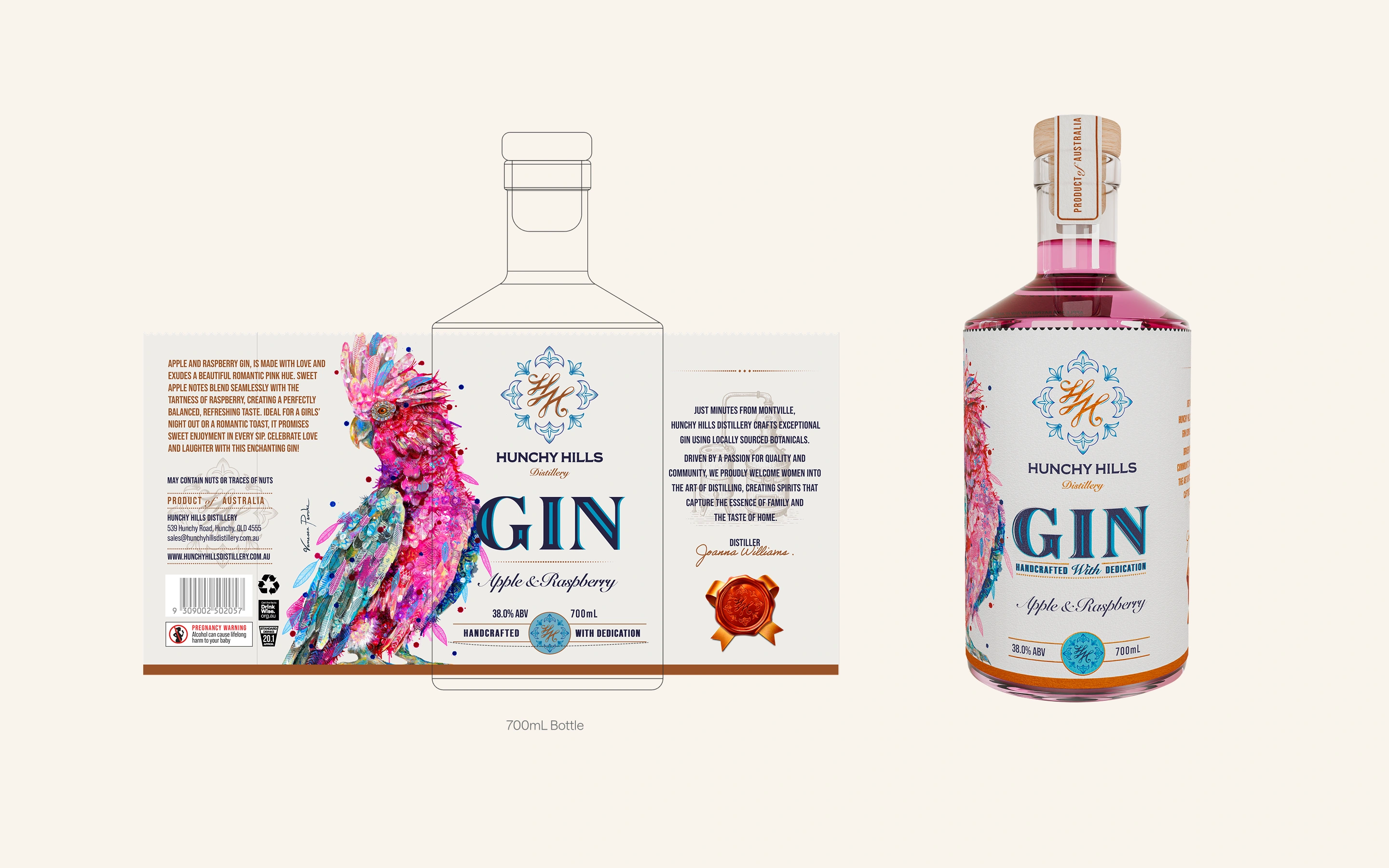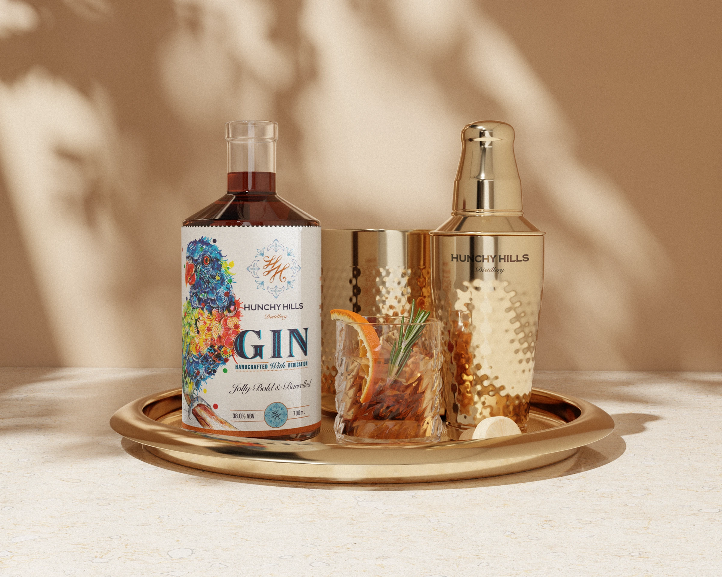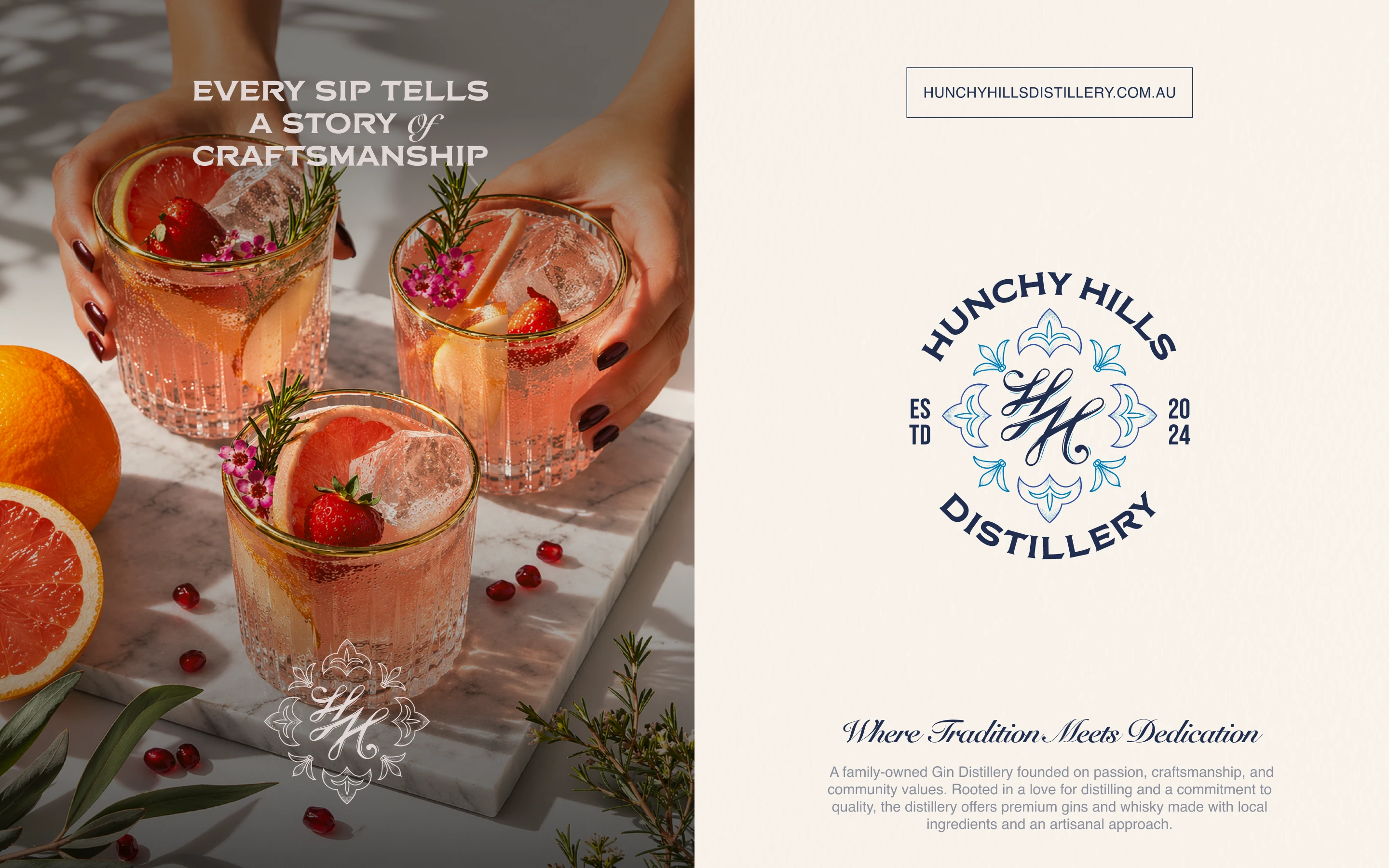 Hunchy Hills is a small craft gin distillery in the Queensland hinterlands, founded by a woman in her fifties who decided to start something bold in a competitive market. When she came to me, she'd already been through a rough experience with another designer. A big invoice, a generic result, and a brand that felt too masculine for what she was building. She knew exactly what was wrong with it, which made my job easier.