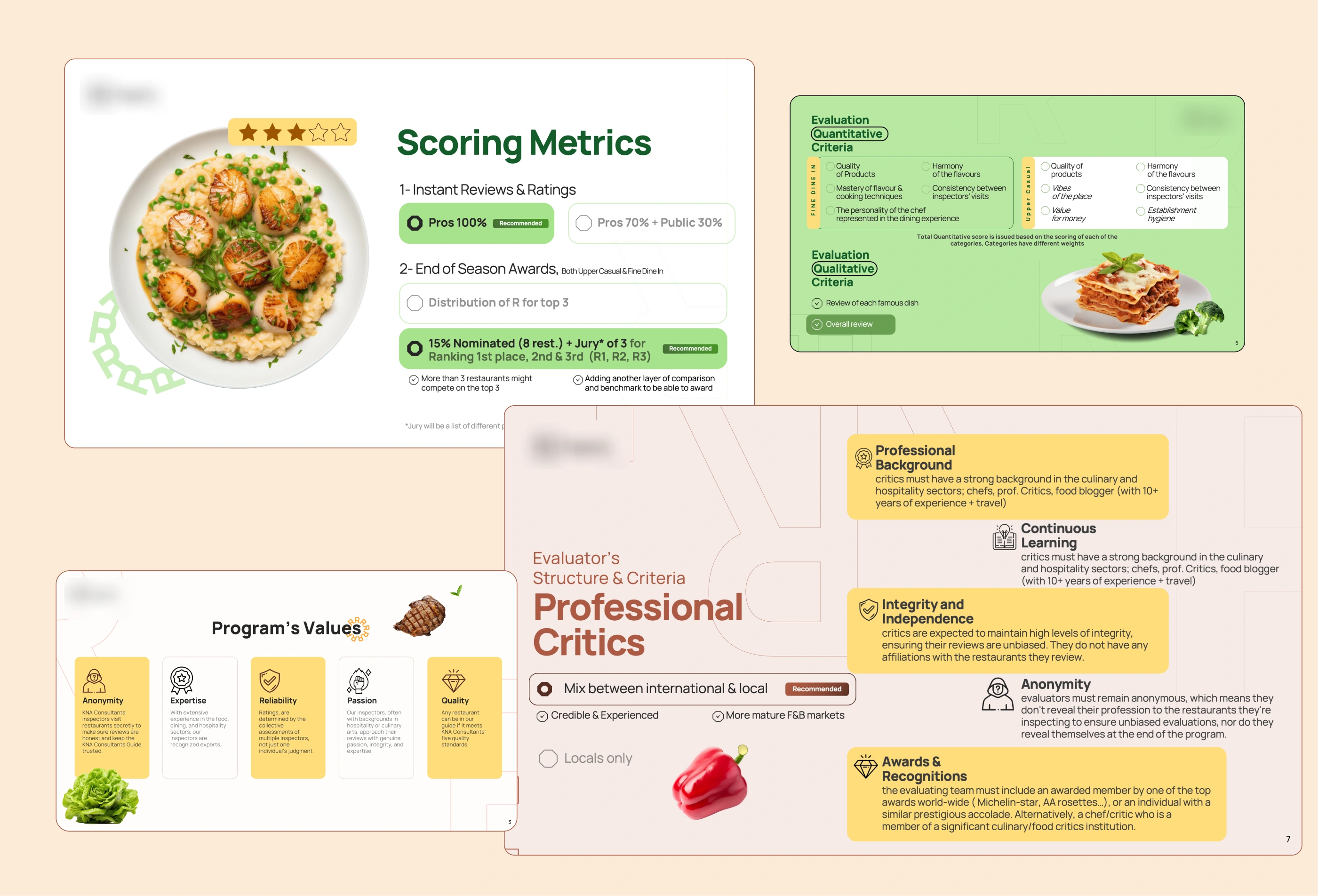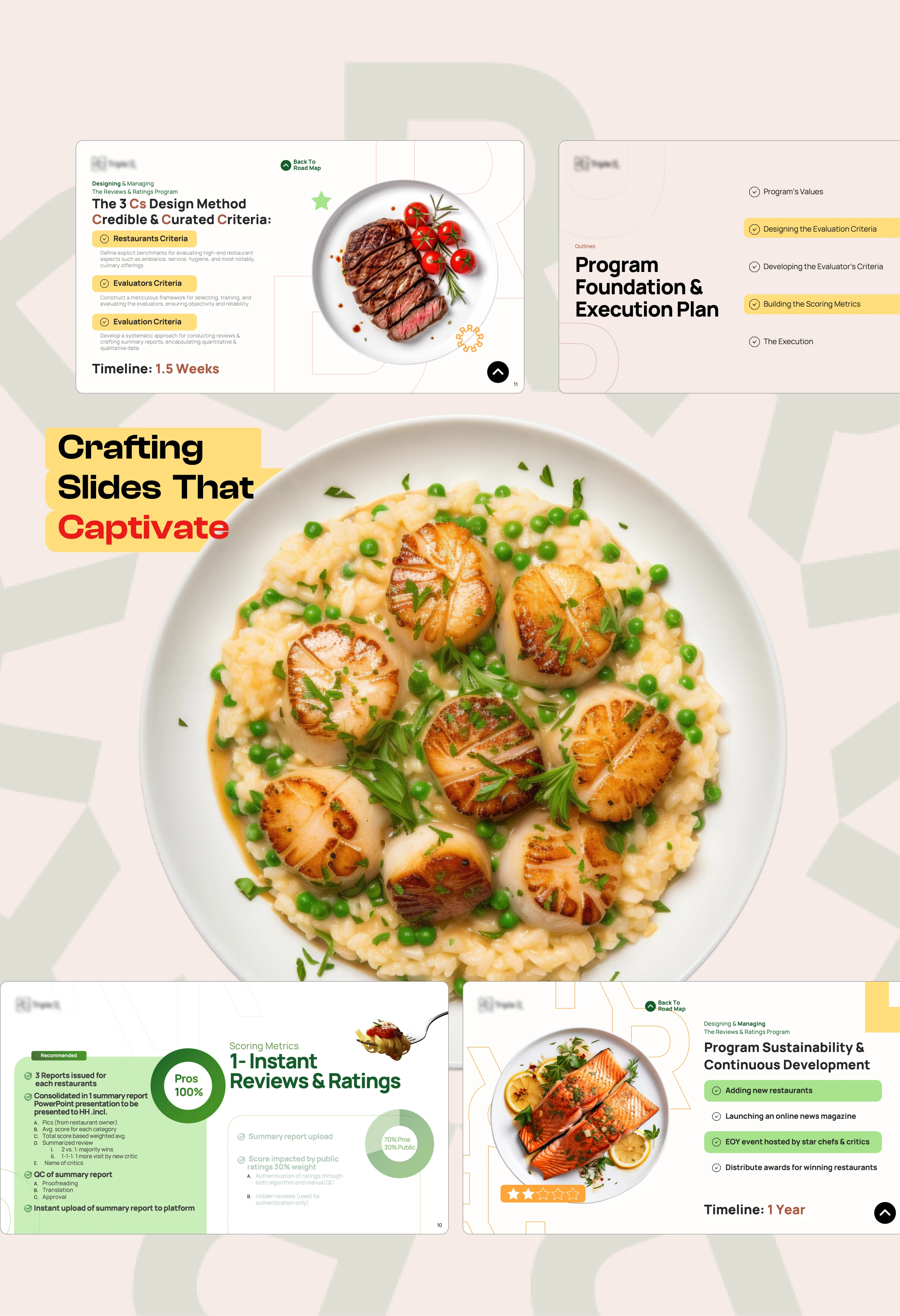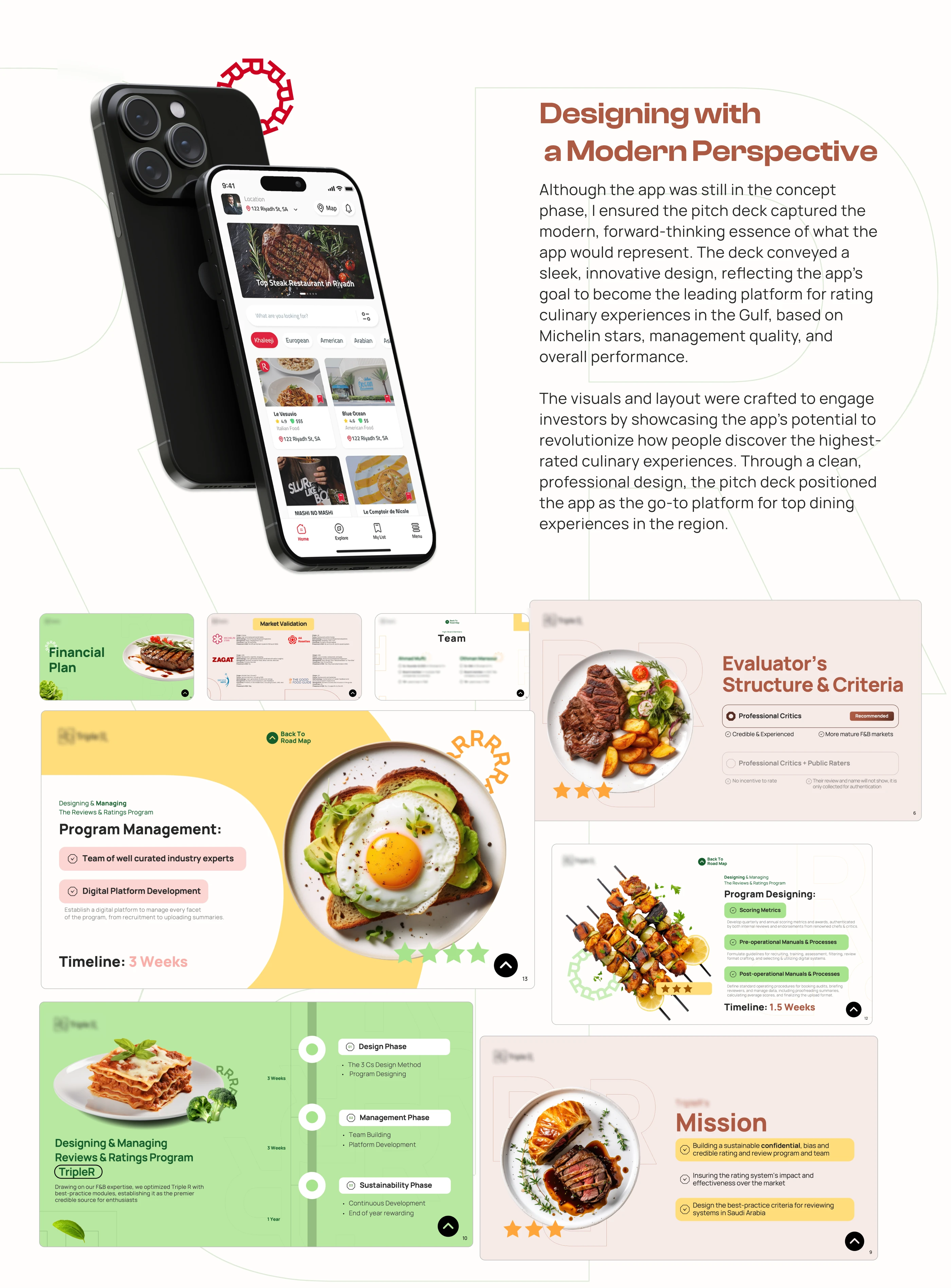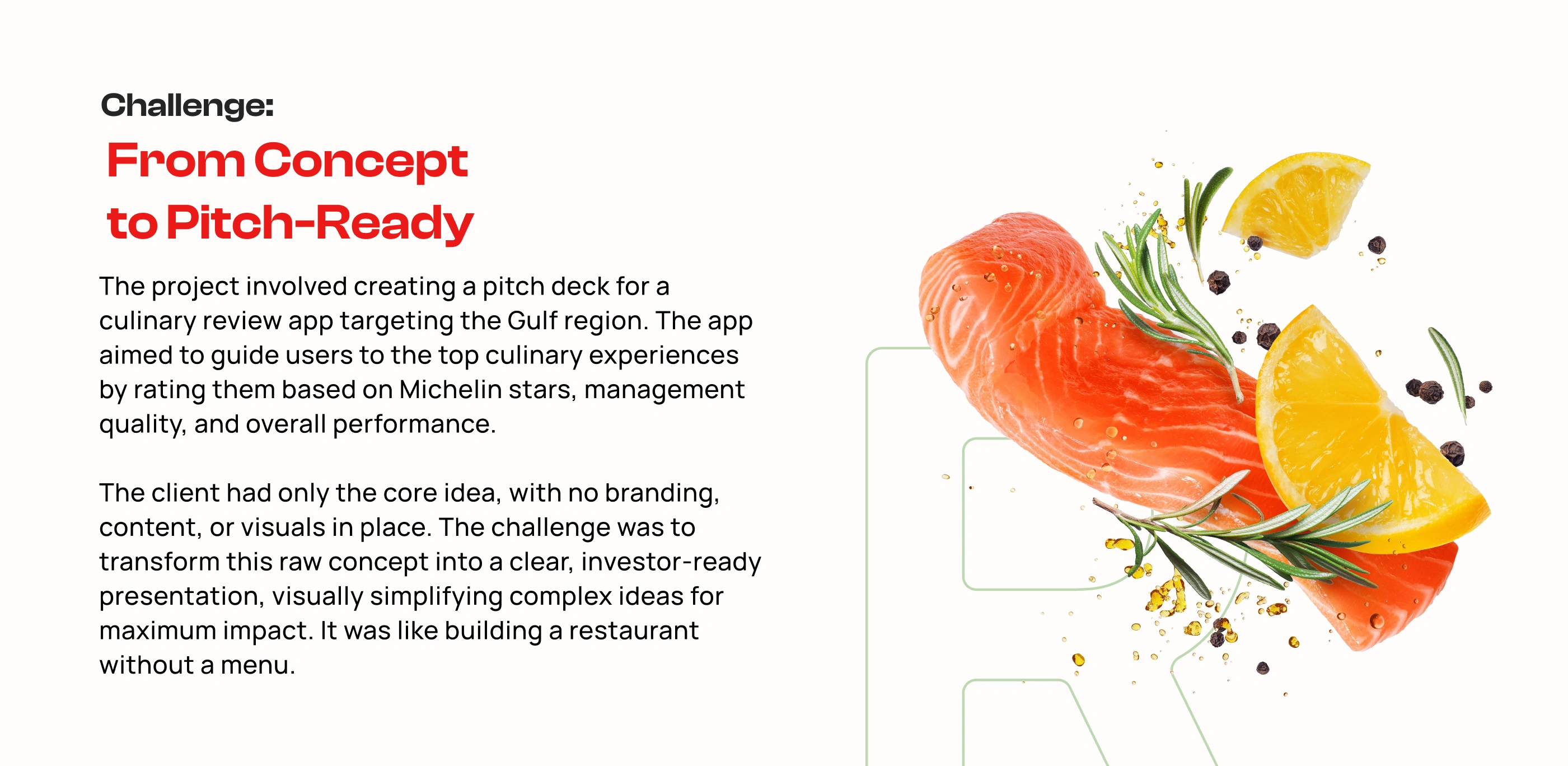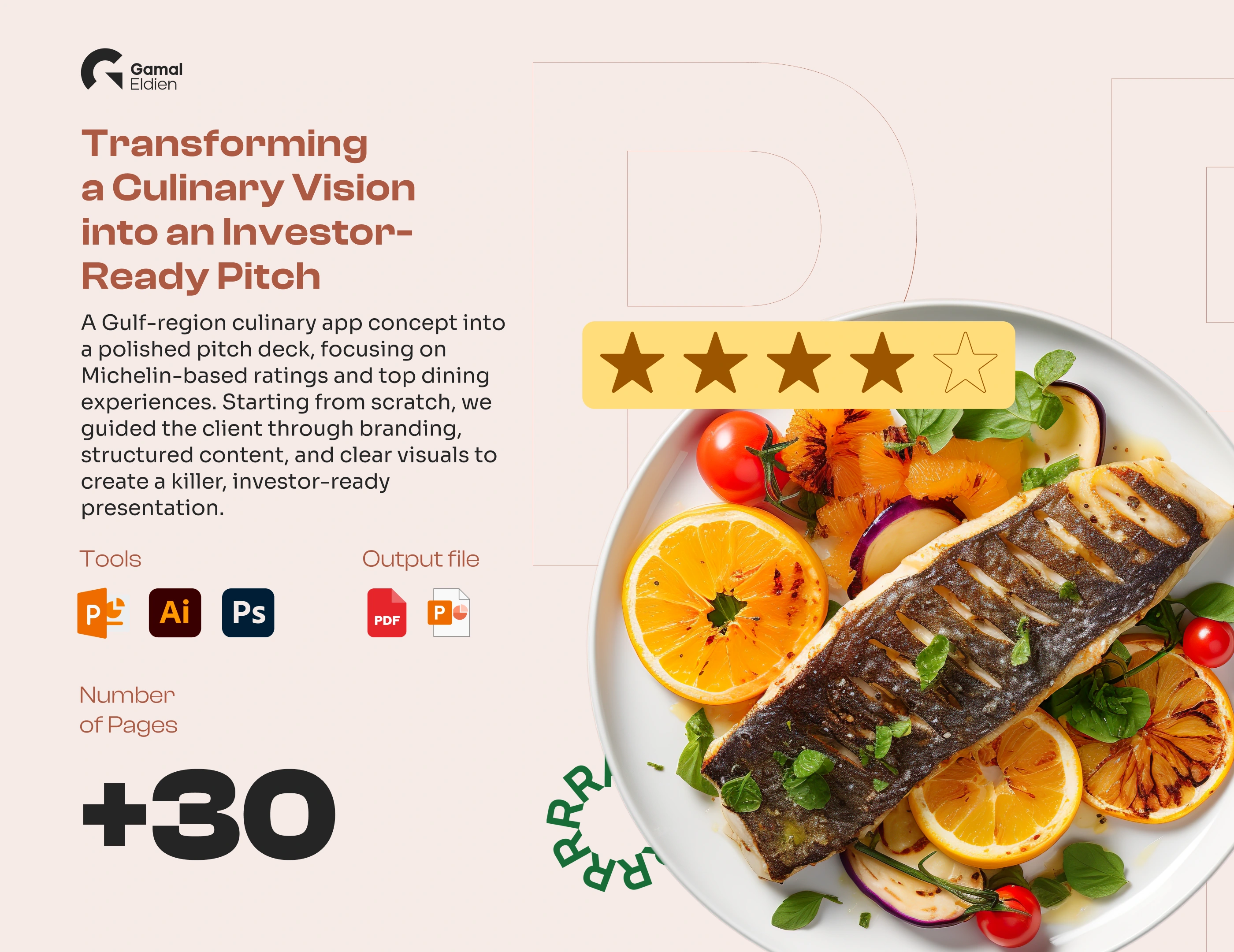 Gulf culinary app pitch deck built from scratch with branding, structure, and visuals, highlighting Michelin ratings for investors.