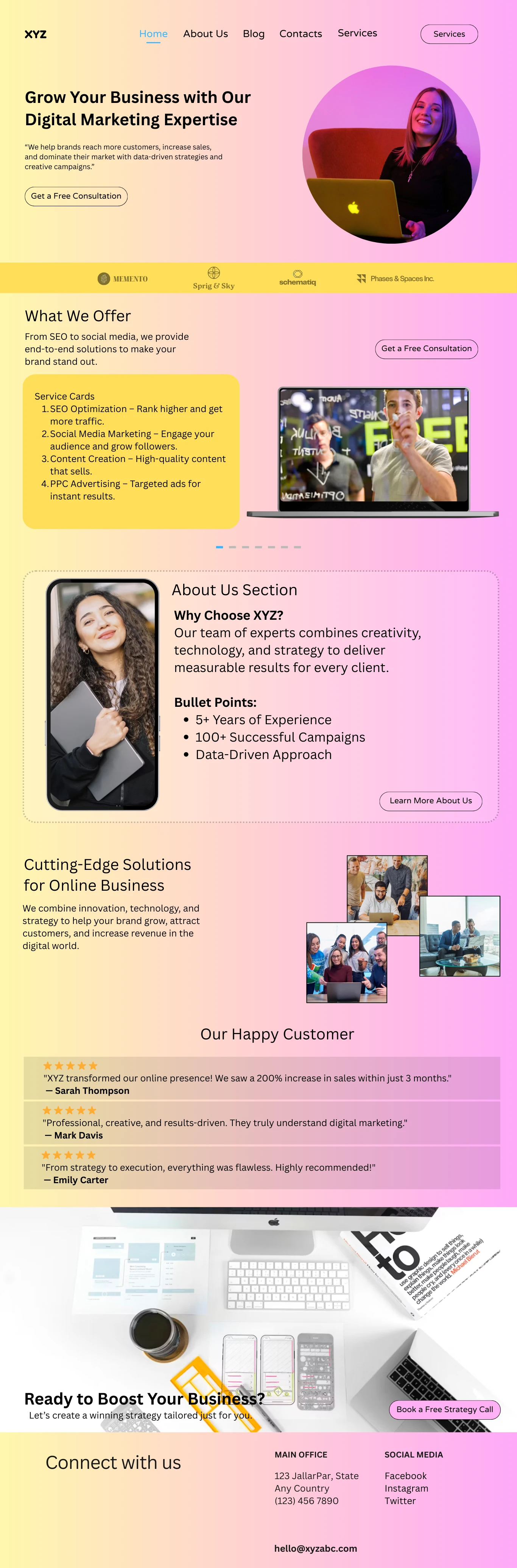 This project showcases the complete design of a modern, vibrant, and user-friendly website for XYZ, a digital marketing agency. The goal was to create an engaging online presence that communicates expertise, builds trust, and attracts potential clients.