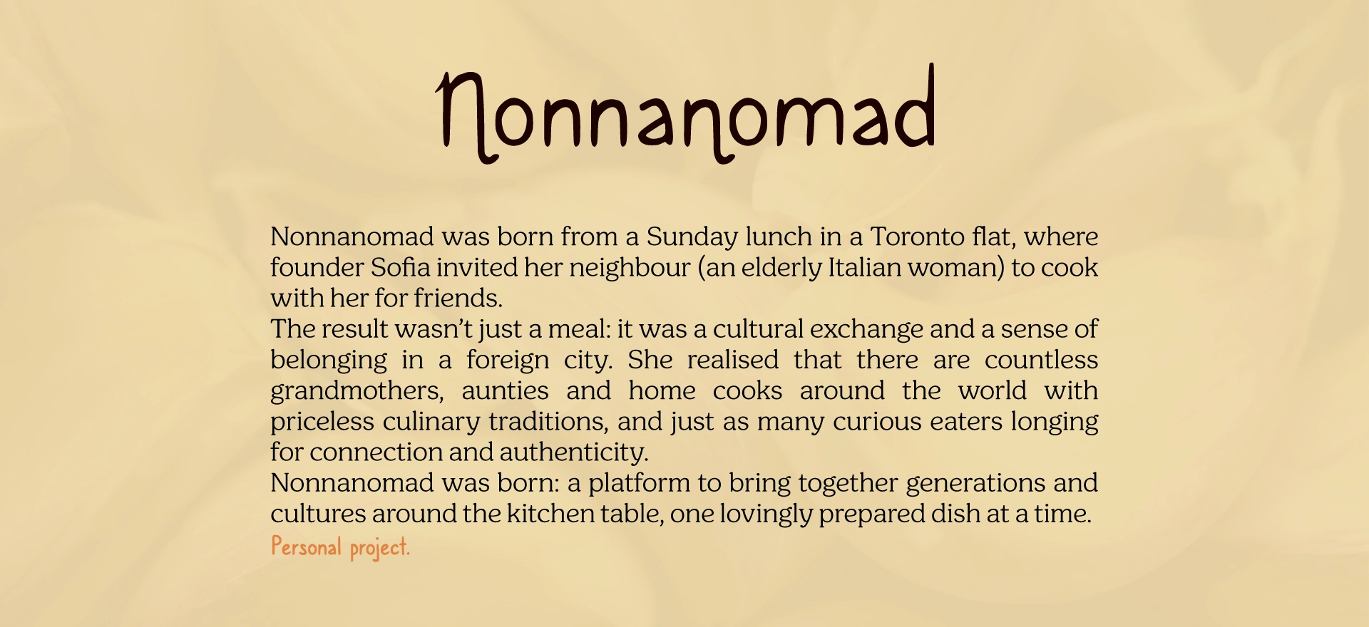 NonnaNomad is a fictive cultural food experience service that connects retired grandmothers with people who want a home-cooked meal and a meaningful exchange.