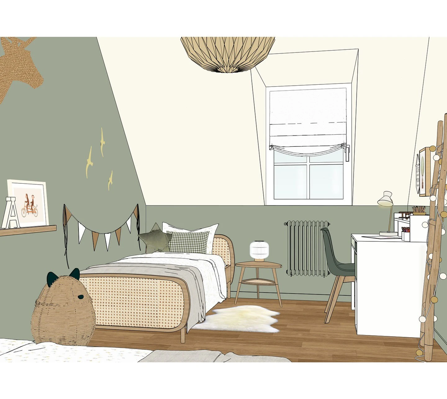 This room was designed to support the child’s daily life and growth. With soft colors, simple furniture, and playful details, the space is both restful and fun.