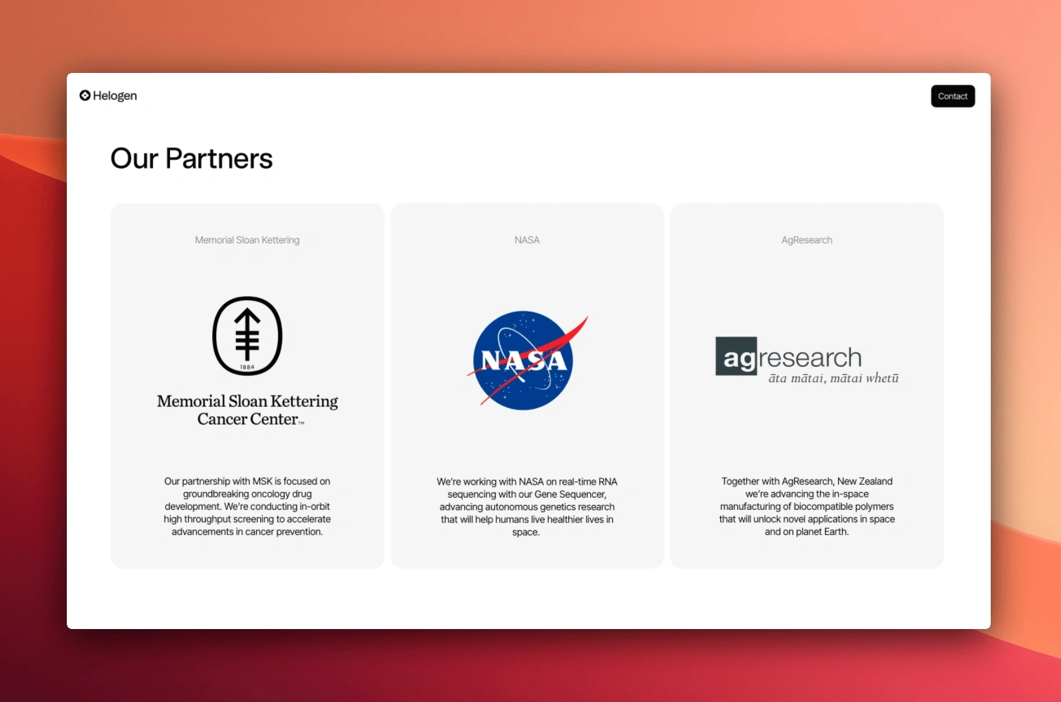This project exemplifies how a minimalist design approach, combined with thoughtful functionality, can effectively represent a pioneering company like Helogen. By focusing on clean aesthetics, user-centric interactions, and dynamic content capabilities, the website serves as a digital extension of Helogen's commitment to innovation and excellence in space biology.