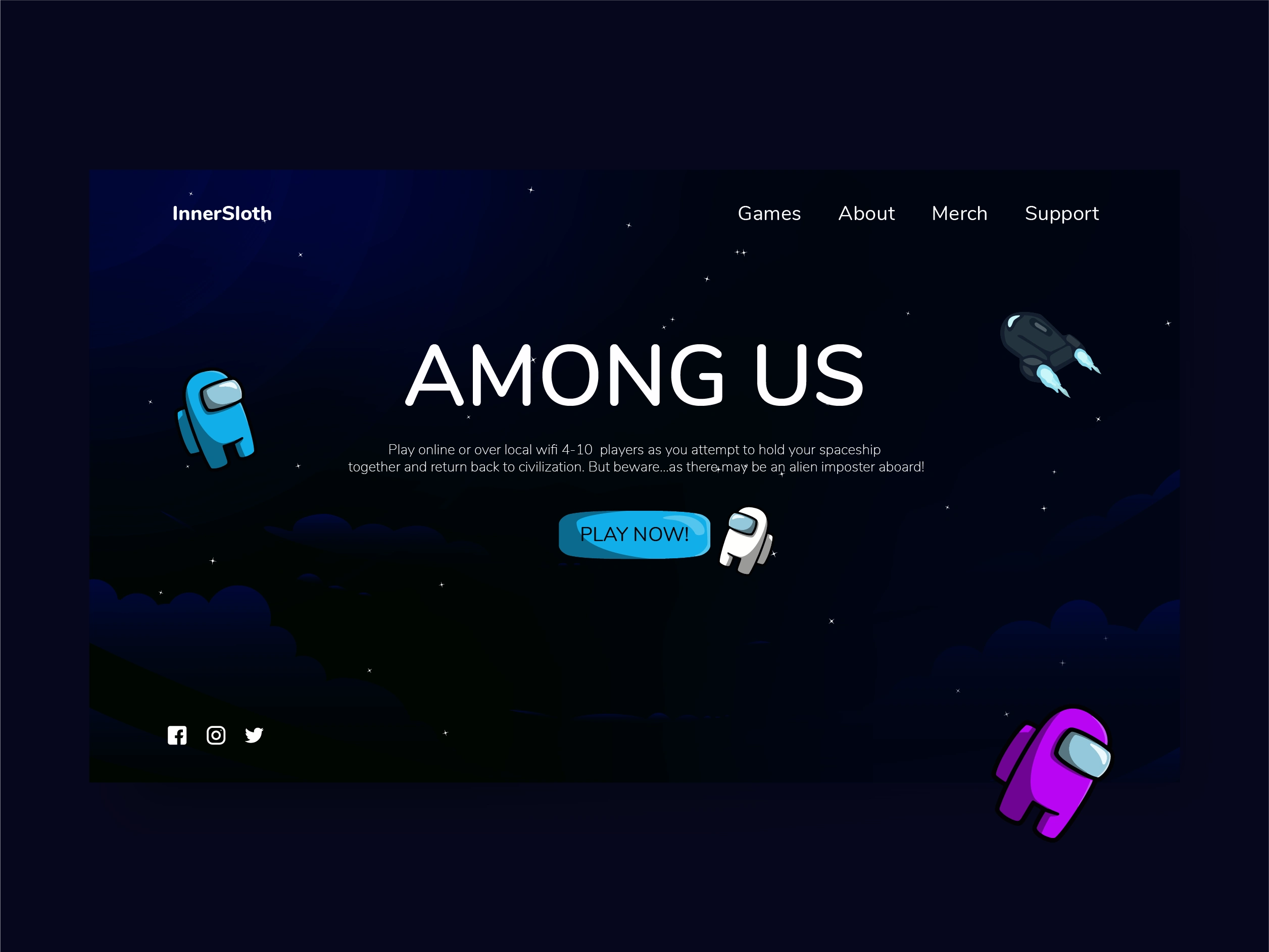 A playful homepage concept inspired by Among Us, designed to promote the game in a clean, community-driven layout.