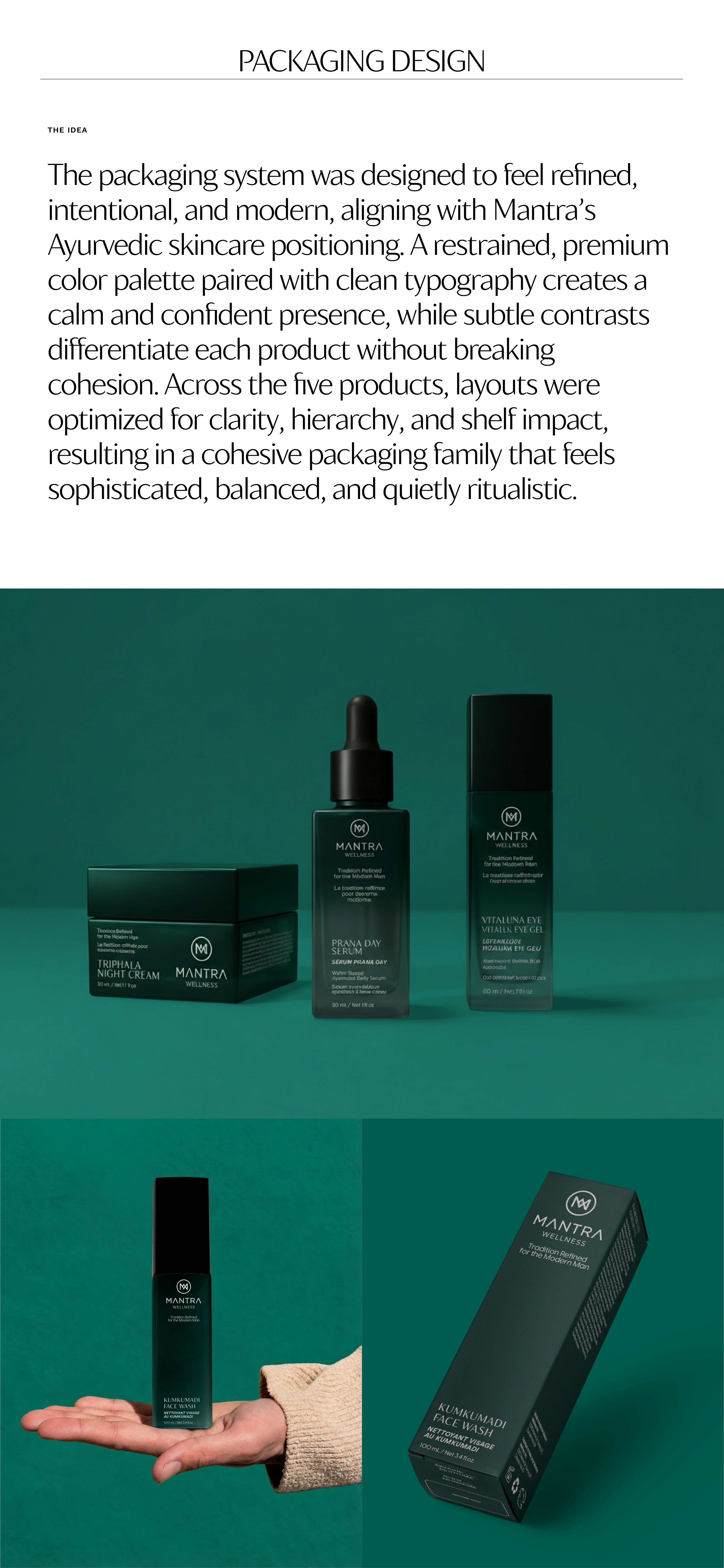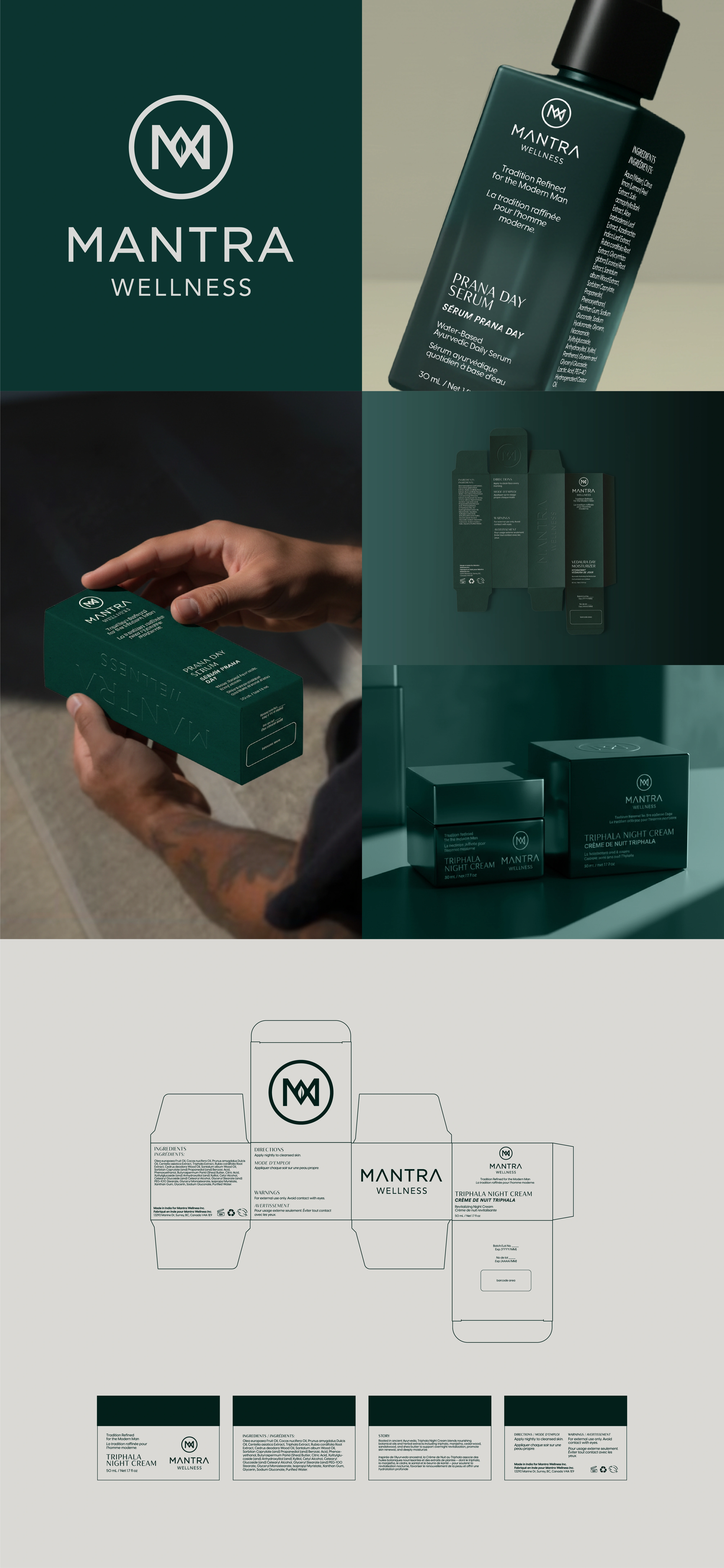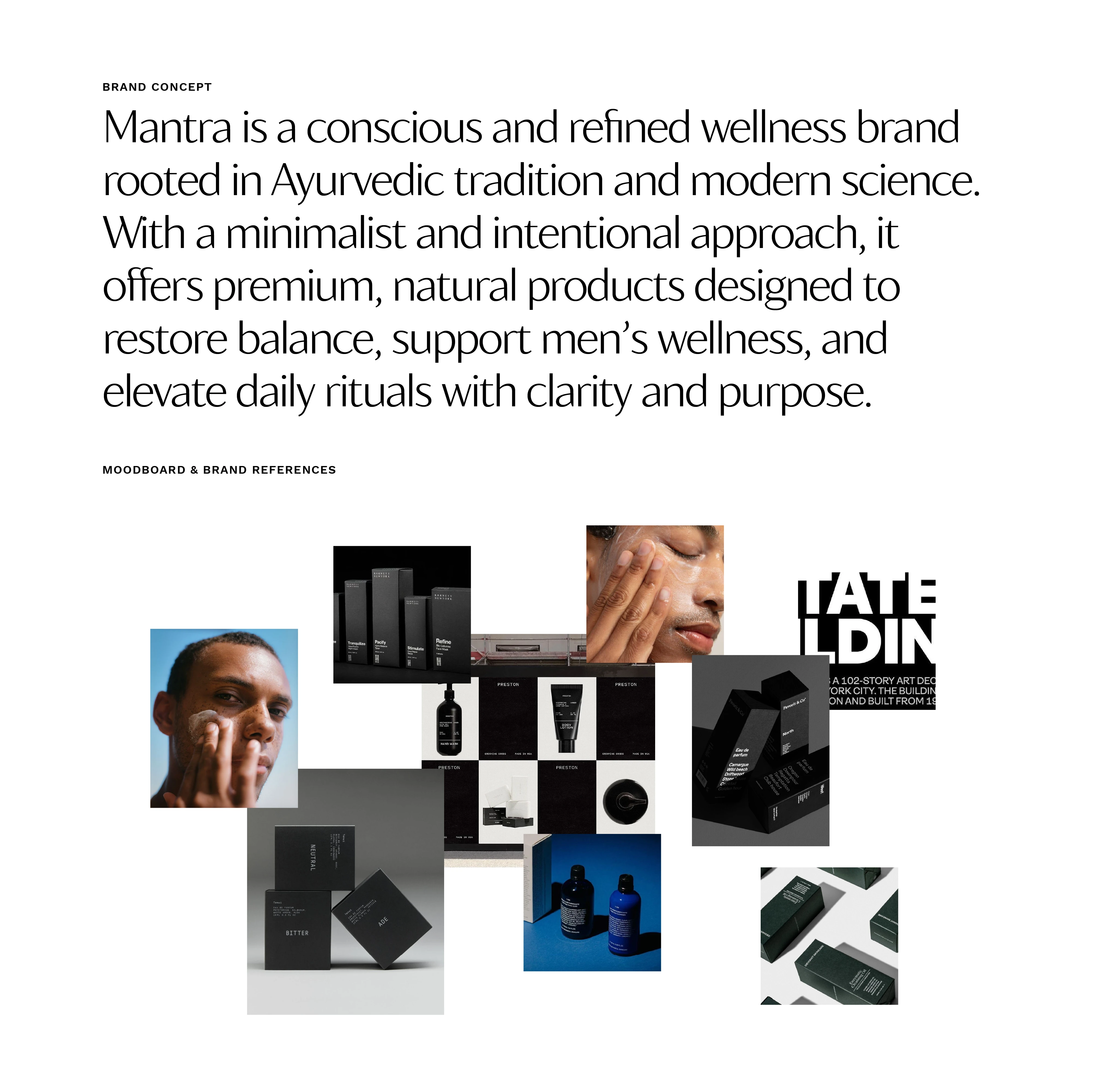 Logo redesign, packaging and label design for Mantra, a conscious and refined wellness brand rooted in Ayurvedic tradition and modern science targeted to men.