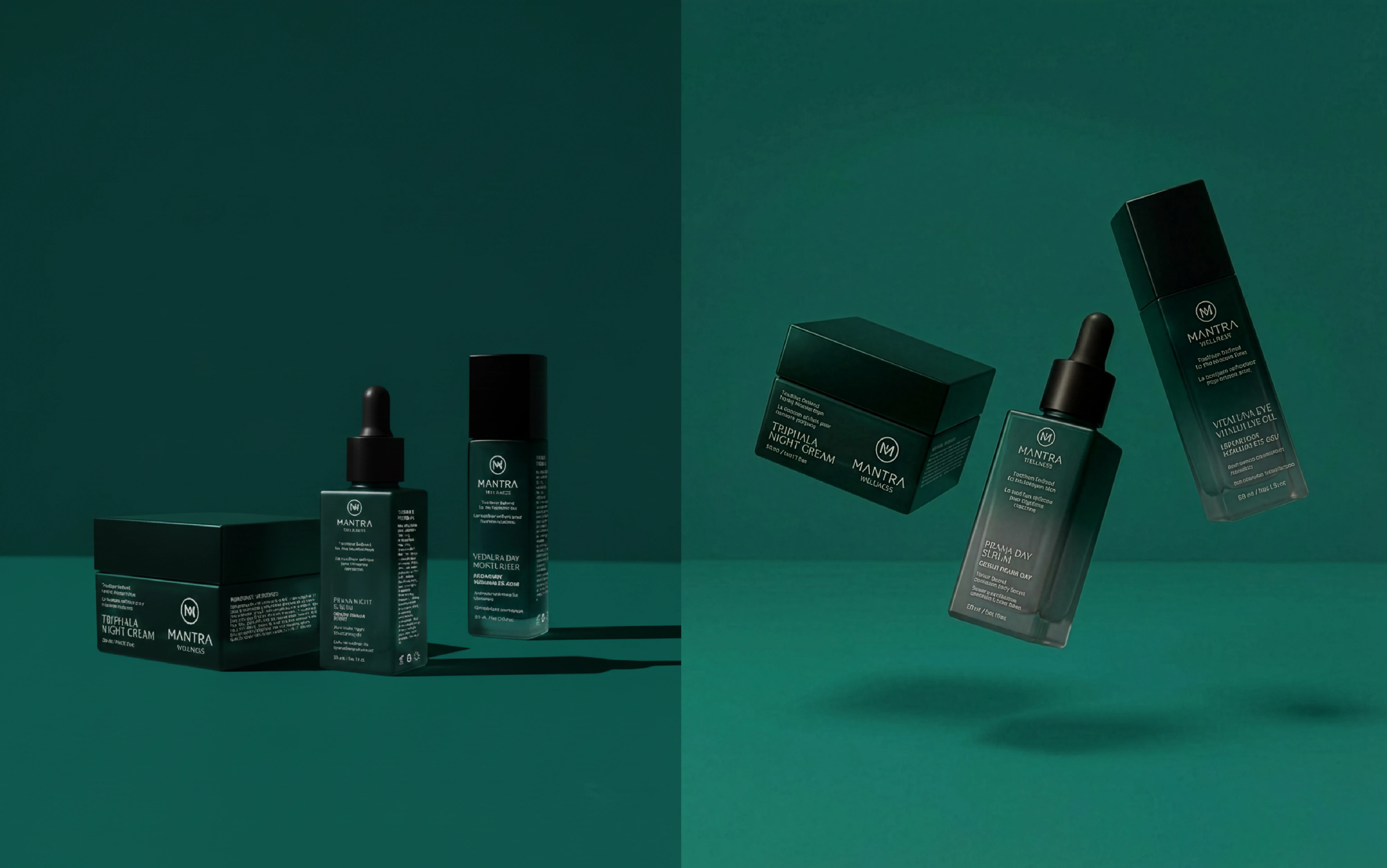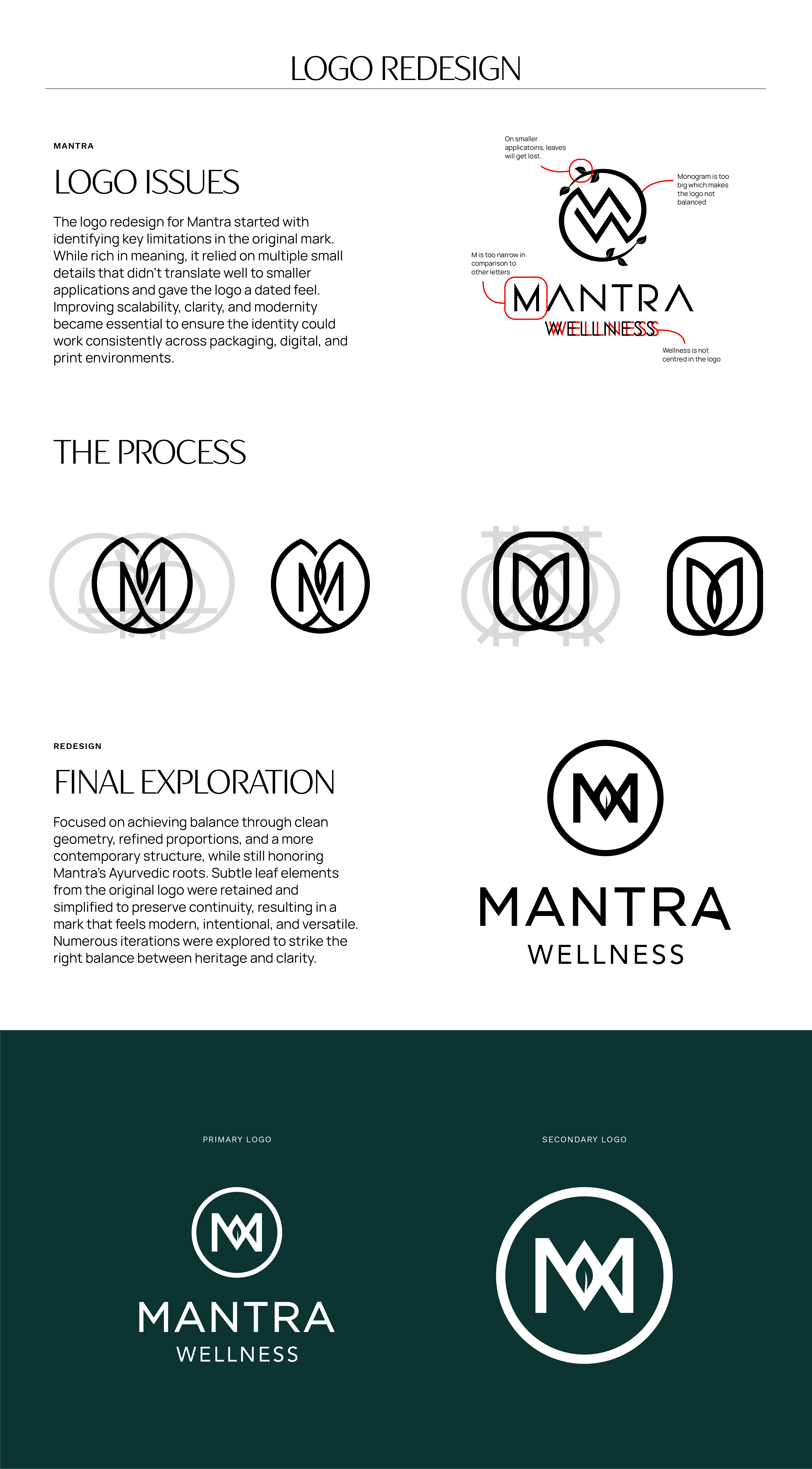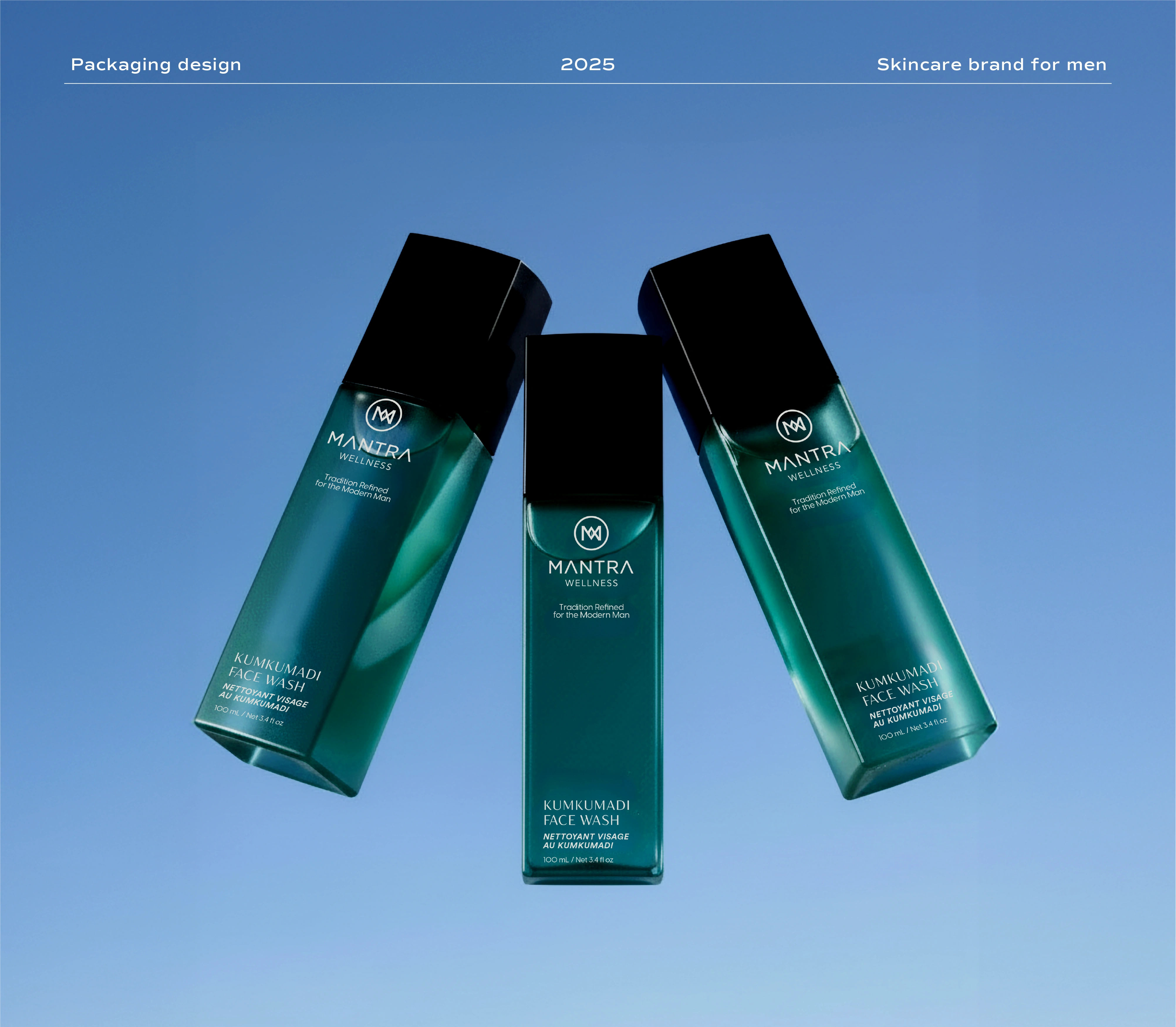 Logo redesign, packaging and label design for Mantra, a conscious and refined wellness brand rooted in Ayurvedic tradition and modern science targeted to men.