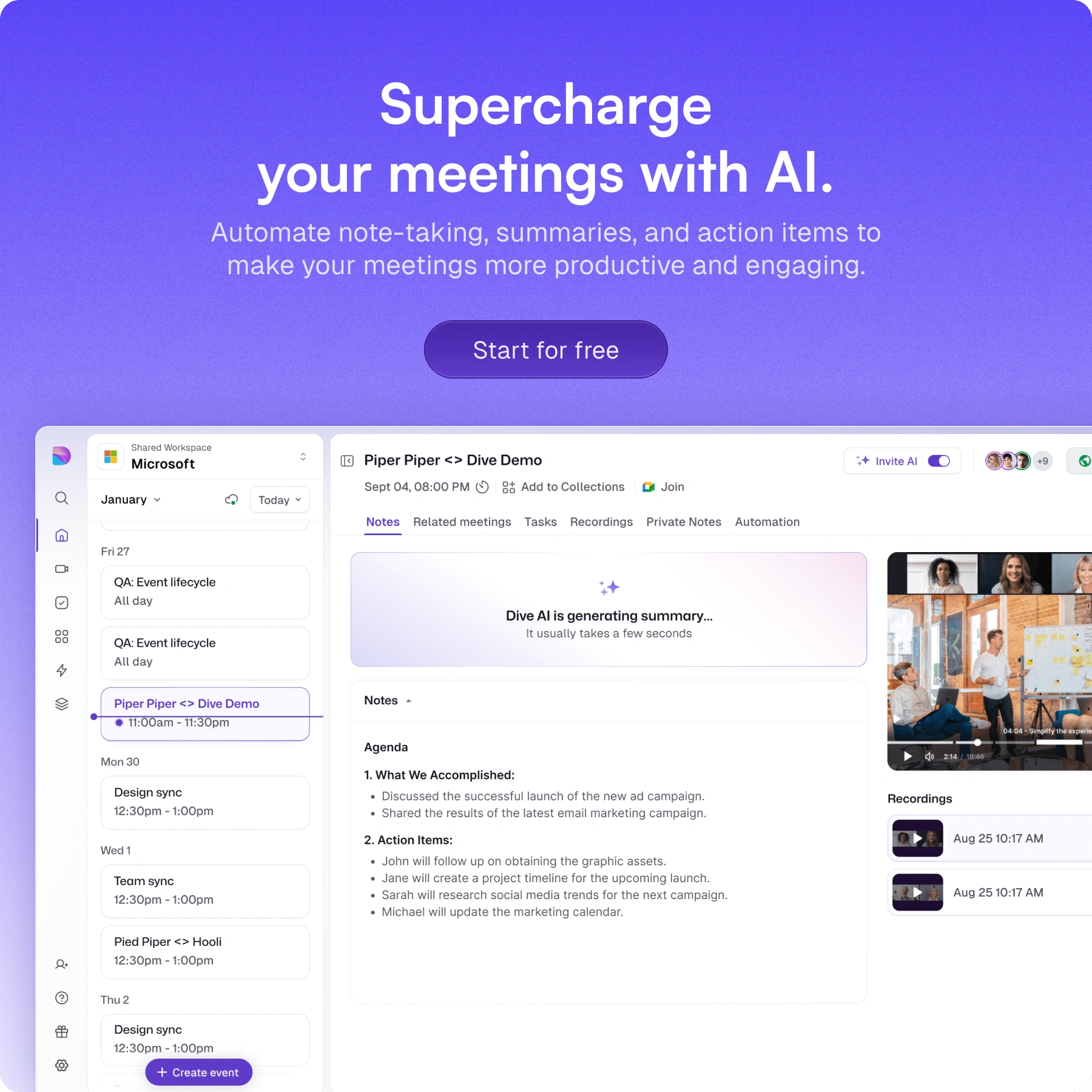 Dive uses AI to streamline meetings, automating tasks like note-taking, action item creation, and follow-ups, so you can focus on what matters most.