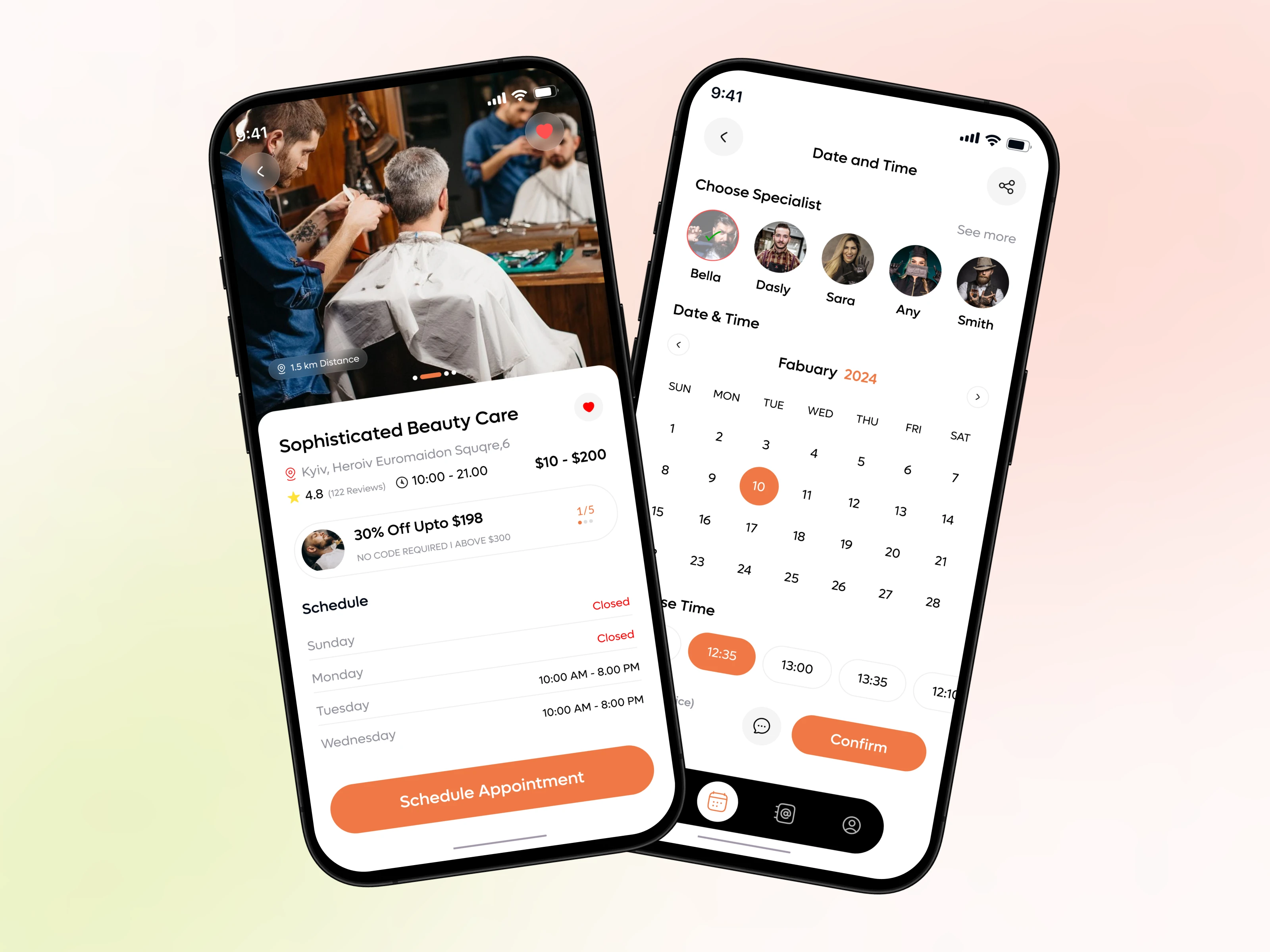 The Calendar Book Screen provides a holistic view of all appointments. With a modern monthly calendar layout, users can easily identify booked and available slots. Dive into specific days to view detailed appointment information, including time, service, and stylist. A floating action button adds efficiency, making scheduling a breeze.